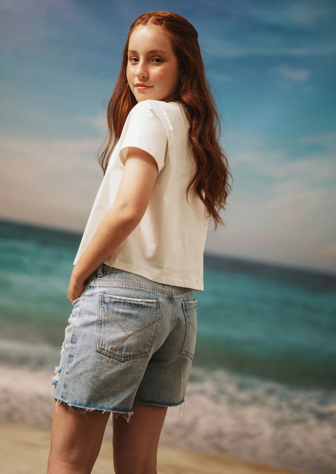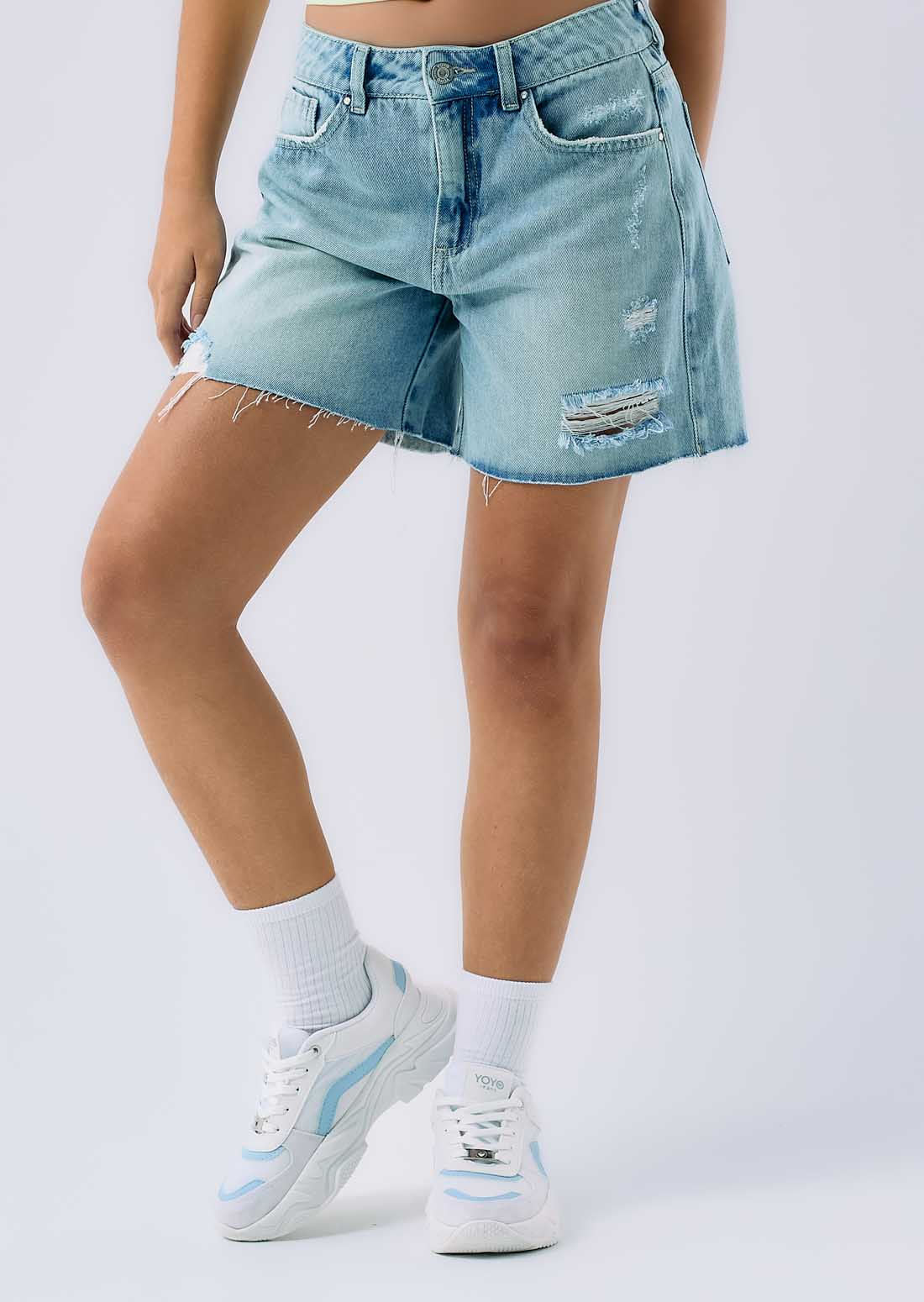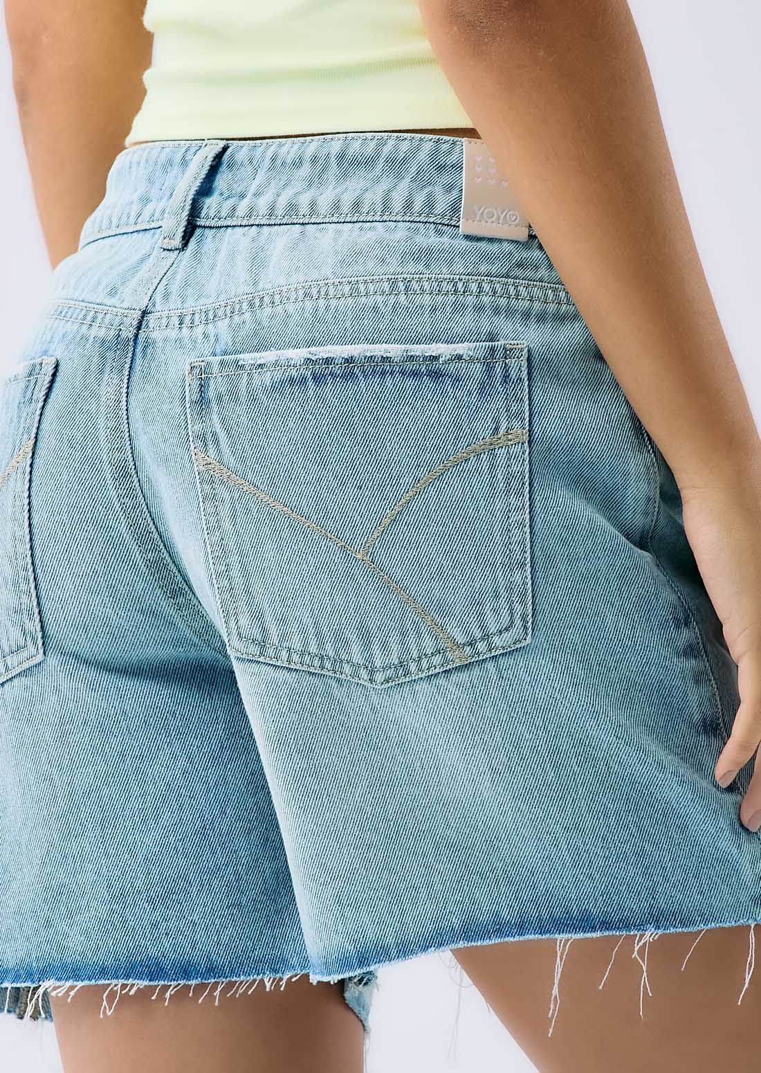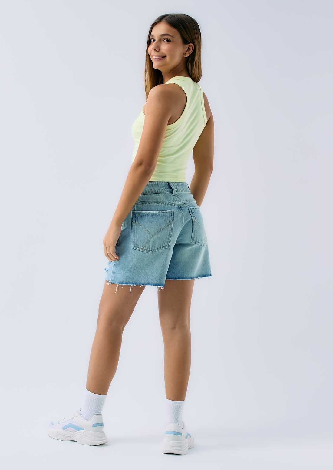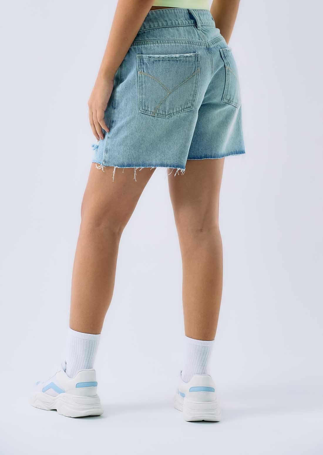 Bermuda tiro alto, lavado claro, fondo entero, bolsillos funcionales y elástico en cintura para jóvenes.