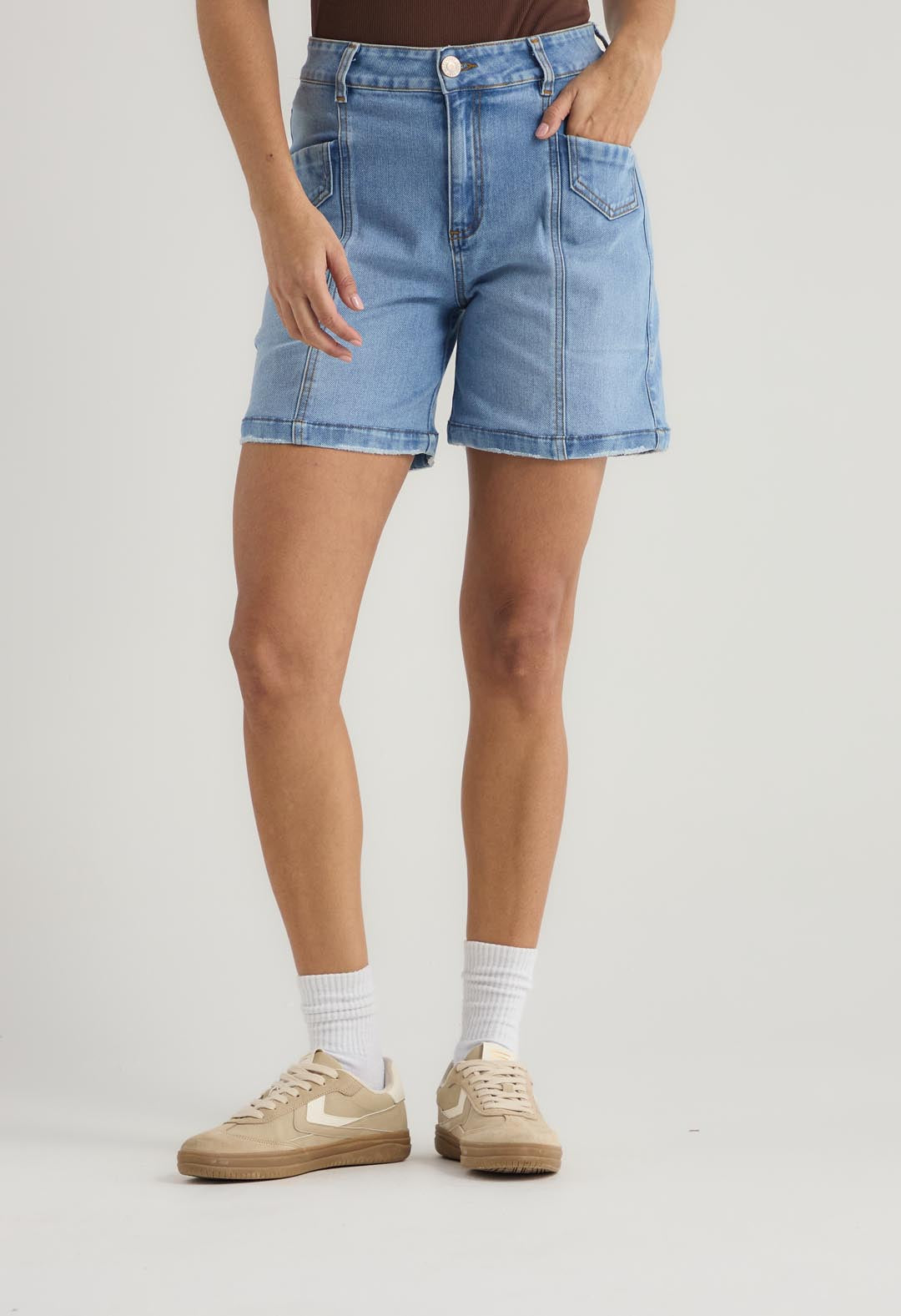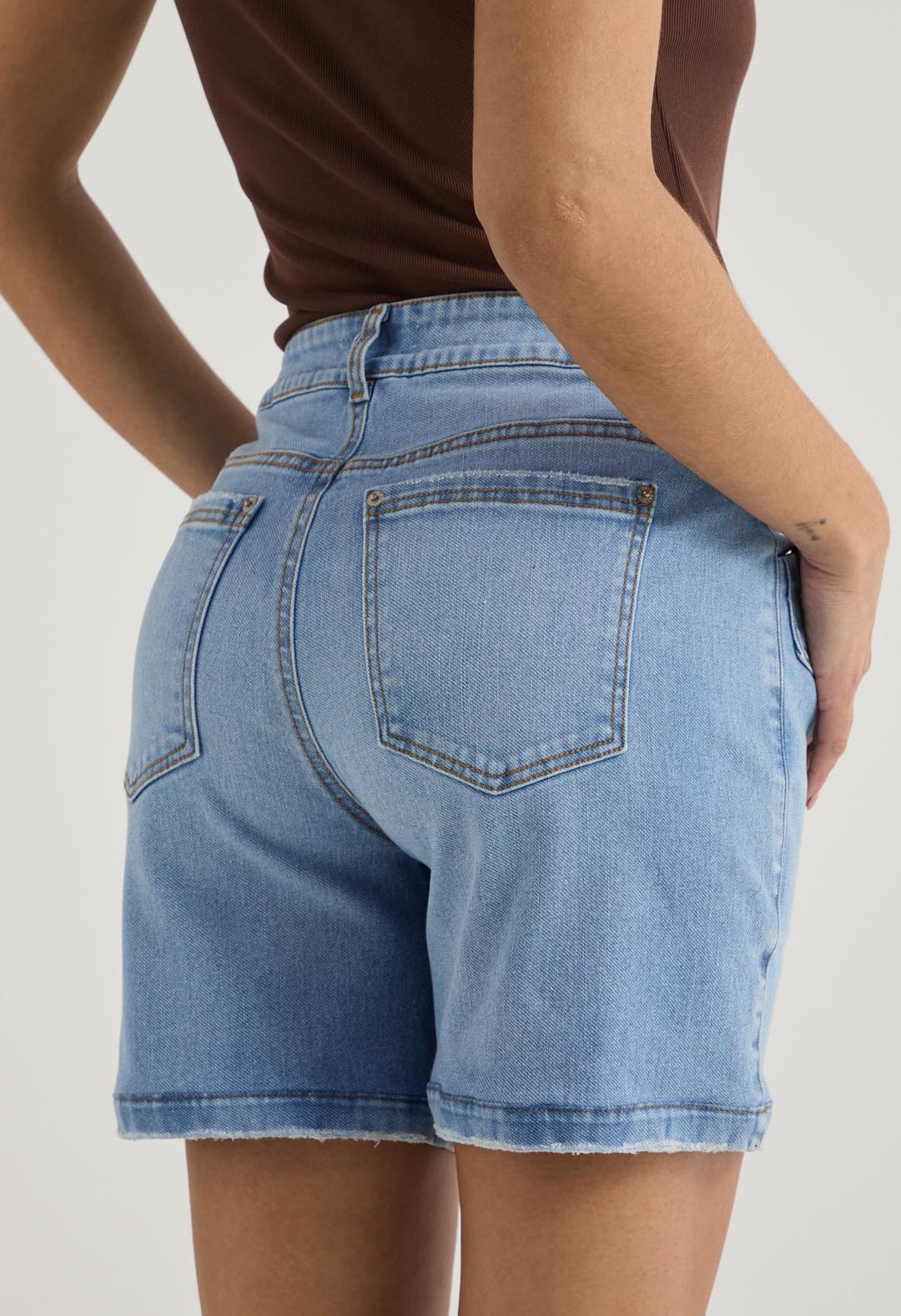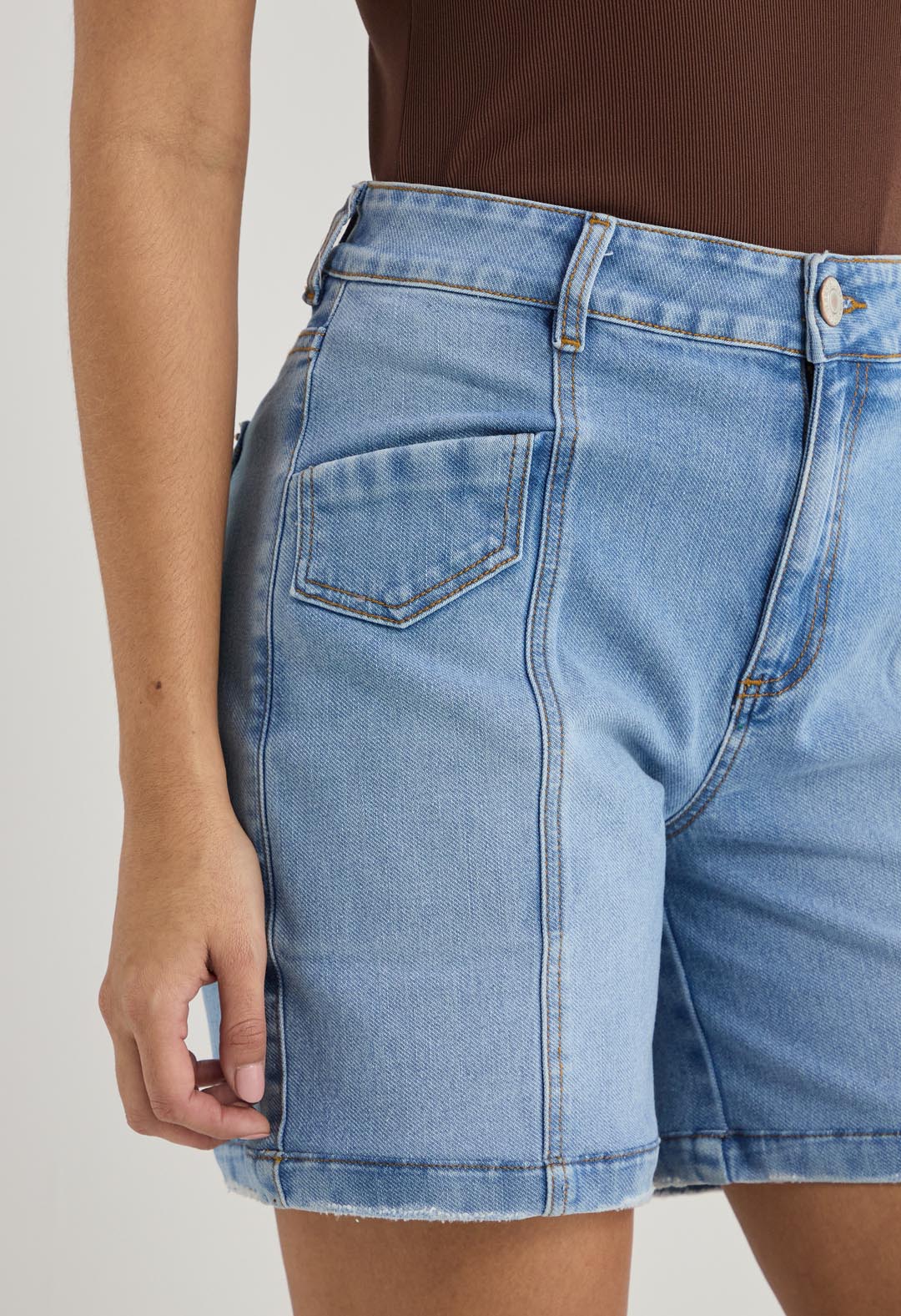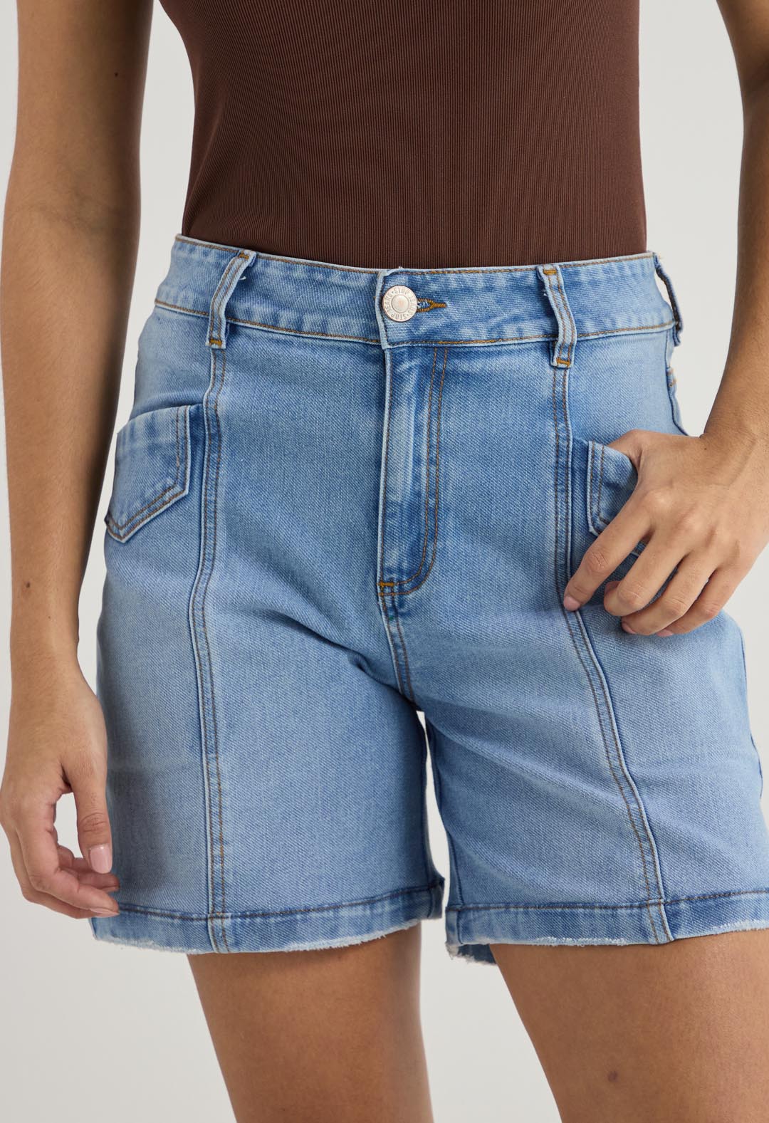 Bermuda tiro alto, lavado medio, con cortes en frente y fondo entero para mujer.