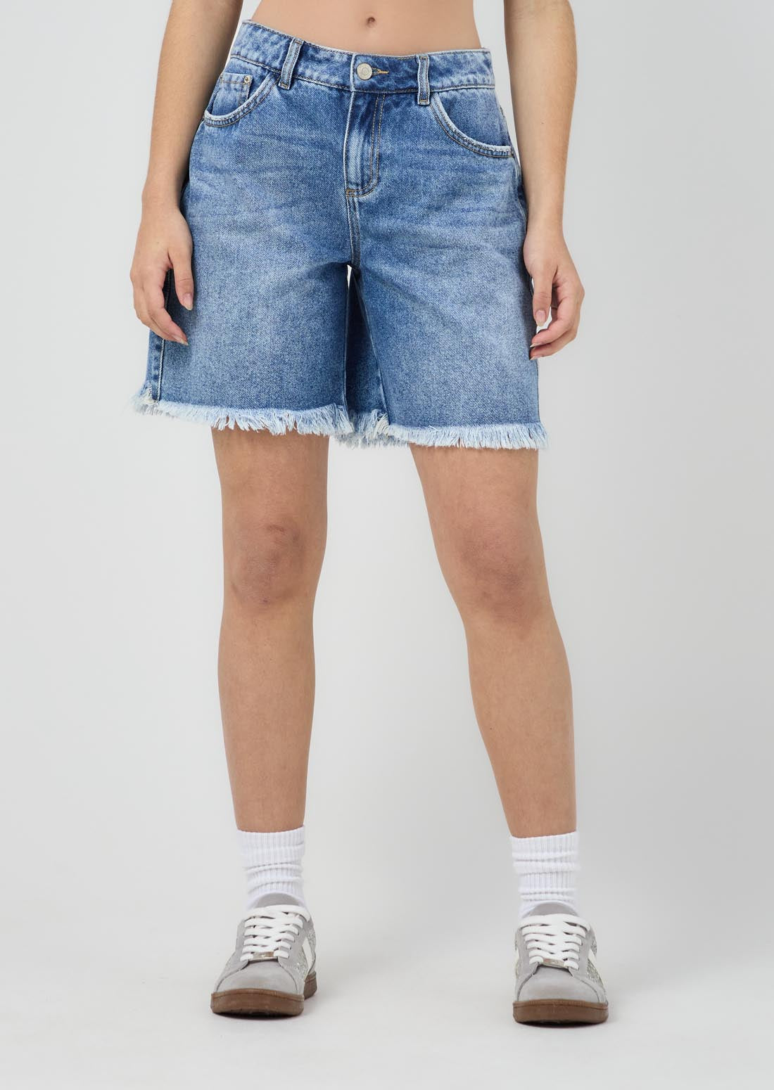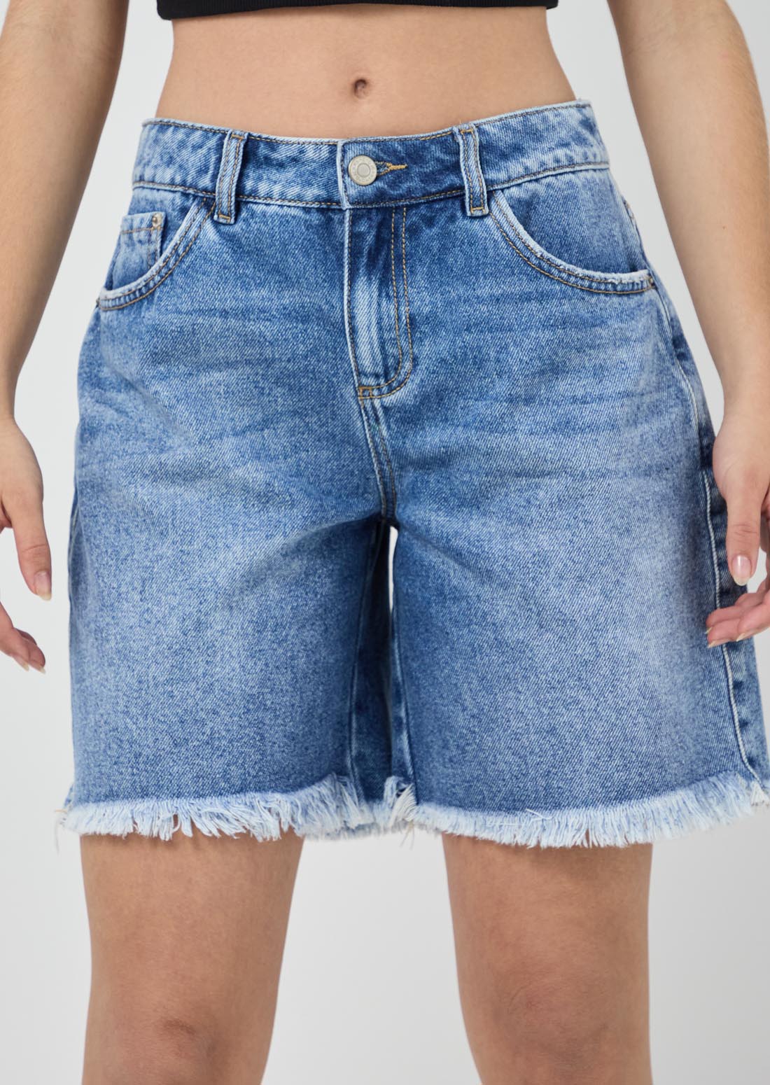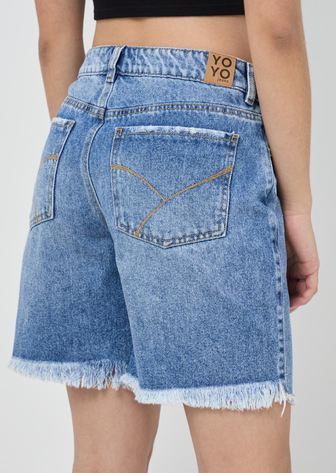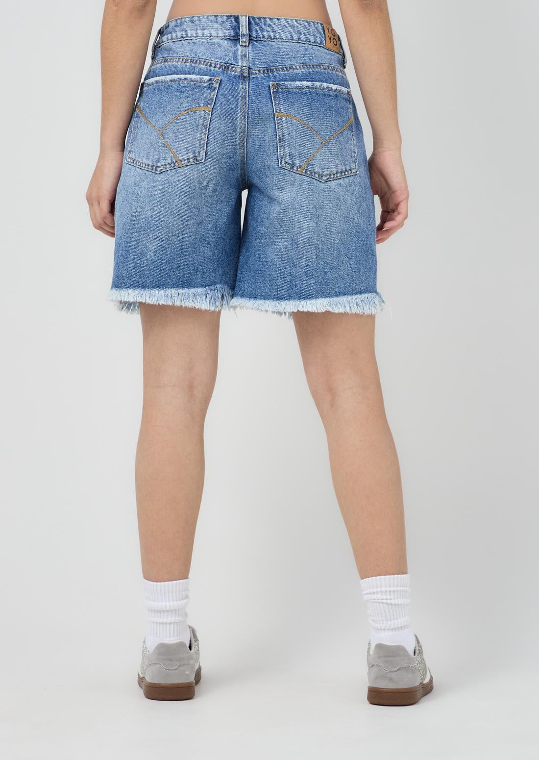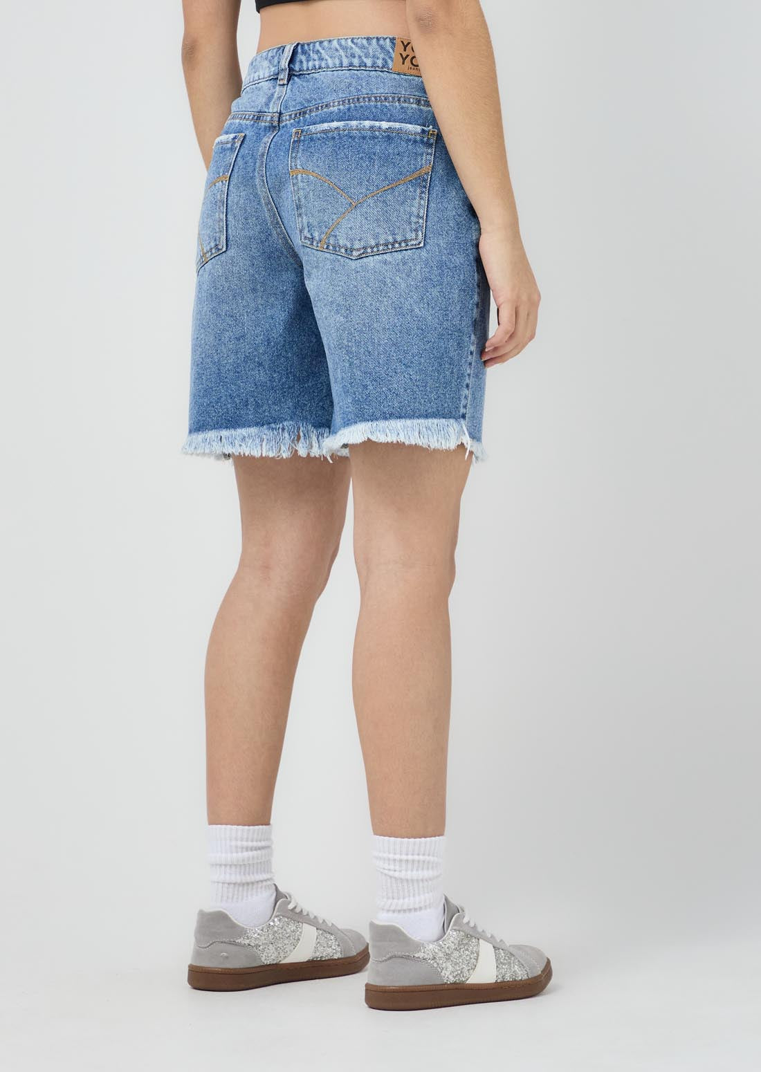 Bermuda tiro medio, lavado medio, con desgaste en la bota y en denim para jóvenes.