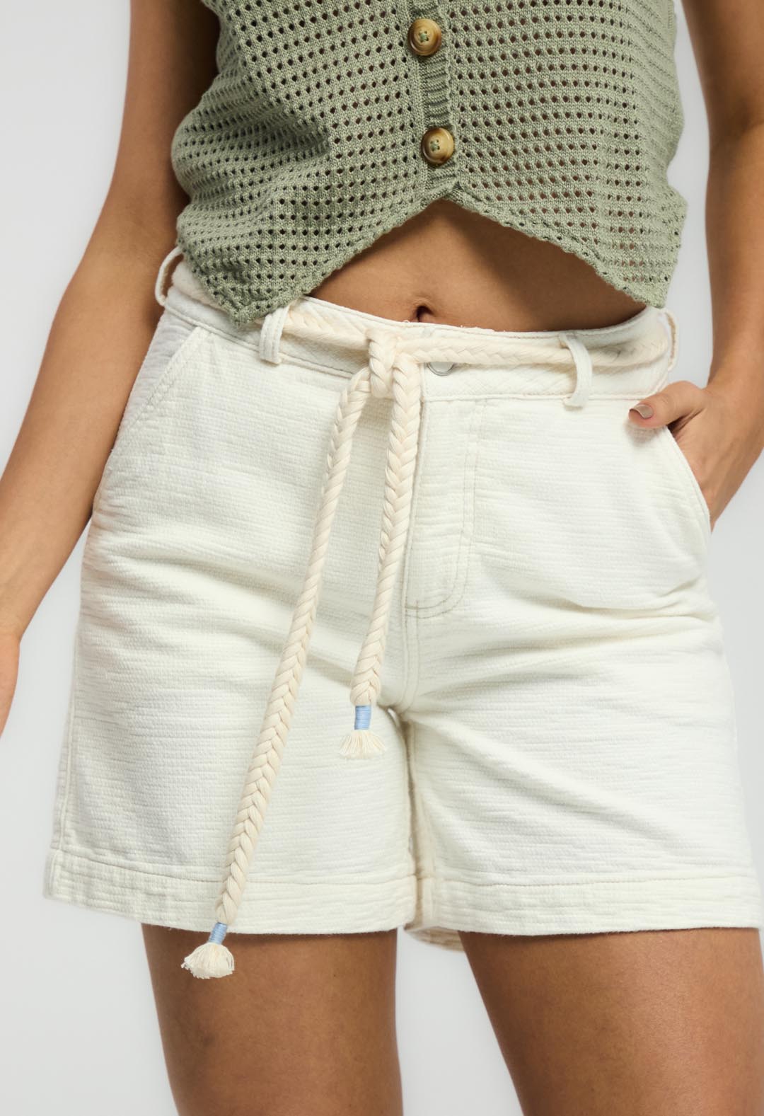Bermuda tiro alto, color marfil, en denim, con cordón en pretina y fondo entero para mujeres.