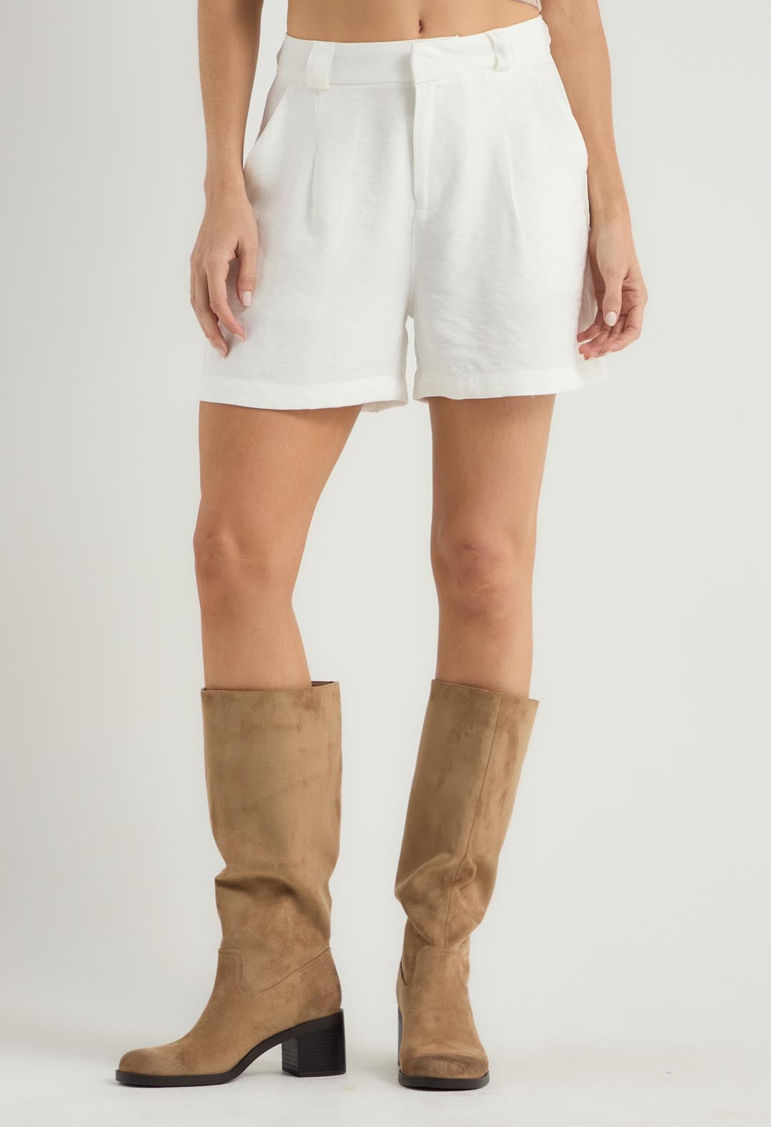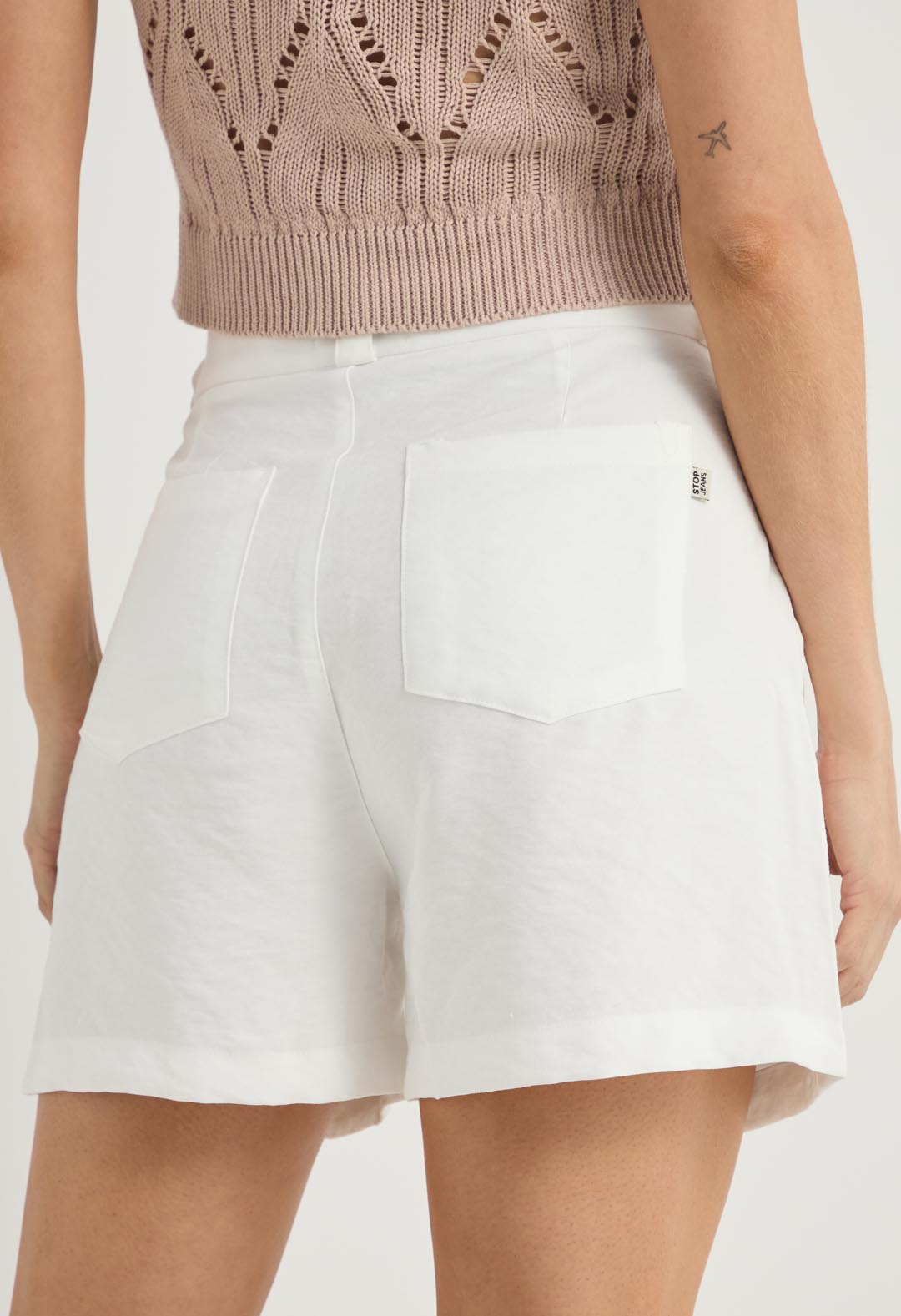 Bermuda tiro alto, color marfil, con bolsillos funcionales, con pinzas y fondo entero para mujeres.