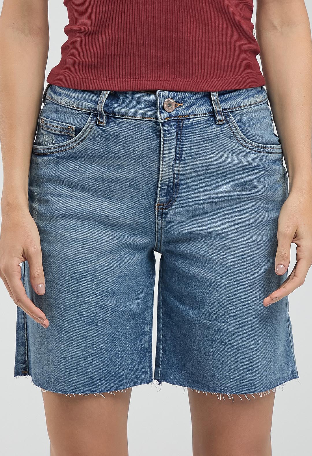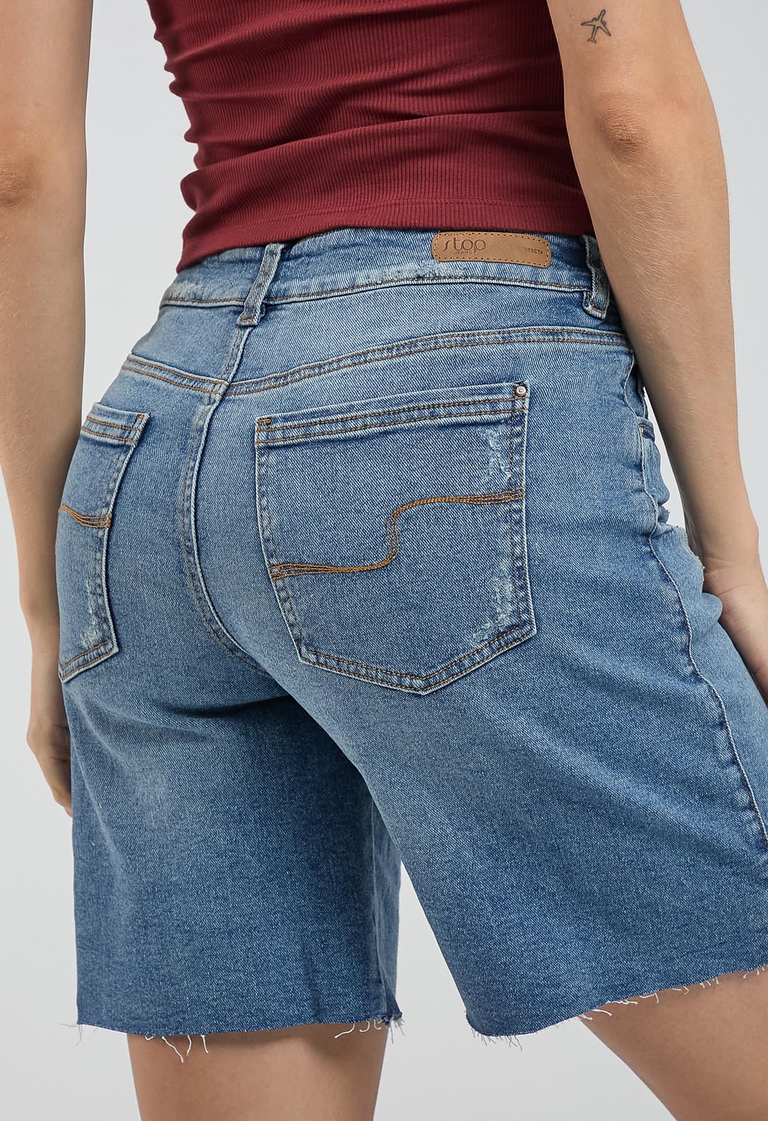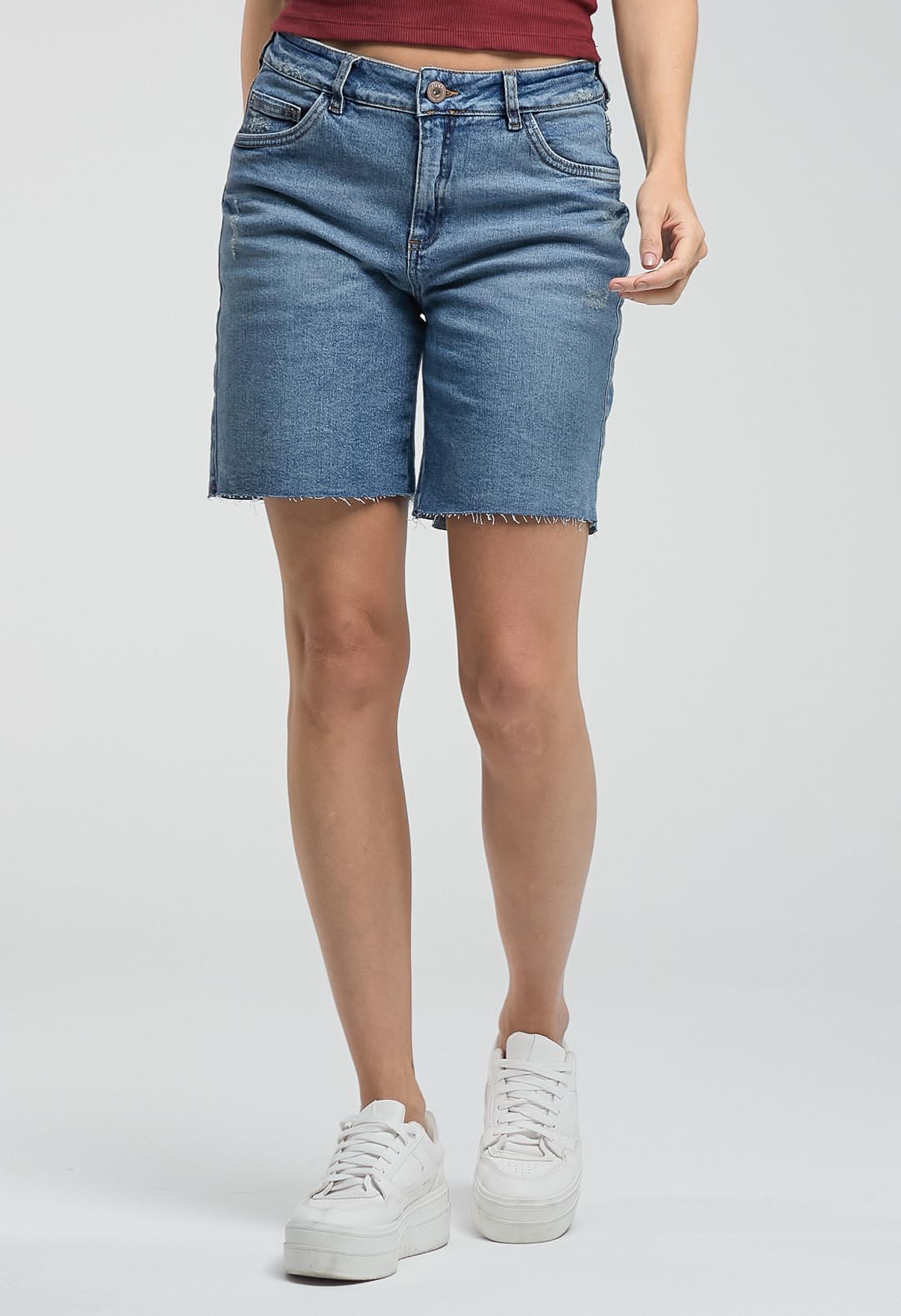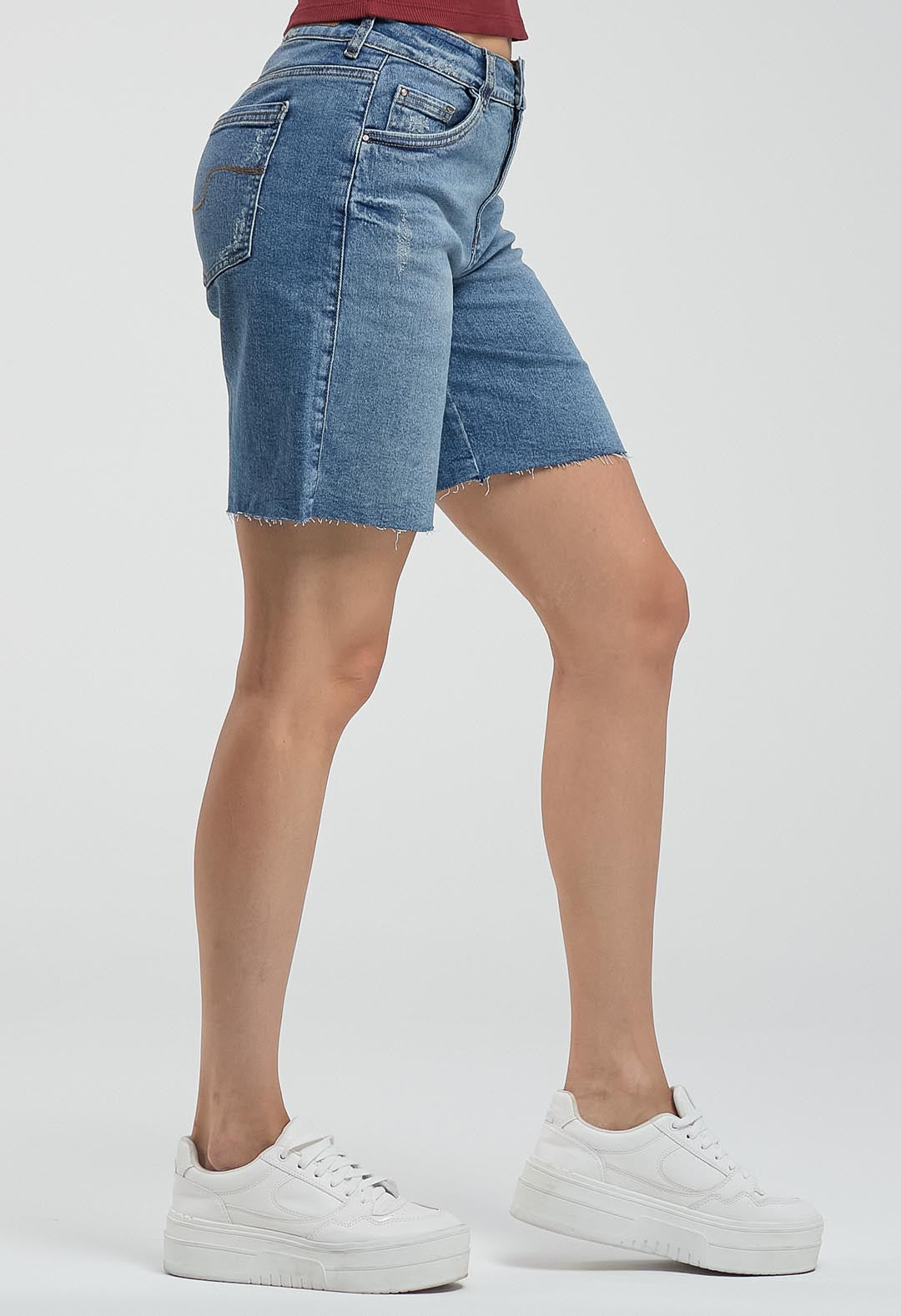 Bermuda tiro alto, lavado medio, bolsillos funcionales, fondo entero, ruedo al corte y desflecado para mujeres.