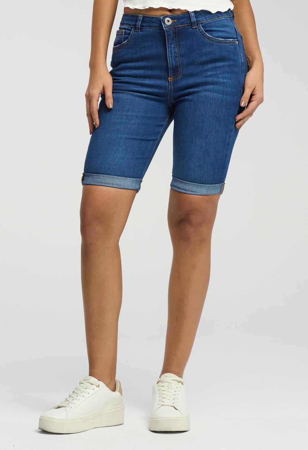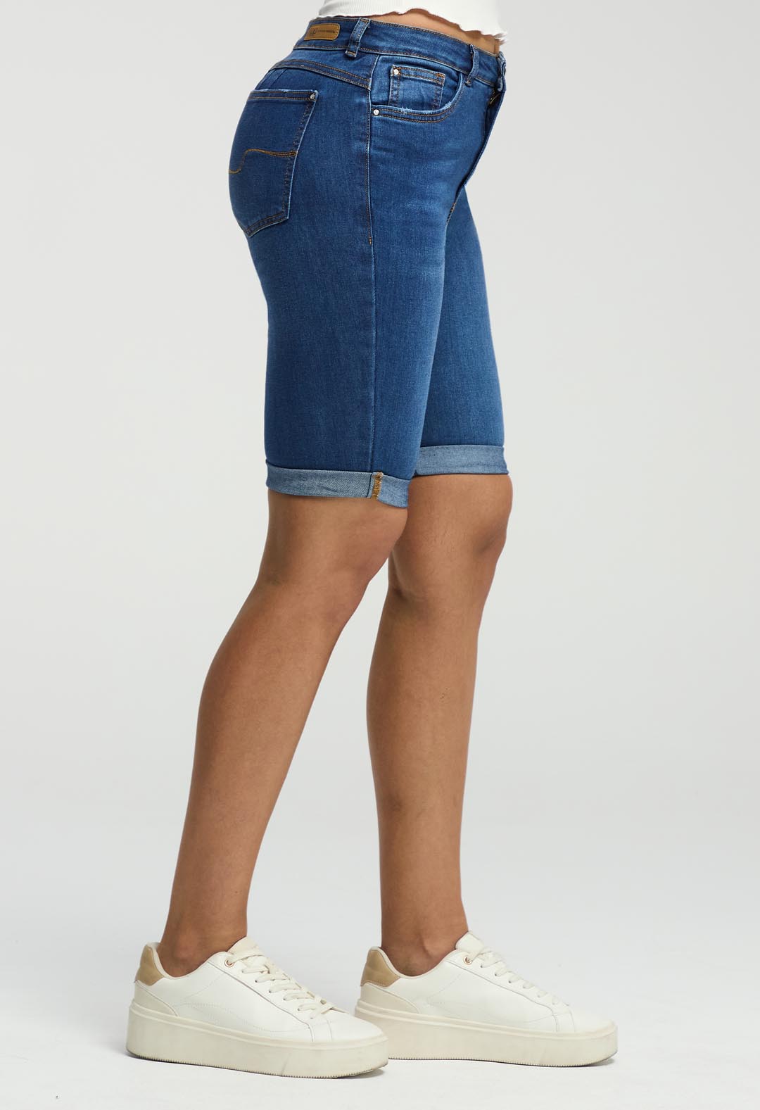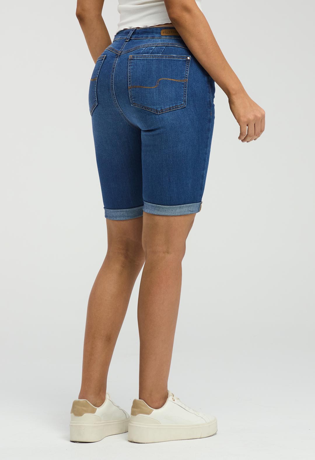 Bermuda tiro alto, lavado medio oscuro, bolsillos funcionales y fondo entero para mujeres.