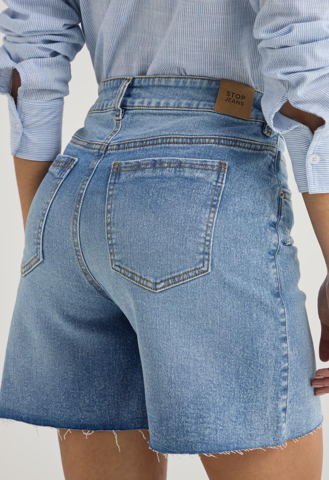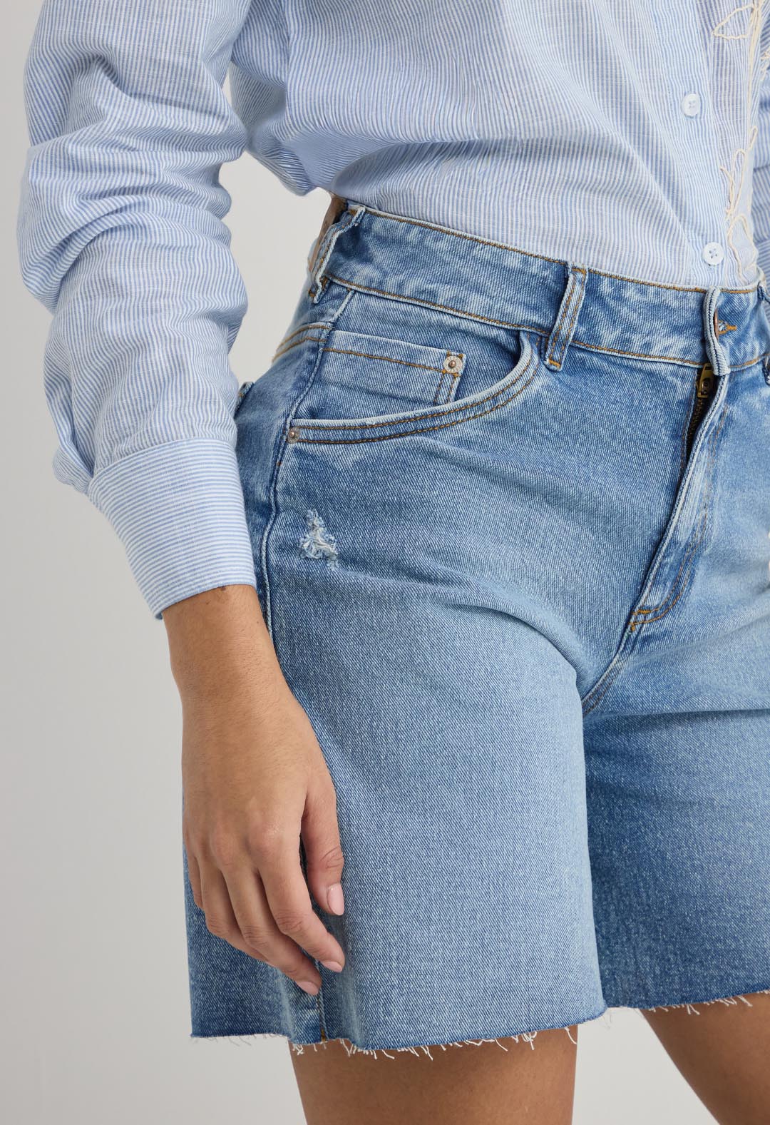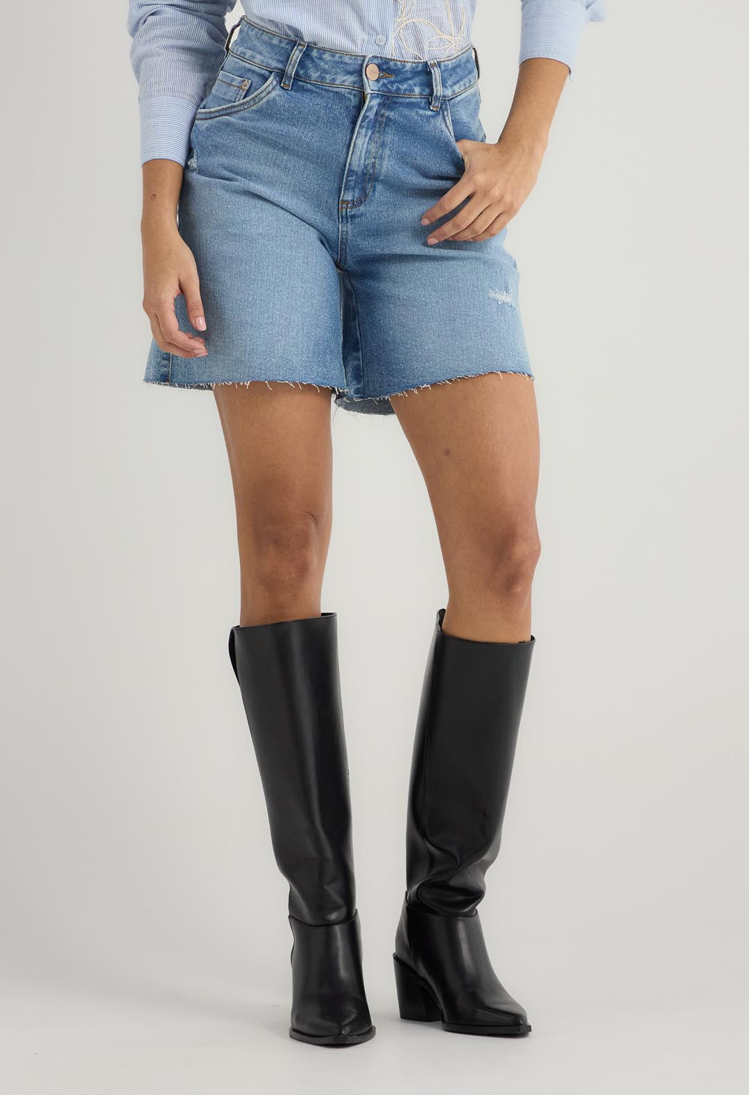 Bermuda tiro alto, lavado medio, fondo entero, en denim y con bolsillos para mujer.