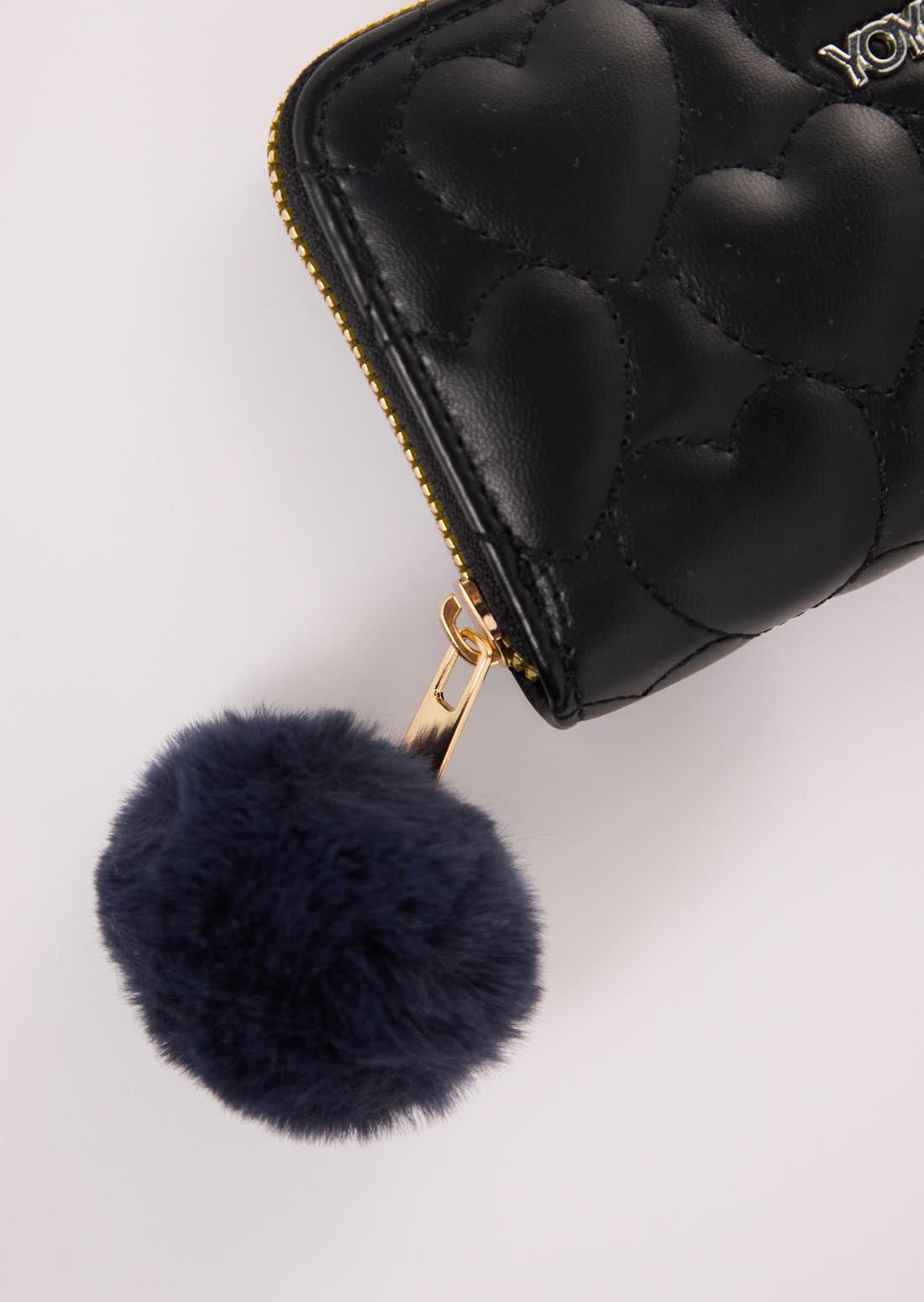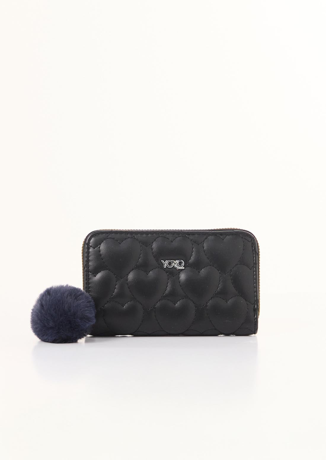 Billetera con cremallera, color negro y charm pompón.