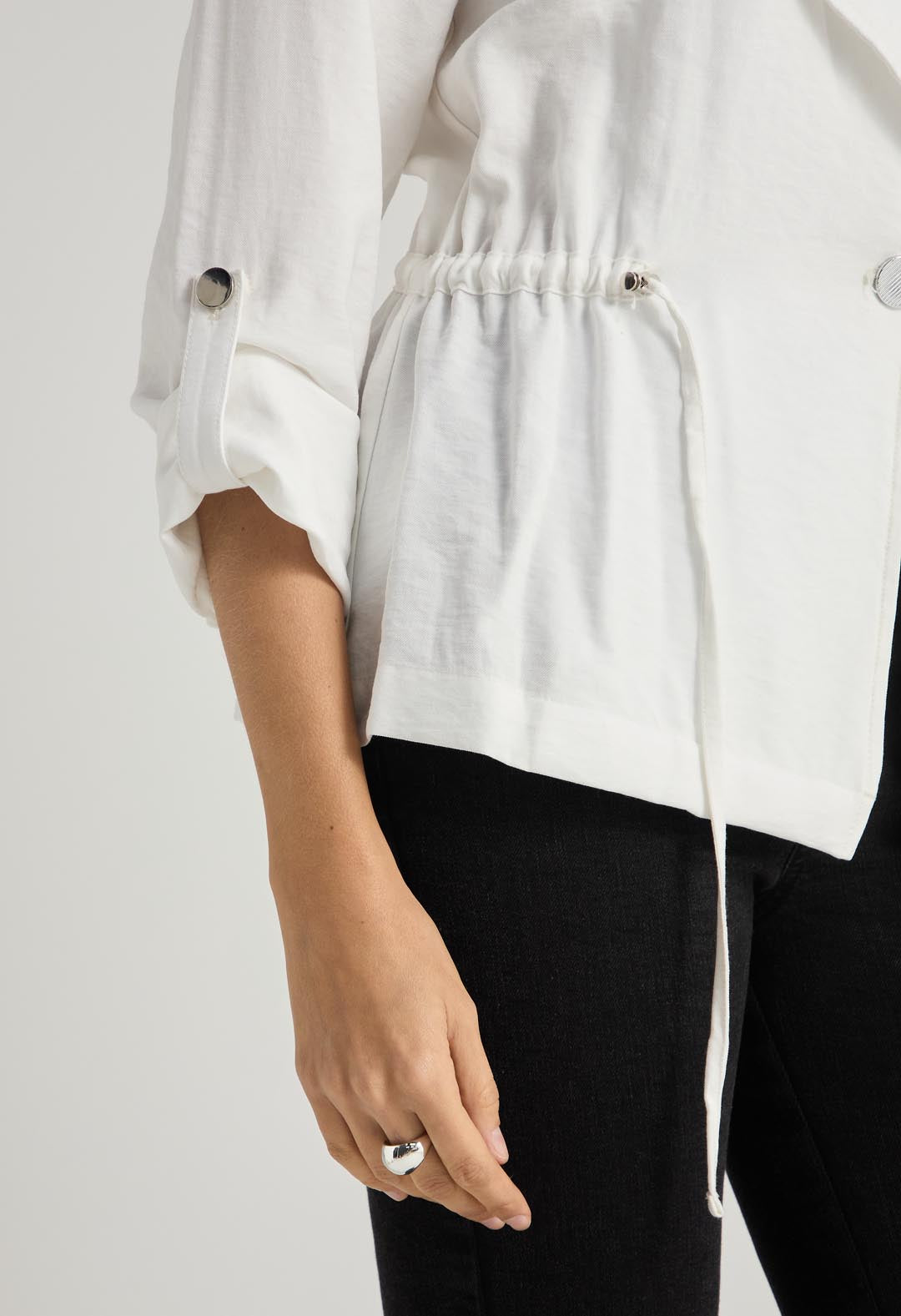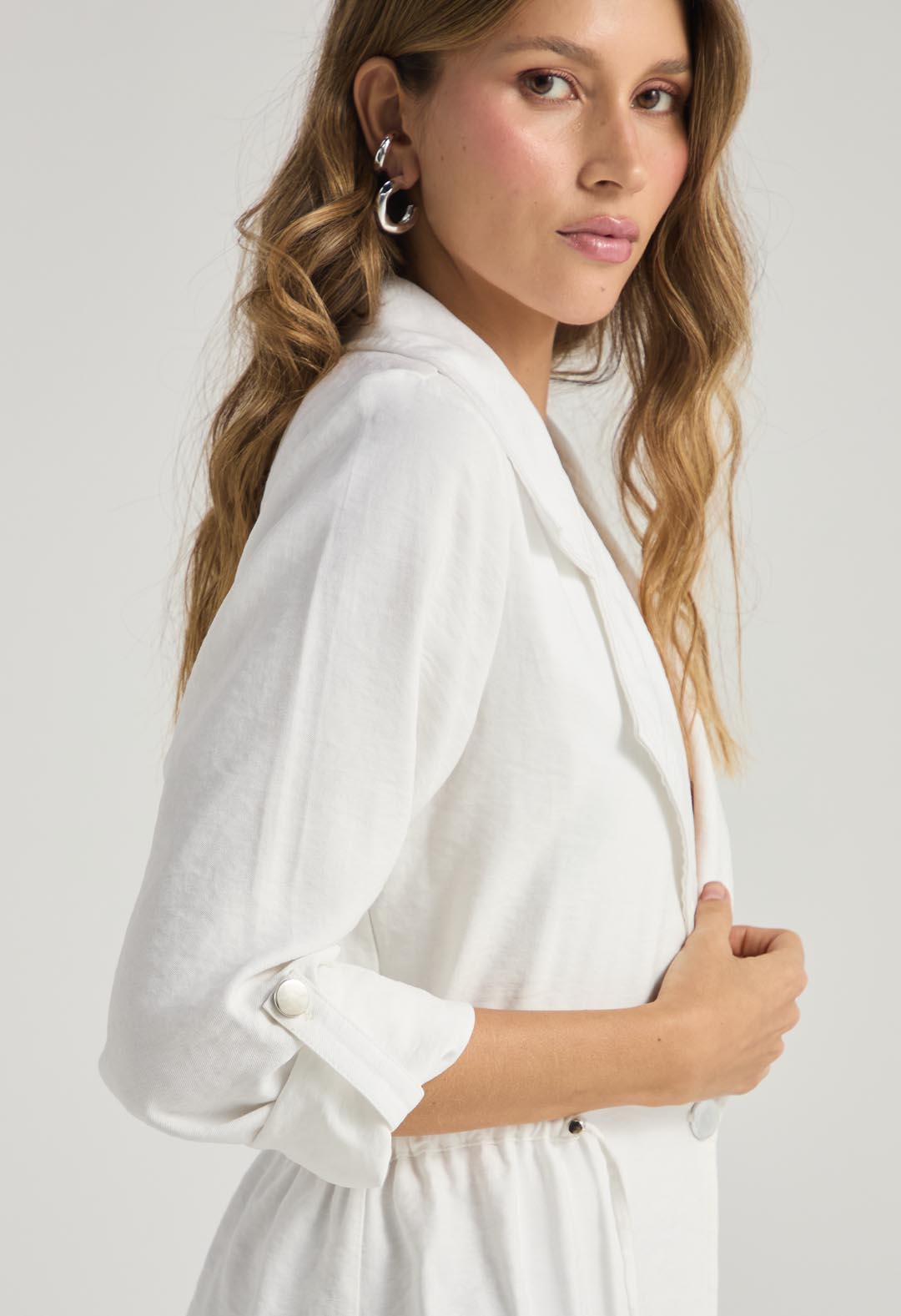 Blazer manga larga, color marfil, fondo entero, con canal en cintura y tancas para mujer.