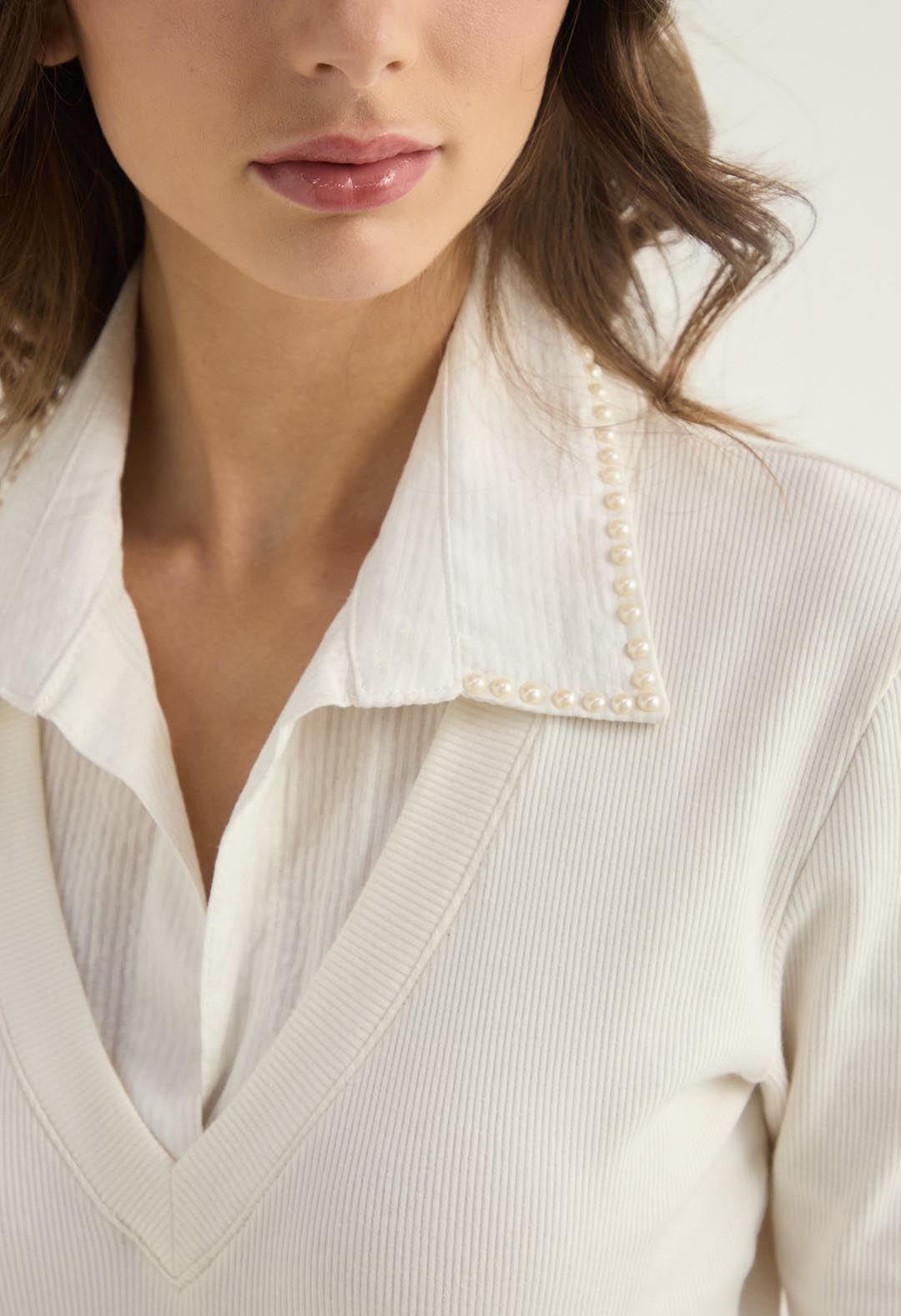 Blusa a rayas, manga larga, color marfil, con cuello falso y fondo entero para mujer.