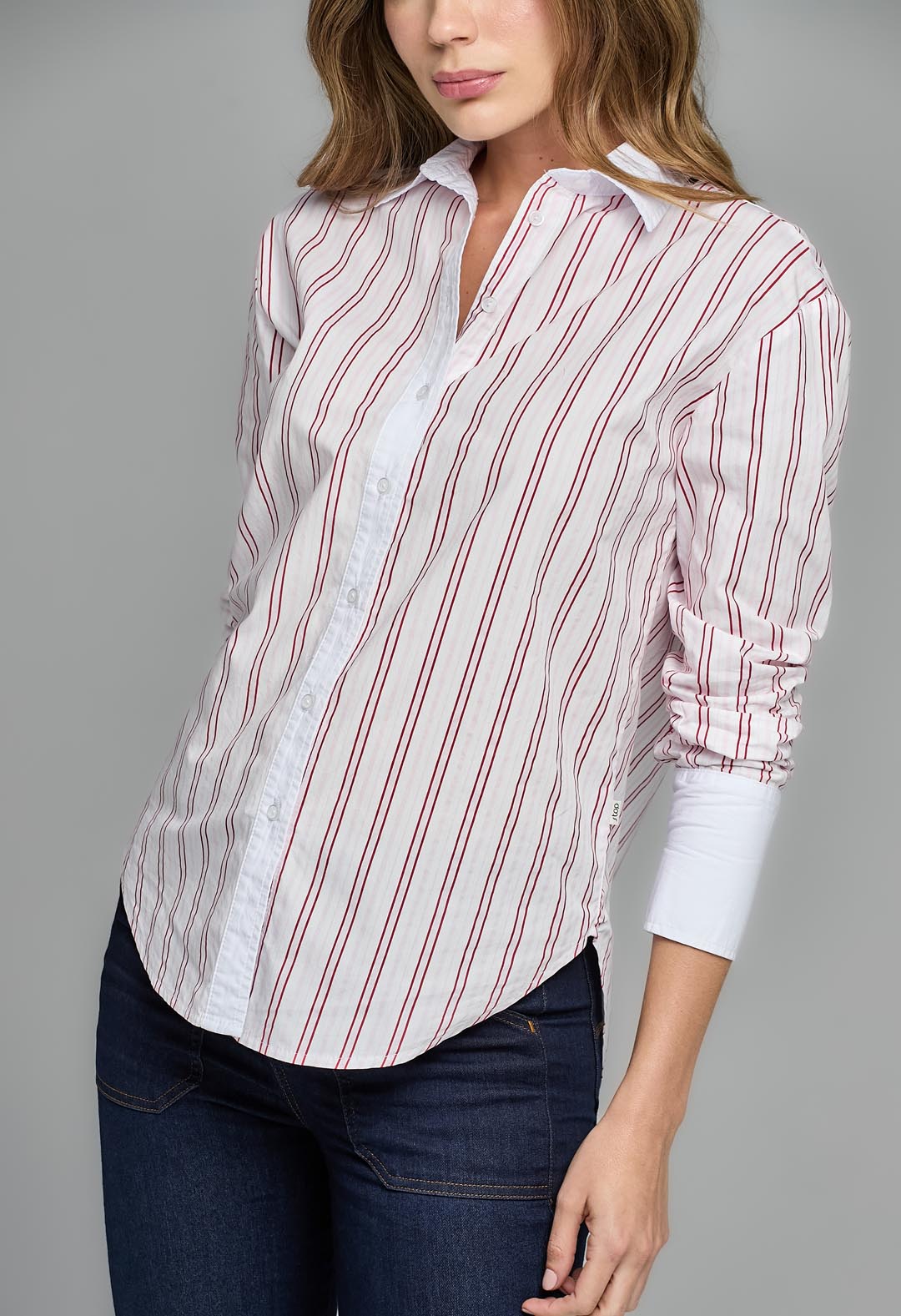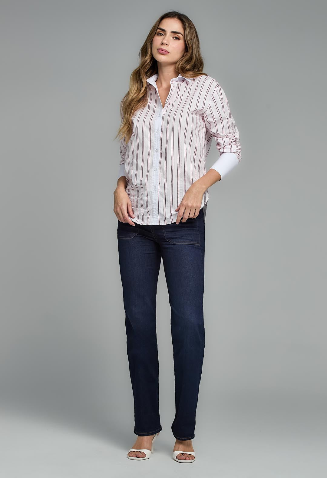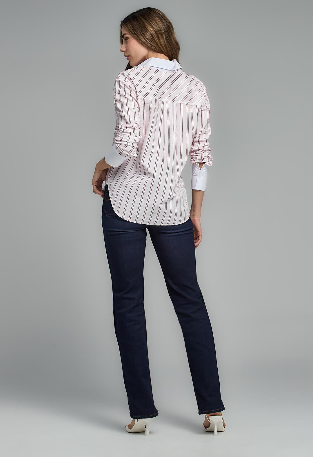 Blusa a rayas, manga larga, color rosa, fondo entero, cuello y puños en contraste para mujeres.