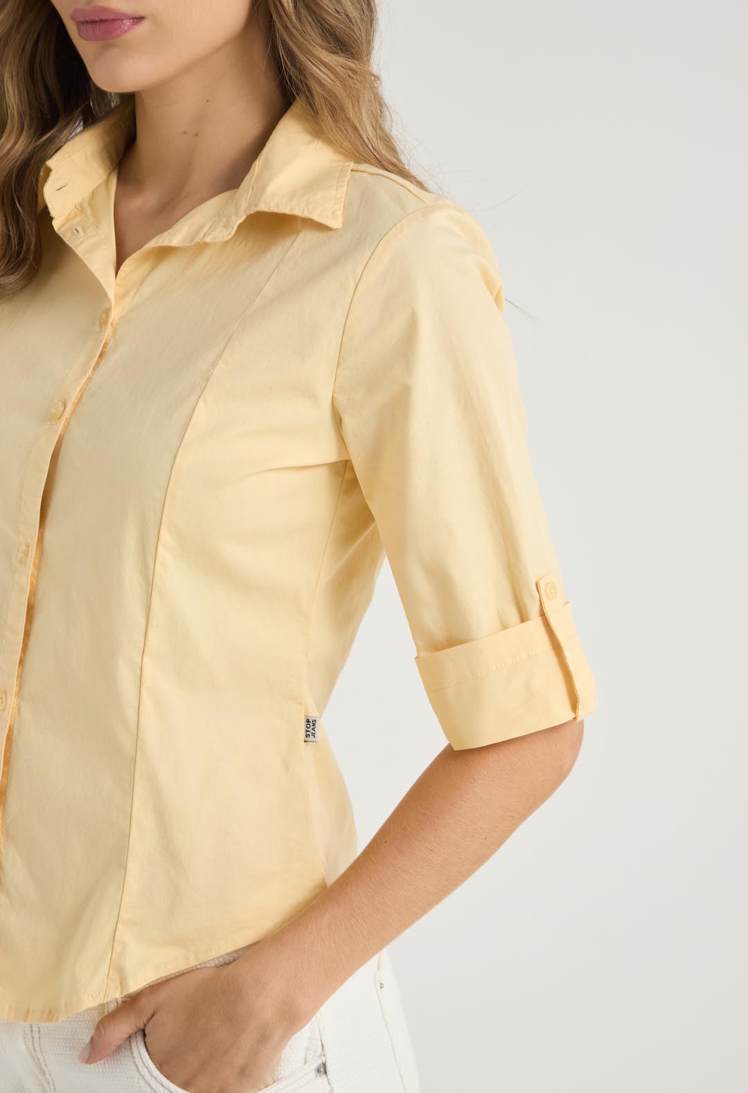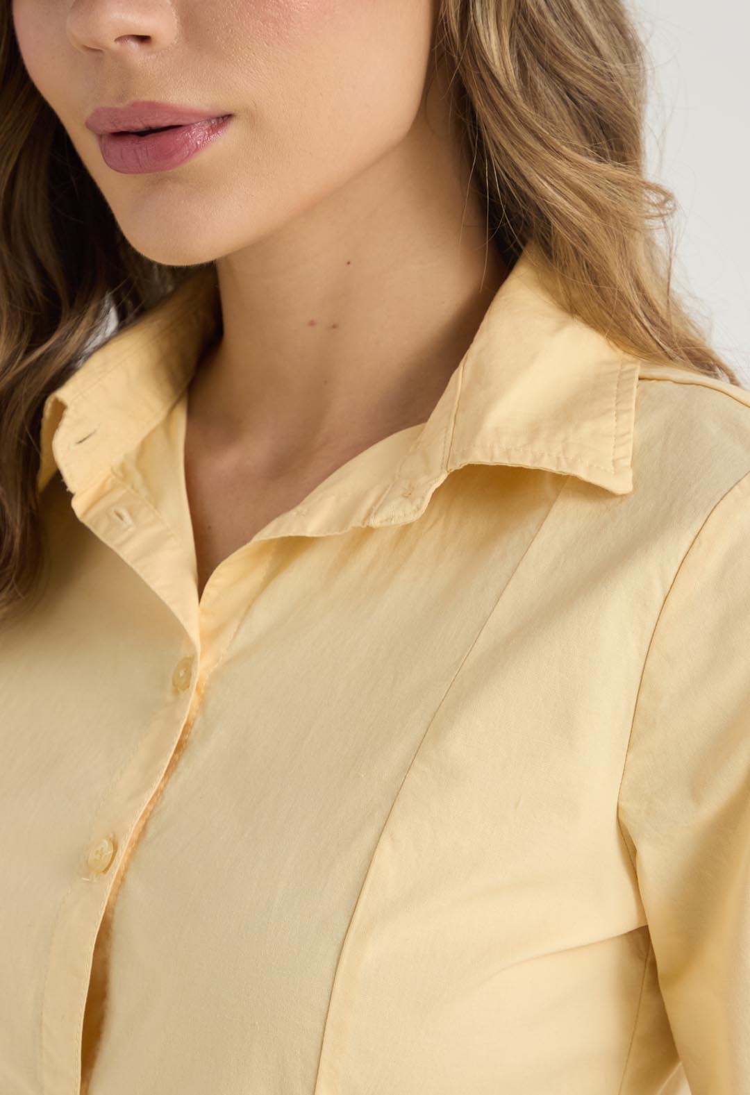 Blusa manga 3/4, color amarillo pastel, fit ajustado, cuello camisero, charreteras en mangas, botones en frente y fondo entero para mujeres.