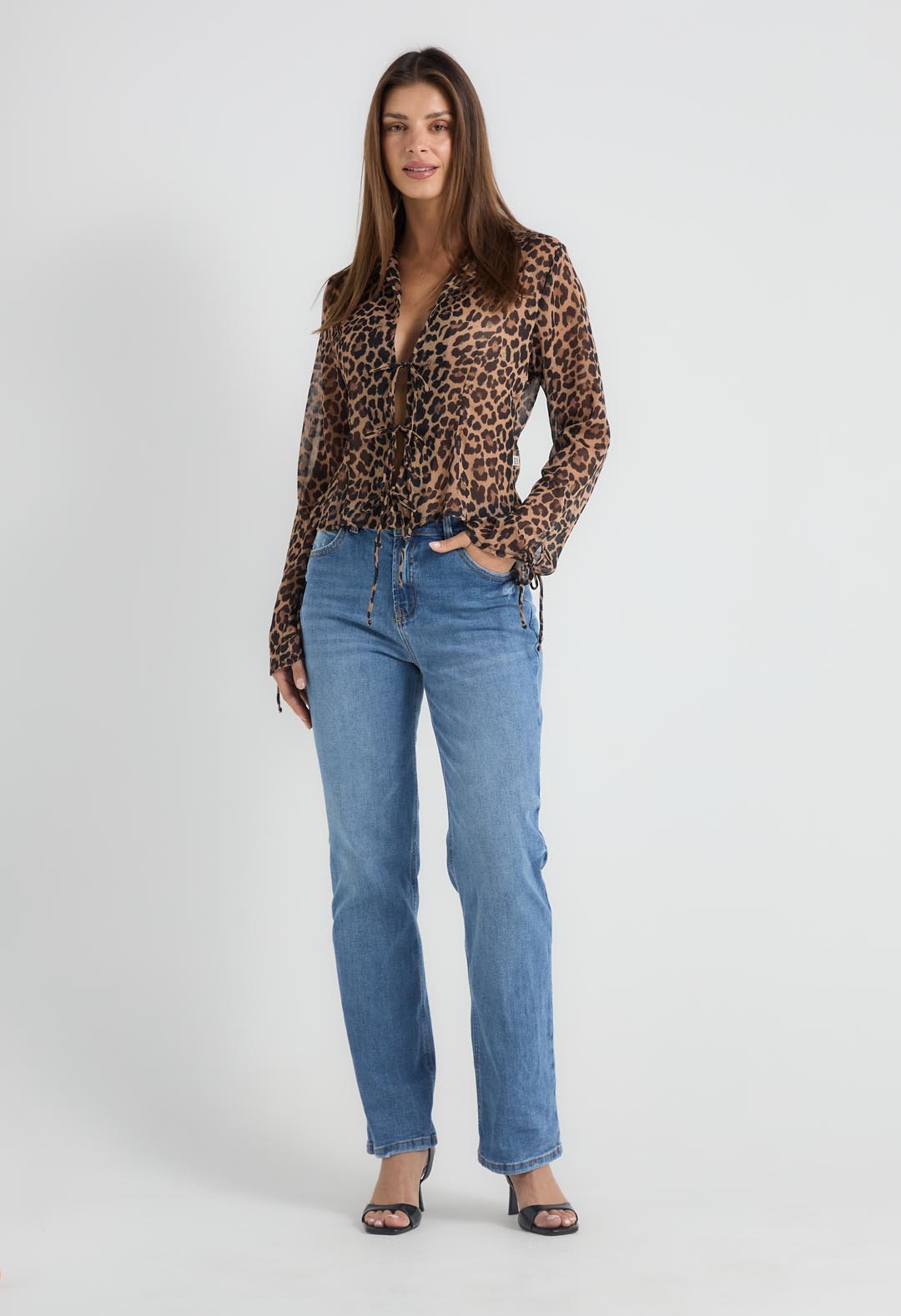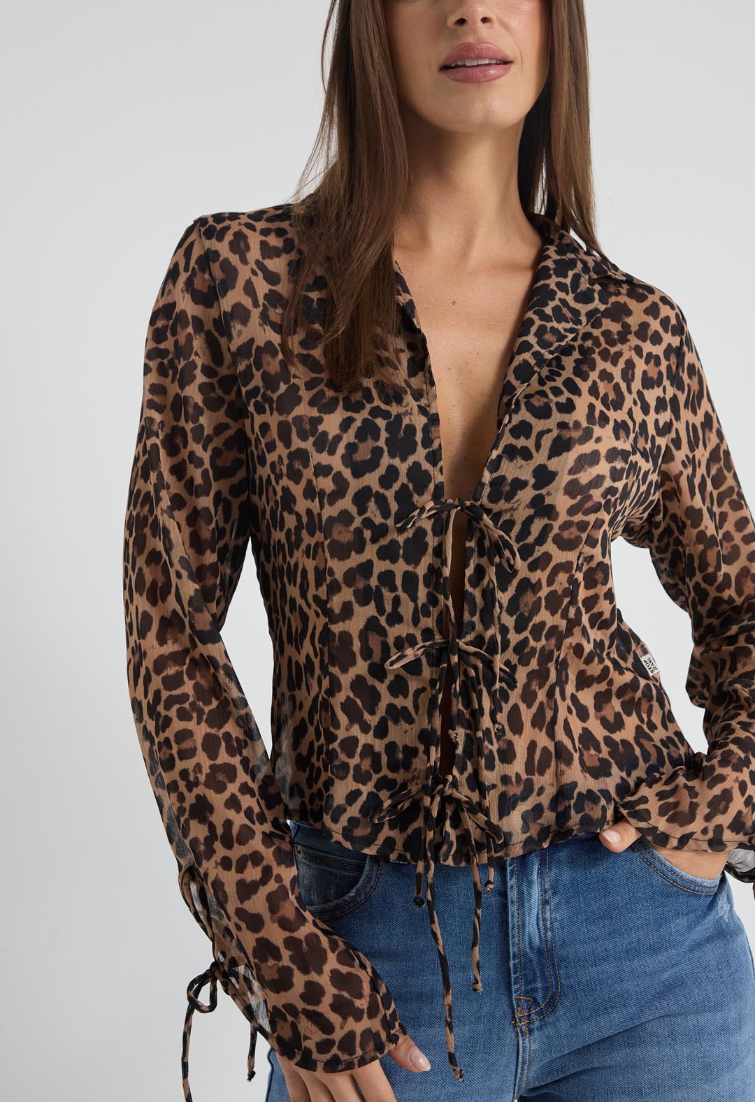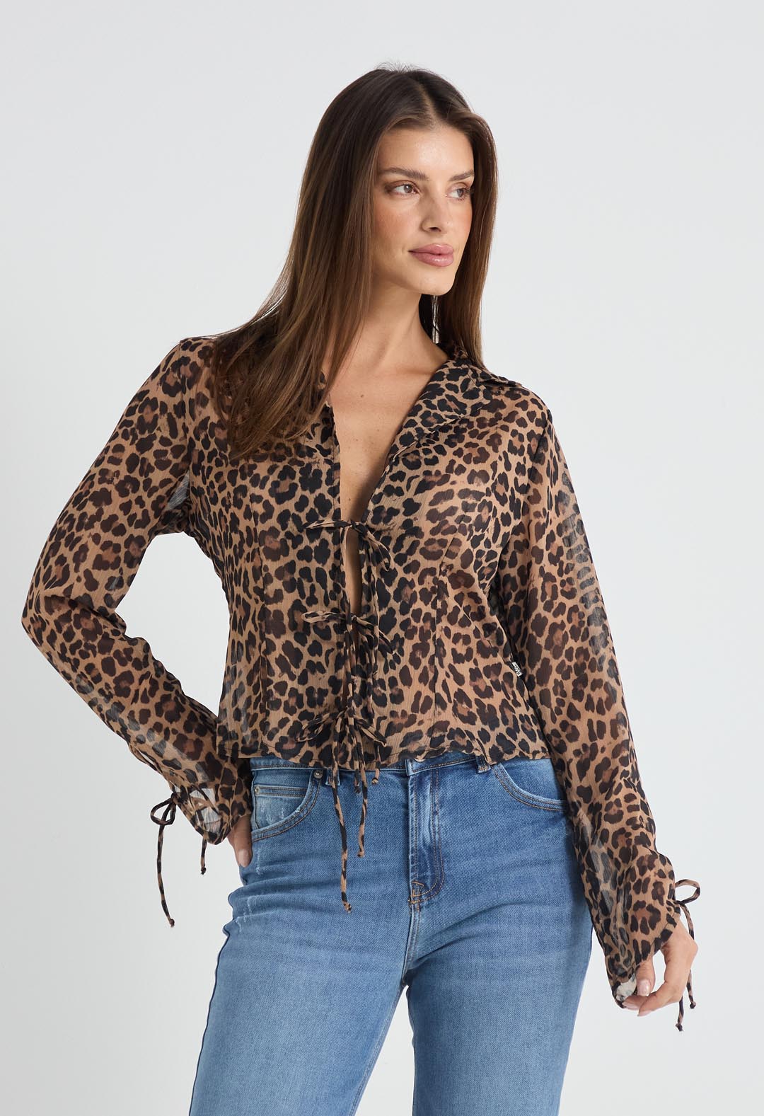 Blusa manga larga, color chocolate, animal print, amarres en frente y escote corazón para mujeres.