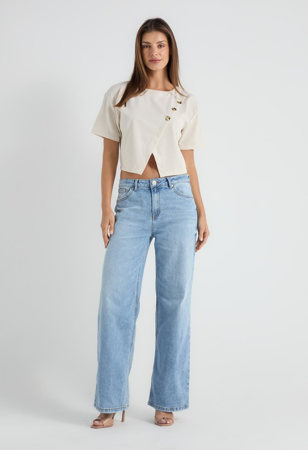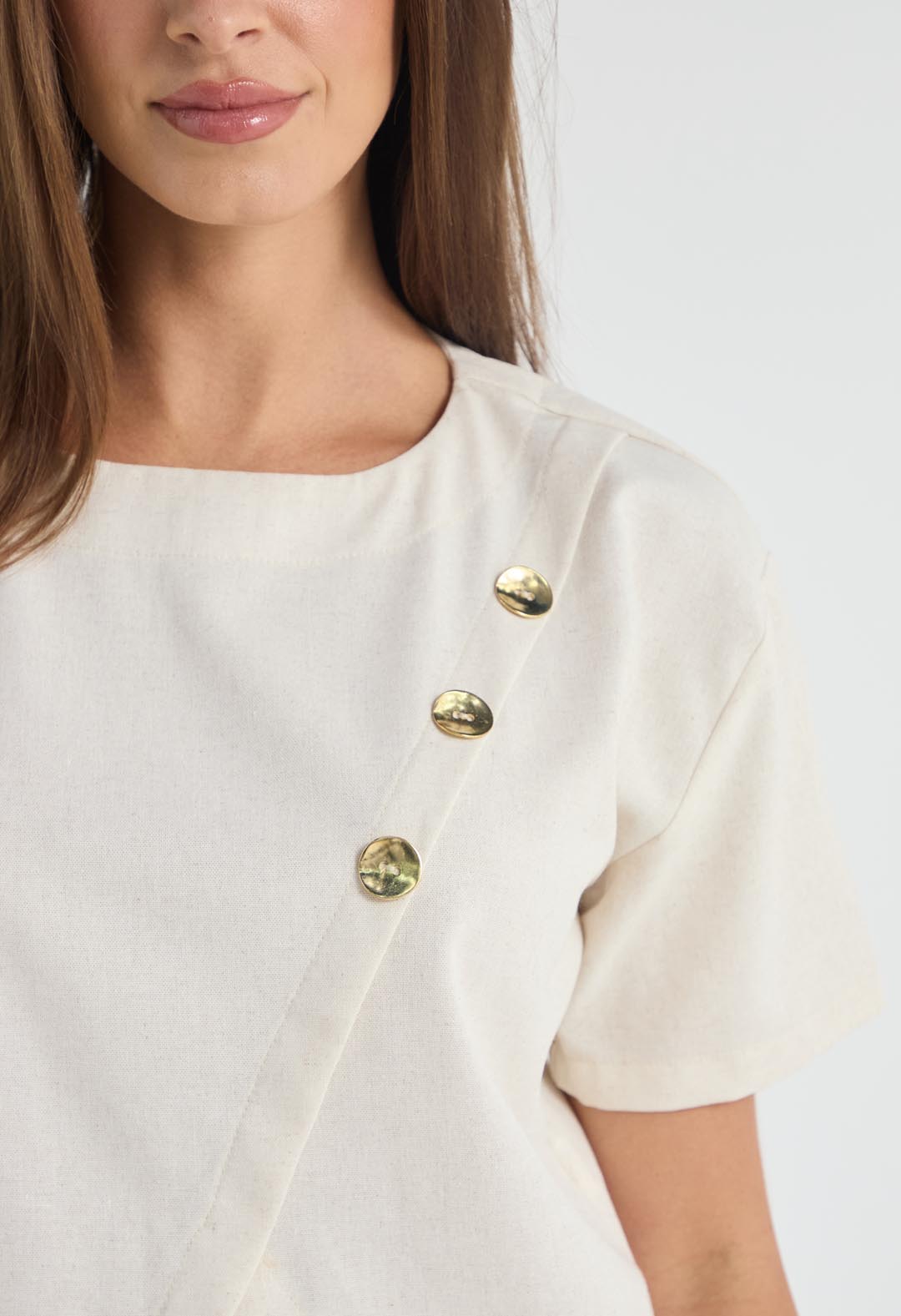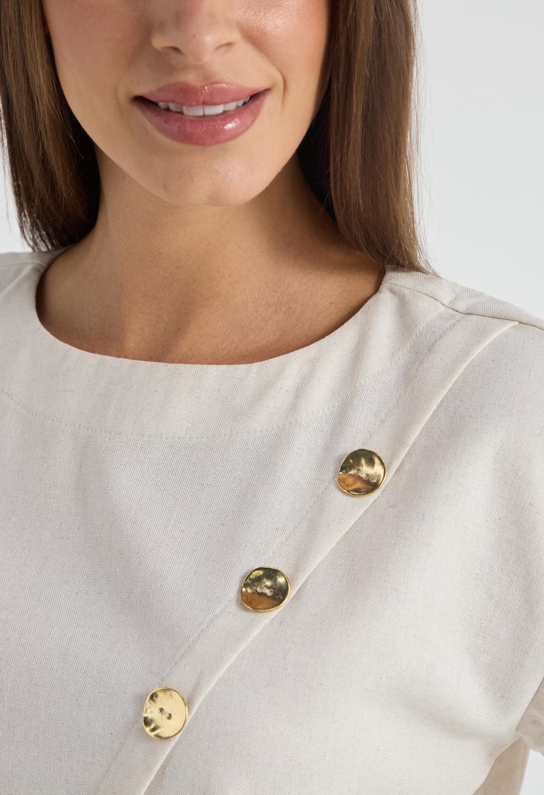 Blusa manga 3/4, color arena, con botones decorativos y fondo entero para mujer.