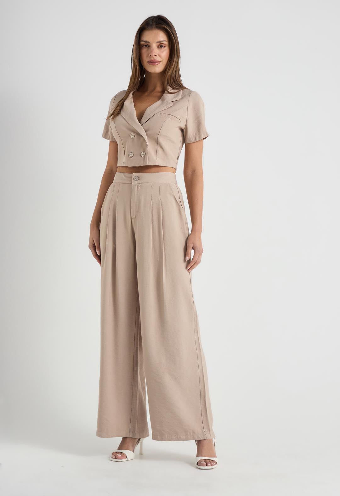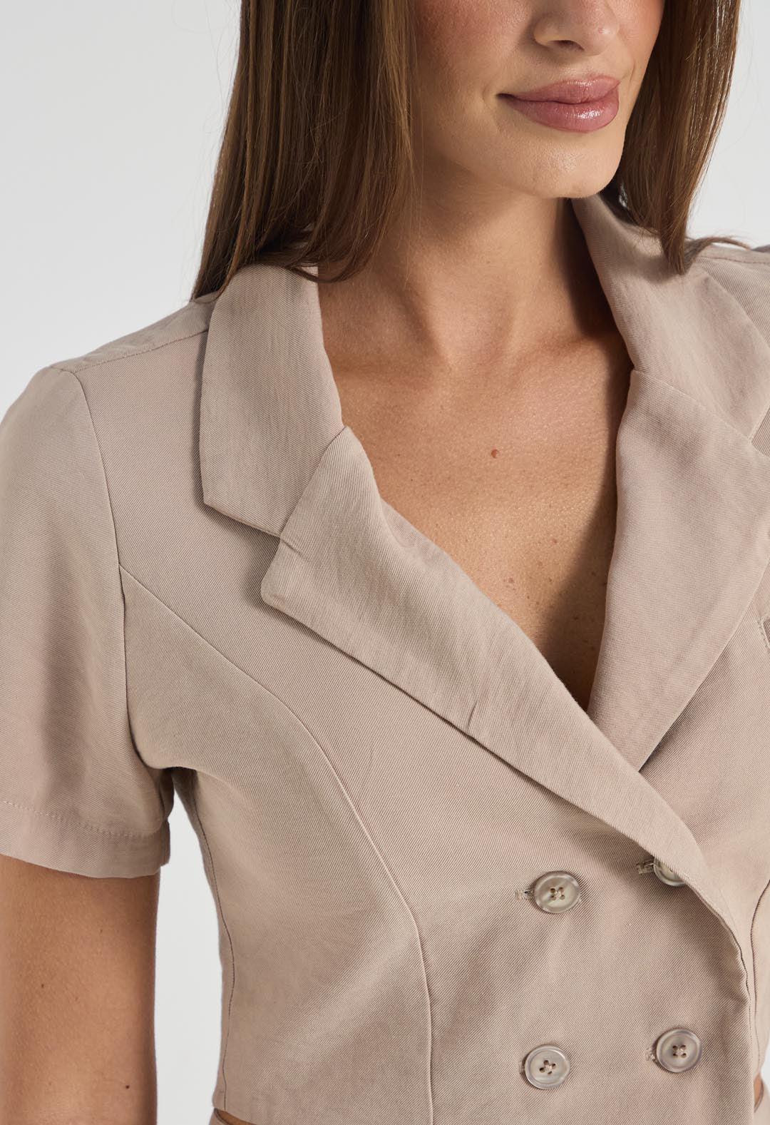 Blusa manga corta, color arena, con cuello y botón en frente para mujer.