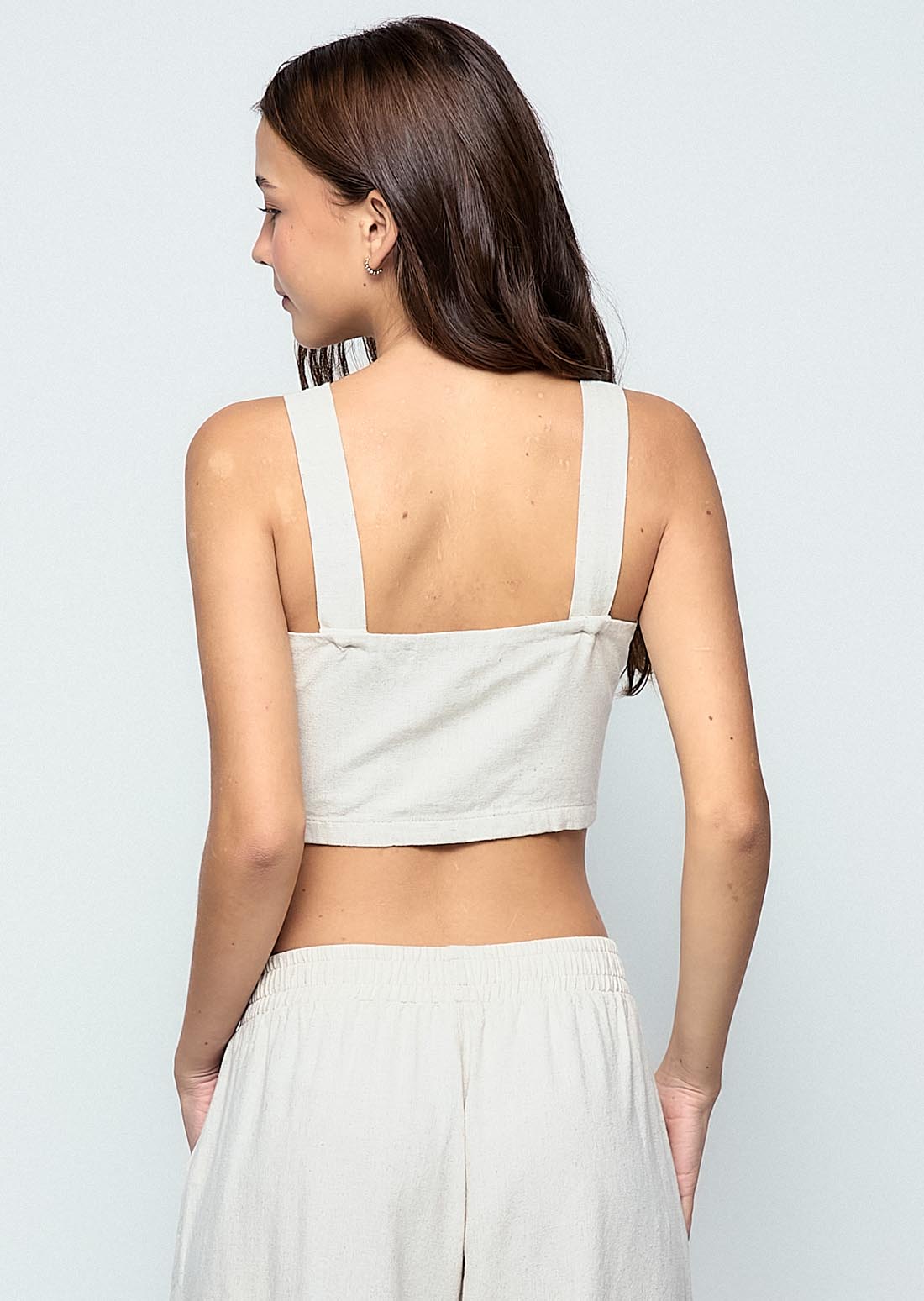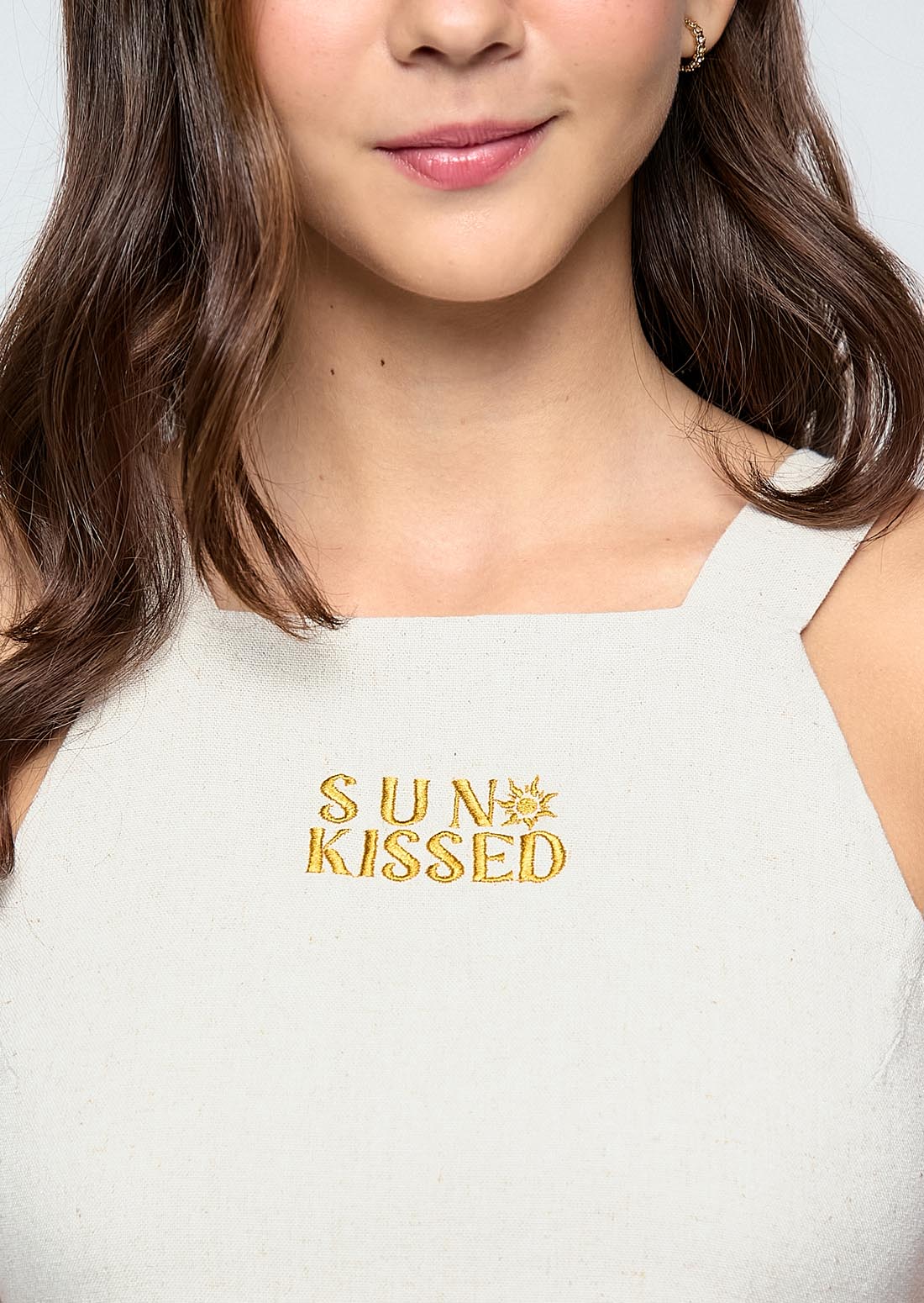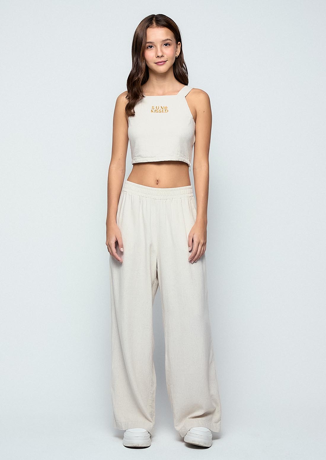 Blusa de tiras, color arena, bordado en frente y cierre en costados para jóvenes.