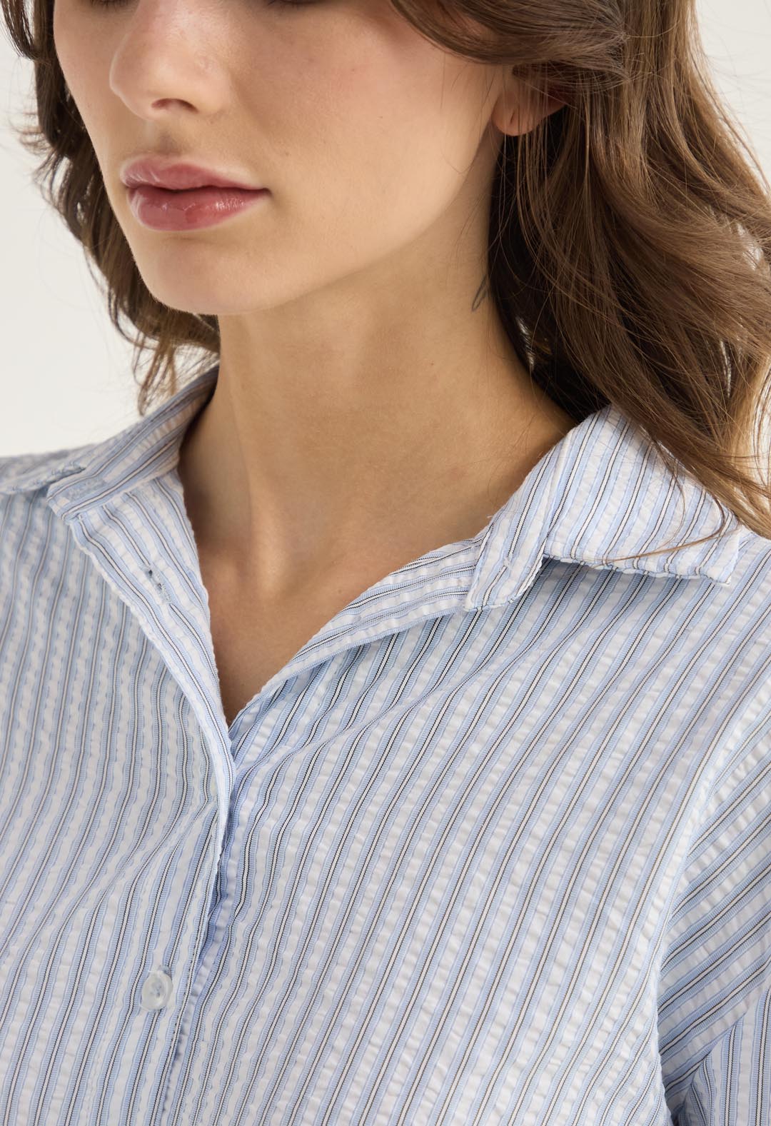 Blusa manga larga, color azul, a rayas, con botones y fondo entero para mujer.