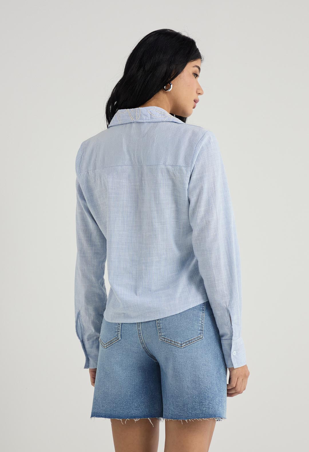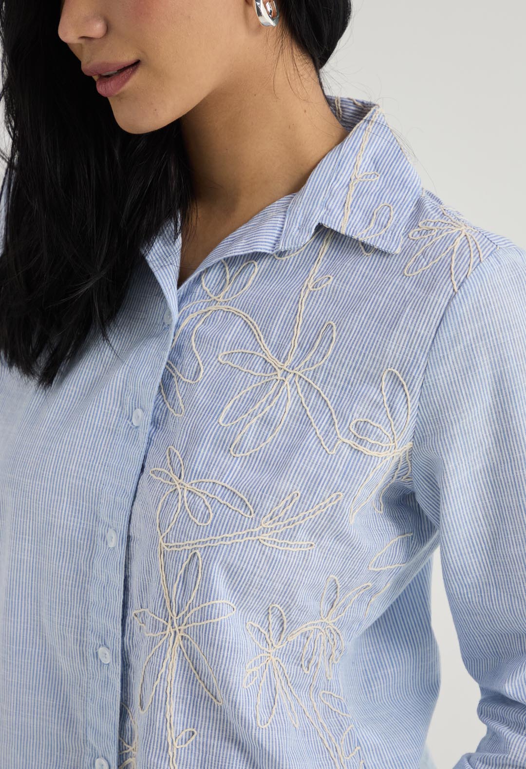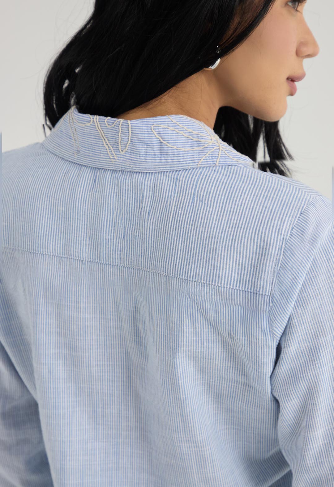 Blusa manga larga, color azul y con tela bordada para mujer.