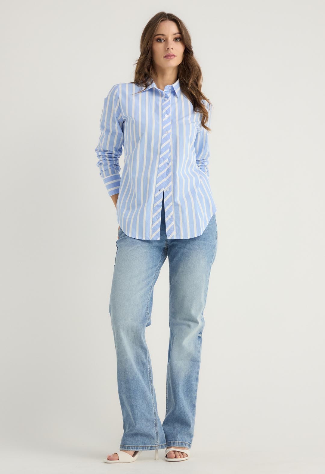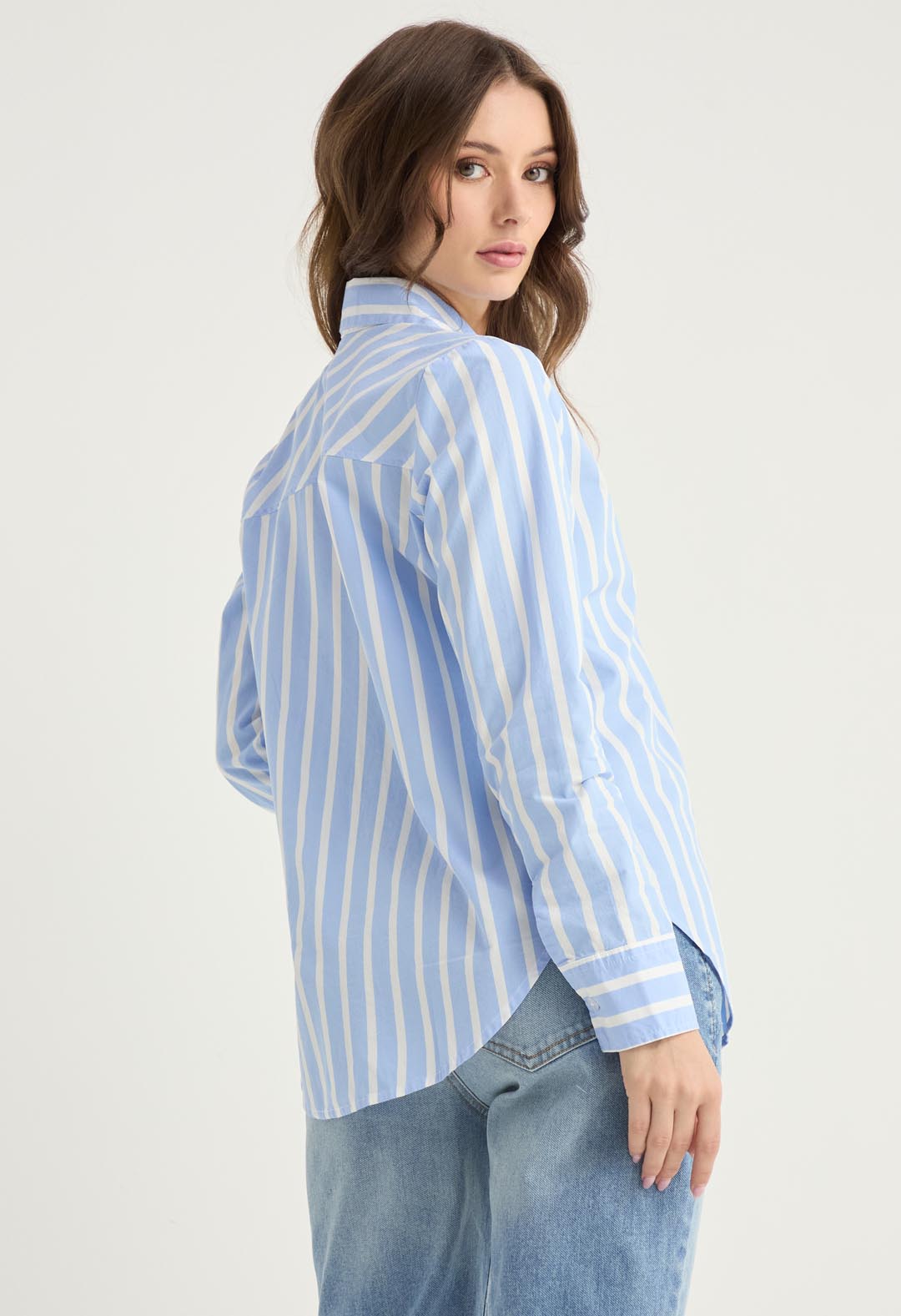 Blusa a rayas, manga larga, color azul est1 y con botones para mujeres.
