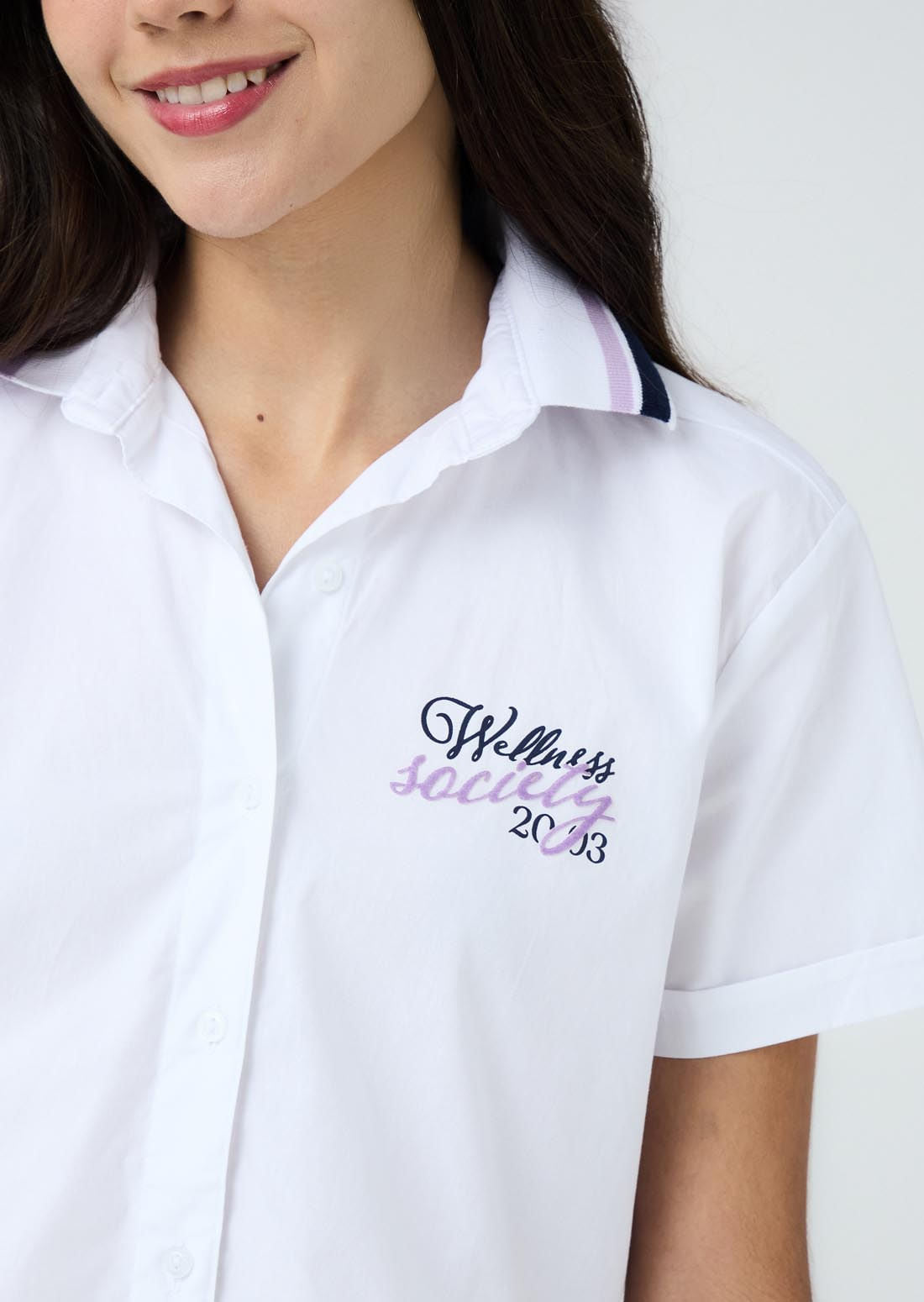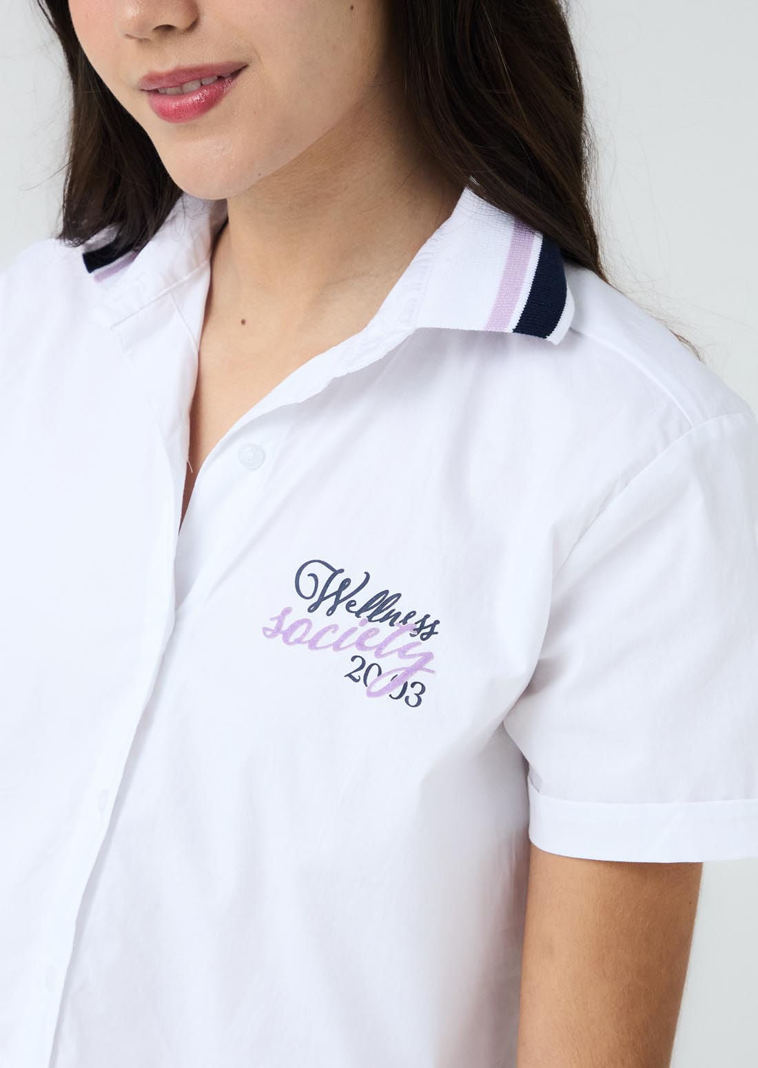 Blusa manga corta, color blanco, estampado en frente y cuello con rectilíneo para jóvenes.