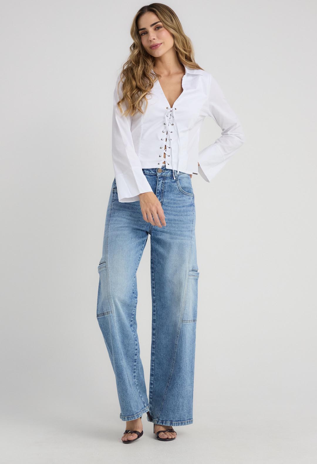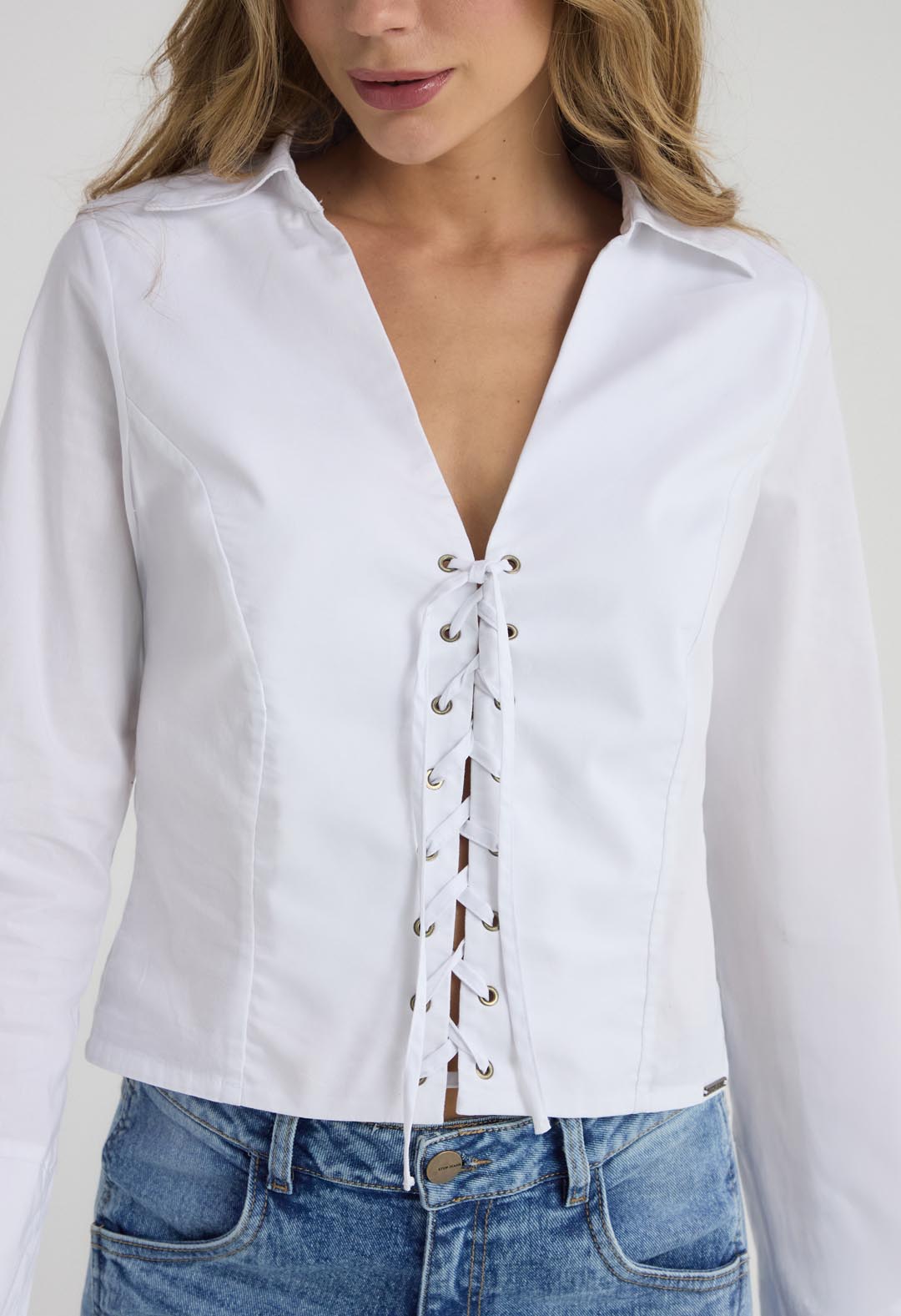 Blusa manga larga, color blanco, con ojaletes y amarre para mujeres.