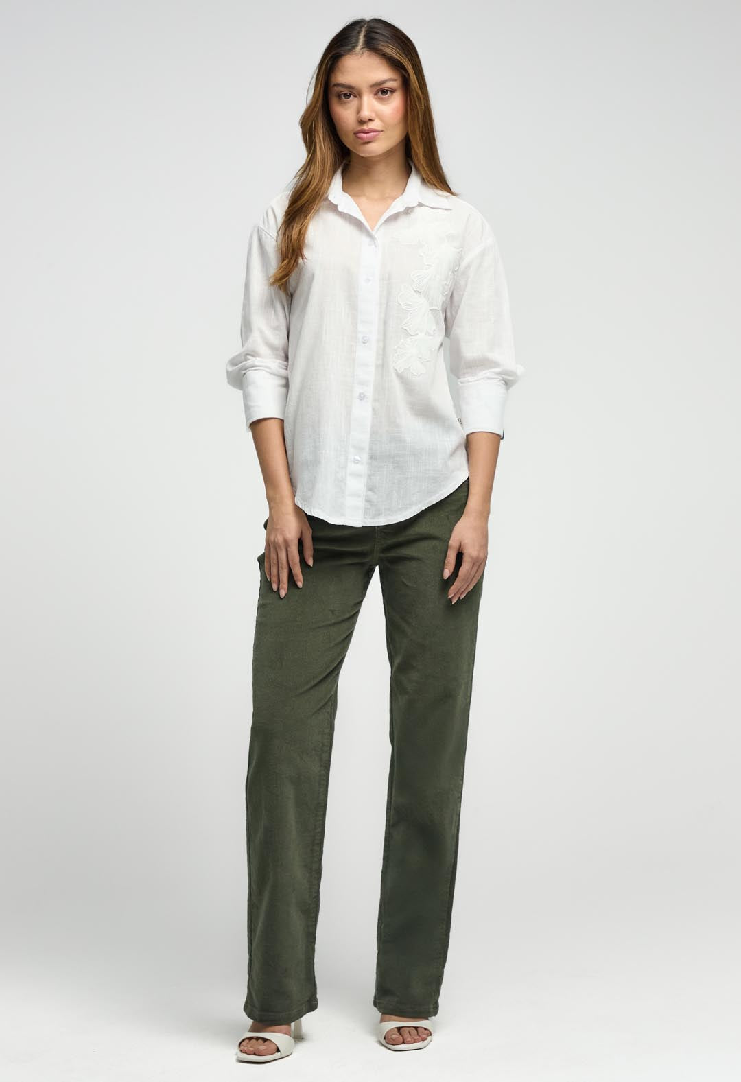 Blusa manga larga, color blanco y frente estampado para mujeres.