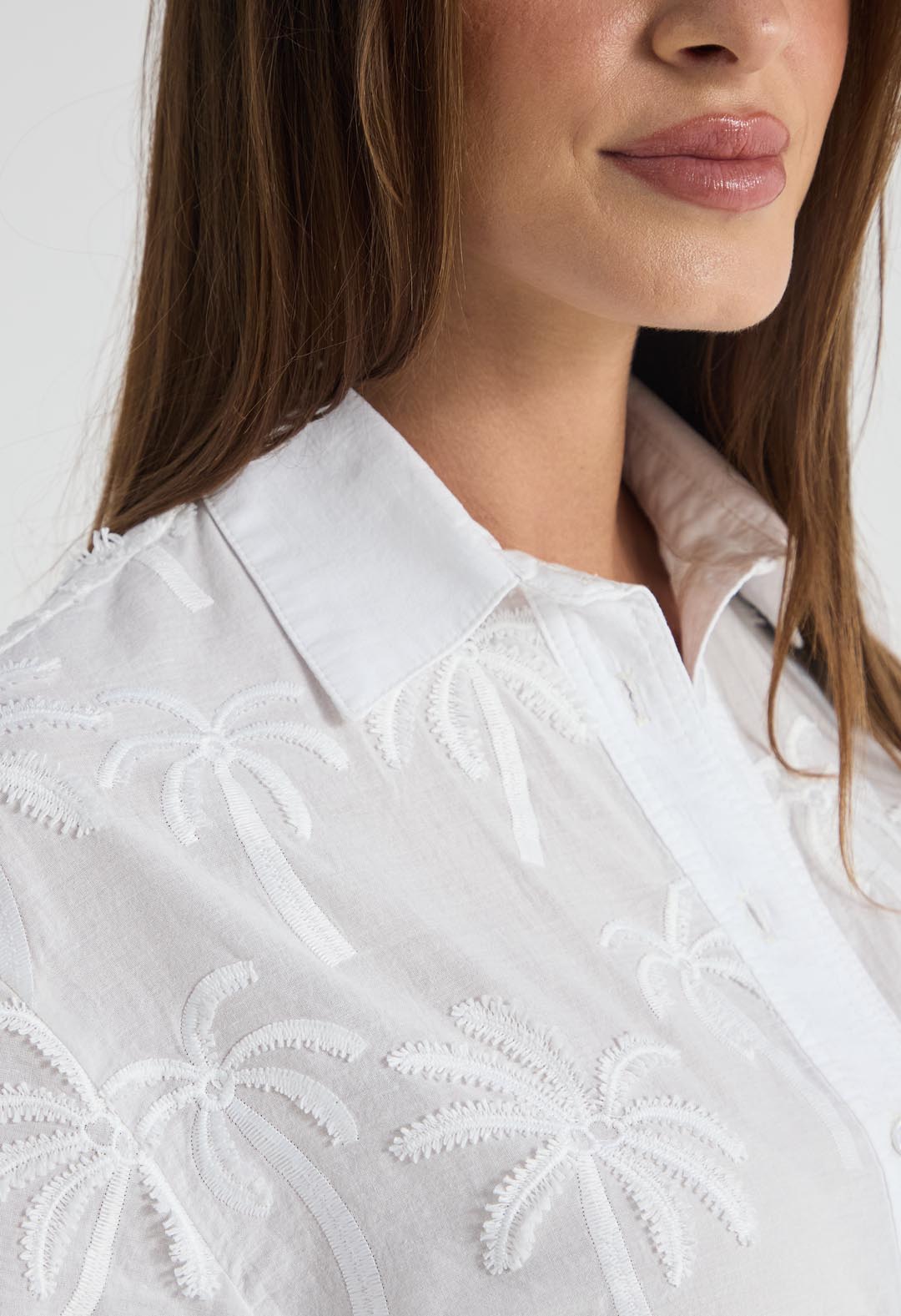 Blusa manga 3/4, color blanco, tela con efecto y cuello redondo para mujer.