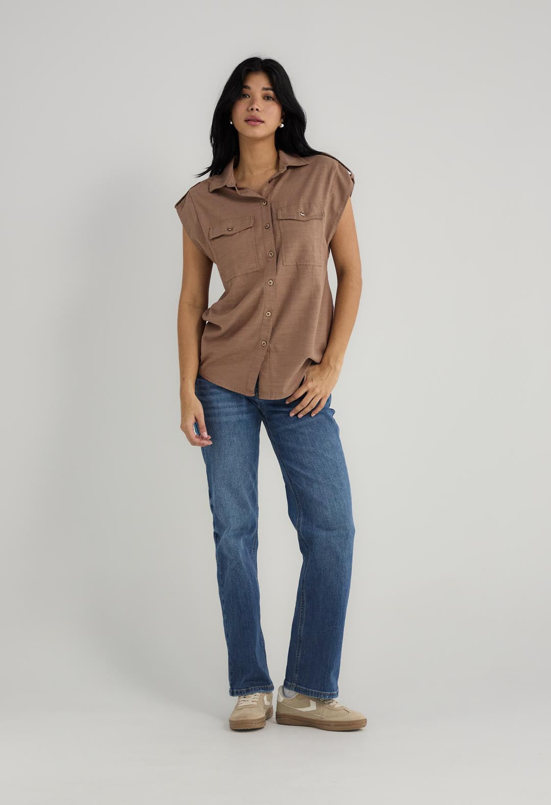 Blusa chocolate con bolsillos y botones en frente para mujer
