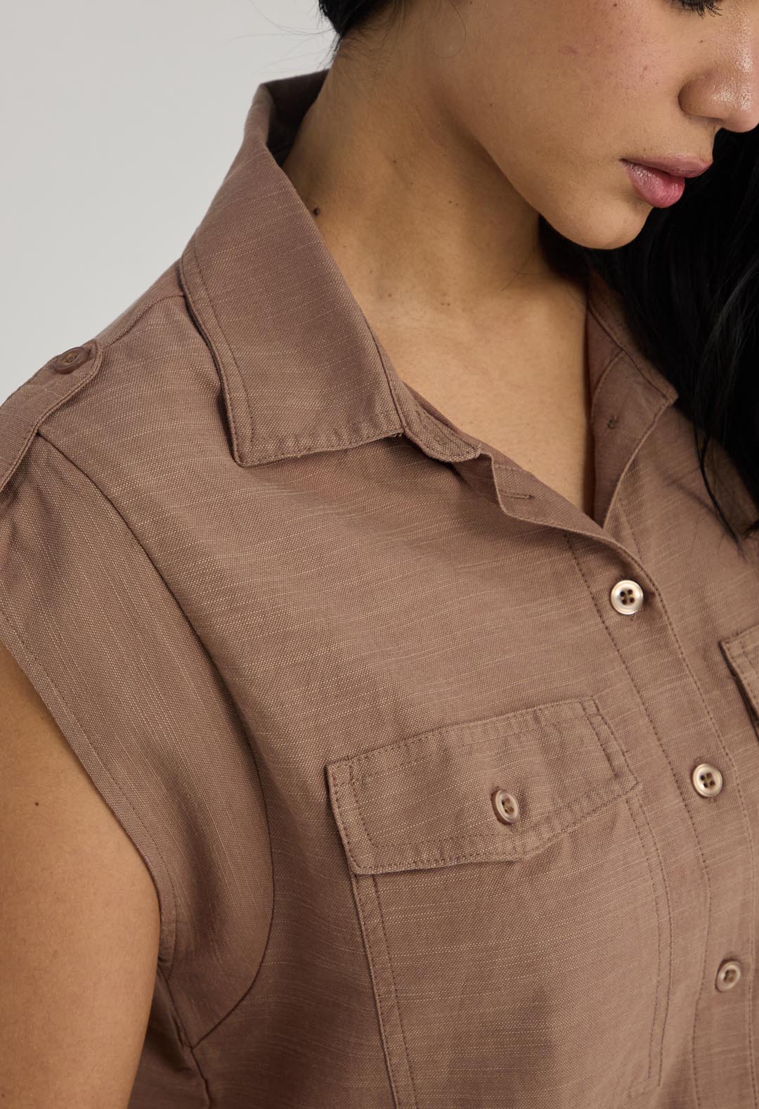 Blusa manga corta, color chocolate, con bolsillos y botones en frente para mujer.