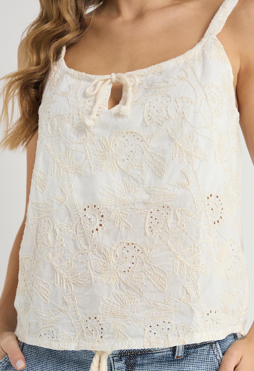 Blusa de tiras, color marfil, amarre en frente y estampado para mujeres.