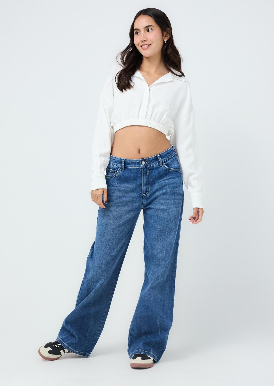 Blusa manga larga, color marfil, elástico en cintura, broches en frente y mangas para jóvenes.