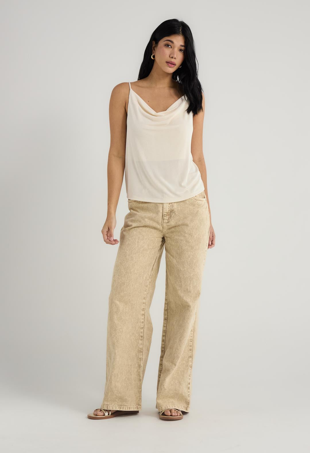 Blusa de tiras, color marfil, escote drapeado y fondo entero para mujer.