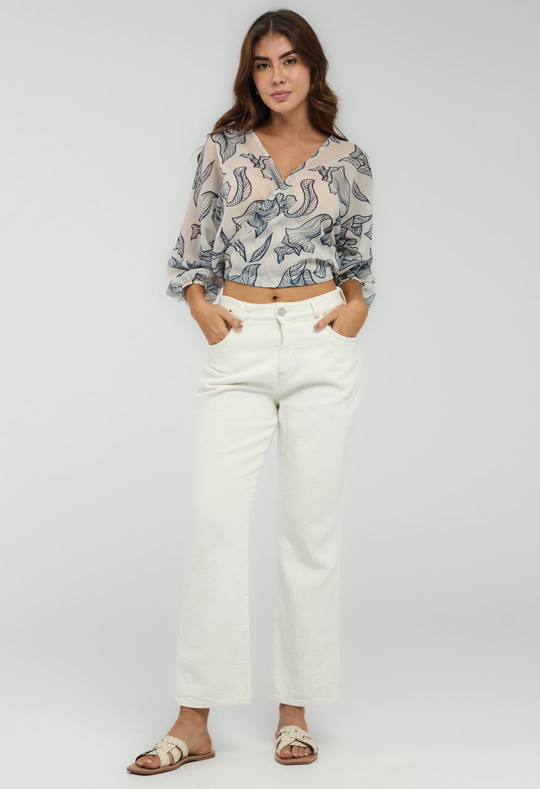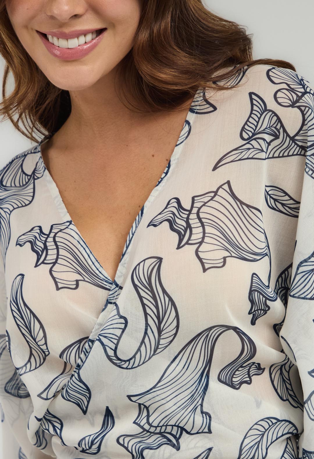Blusa manga larga, color marfil, frente cruzado y full print para mujeres.