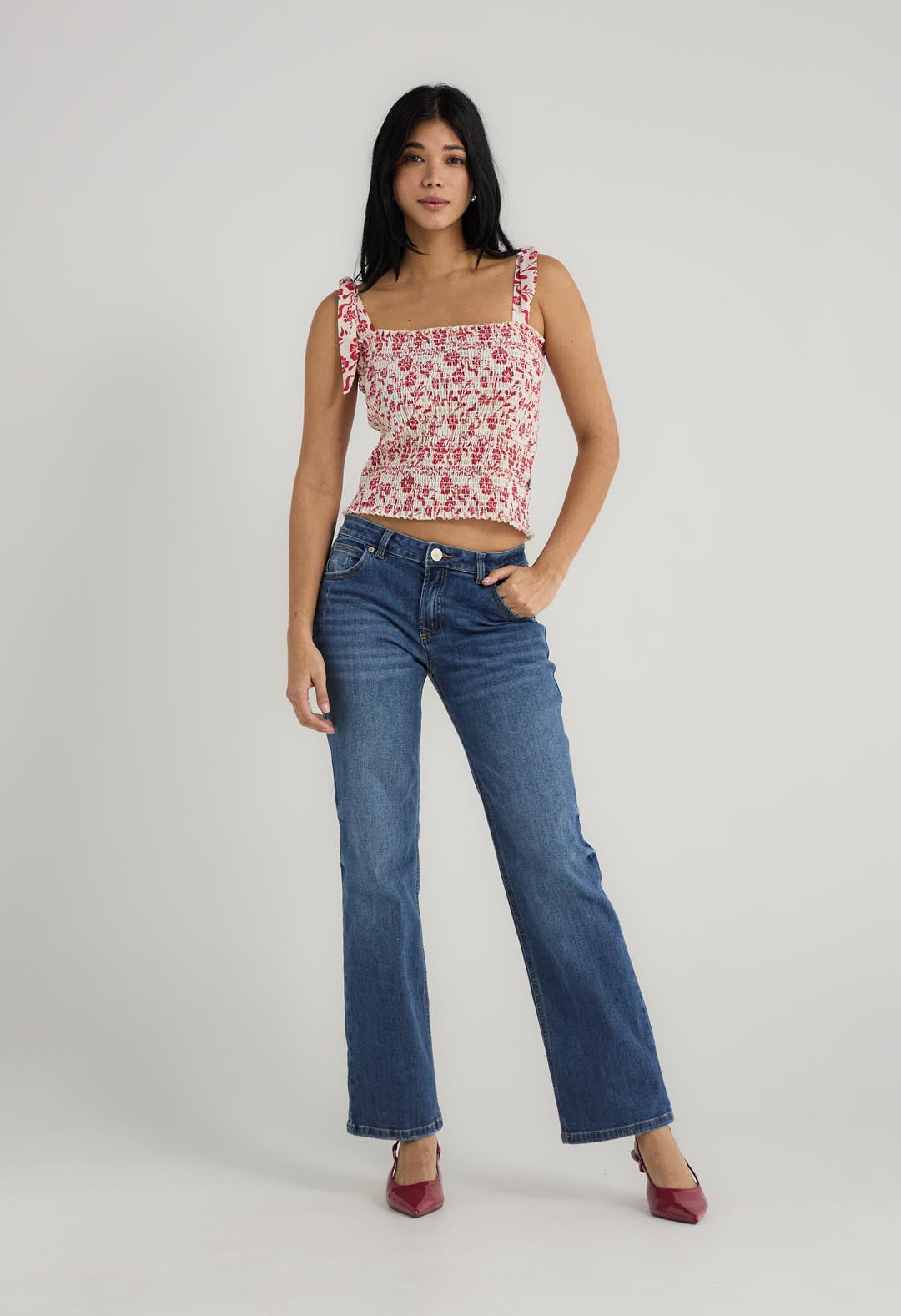Blusa de tiras, color marfil, estampada y con nido de abeja para mujer.