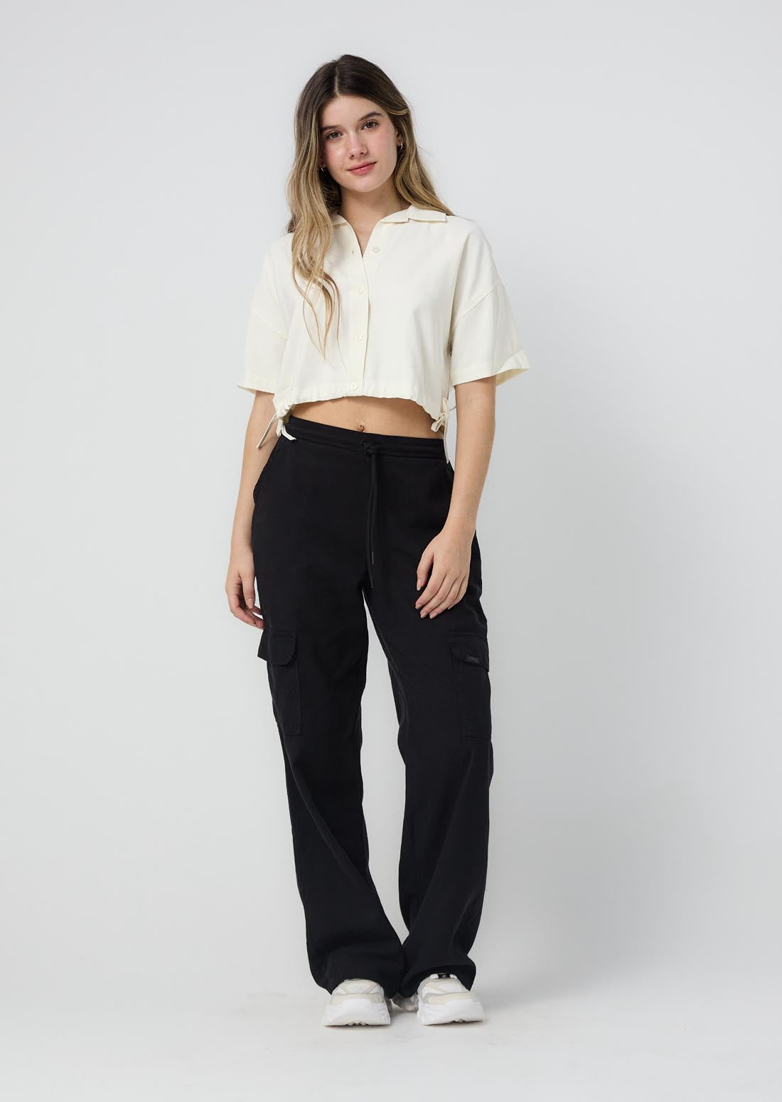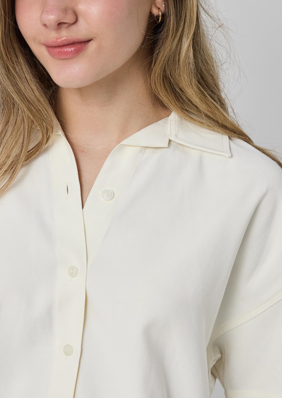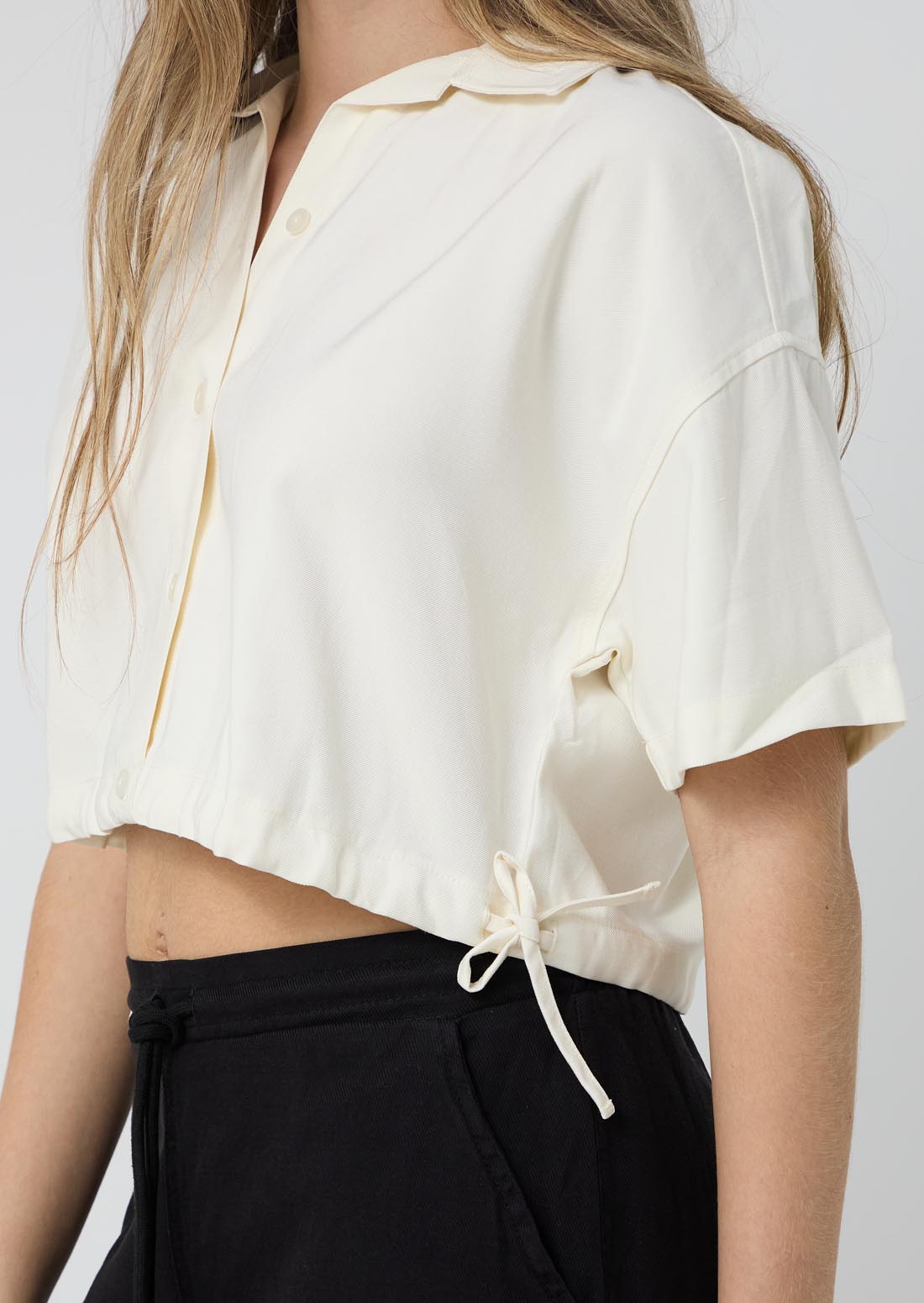 Blusa manga corta, color marfil, recogido ajustable en cintura y fondo entero para jóvenes.