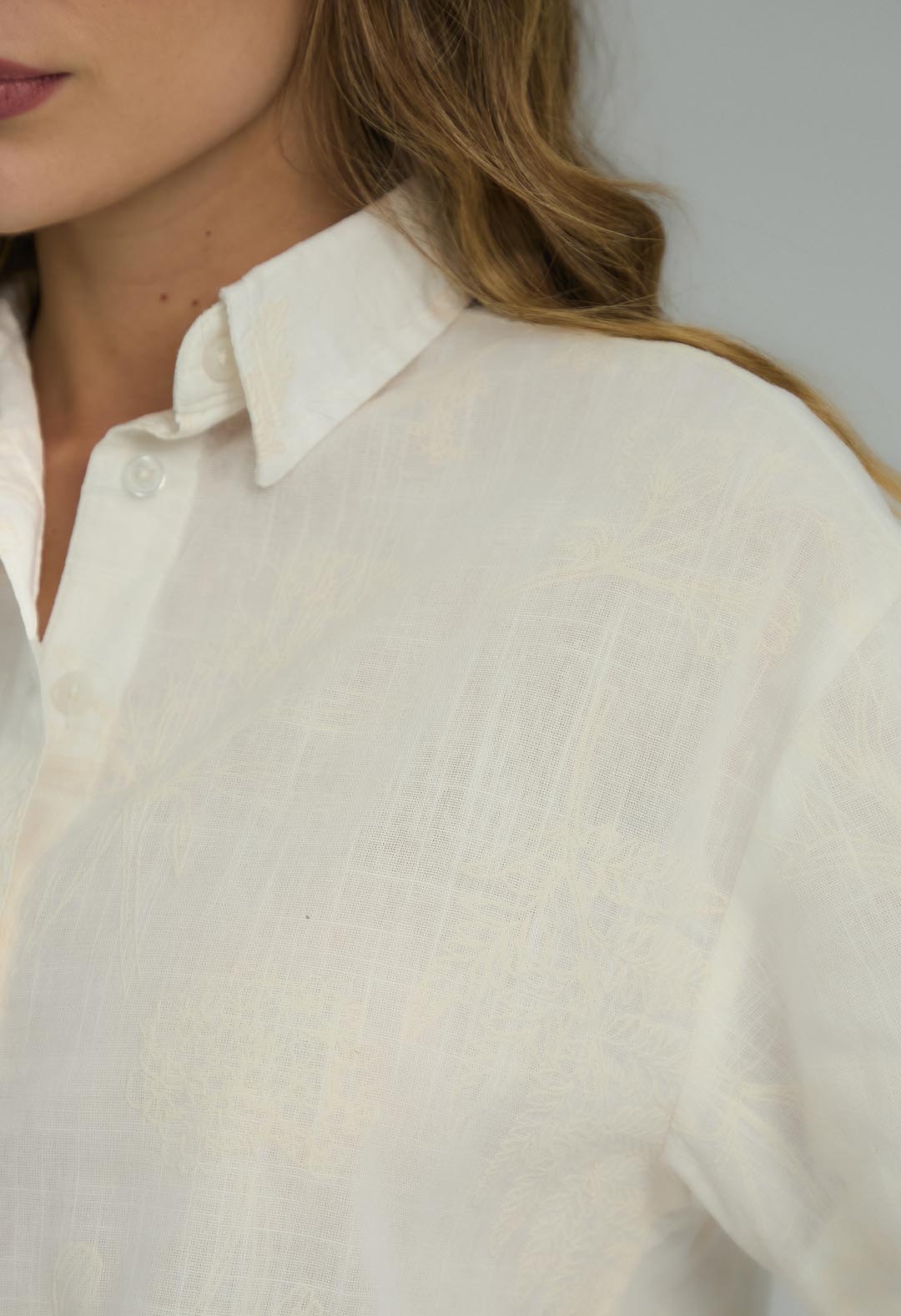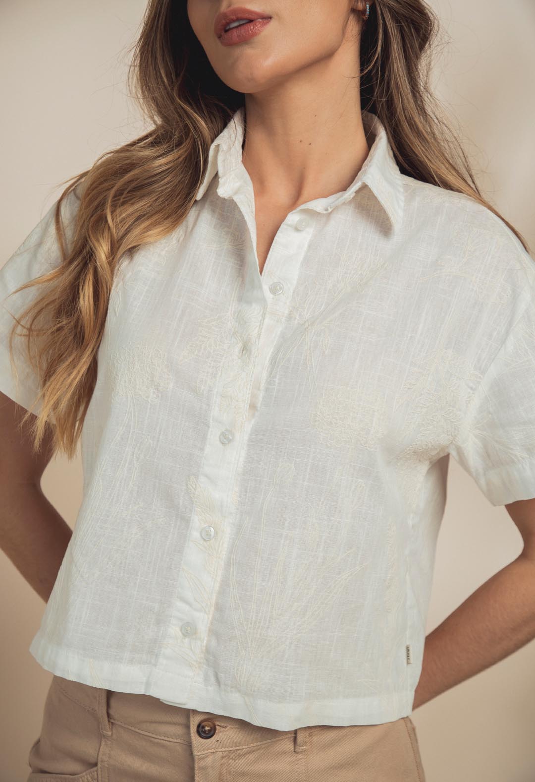 Blusa manga corta, color marfil, cuello redondo, estampada y con efecto para mujeres.