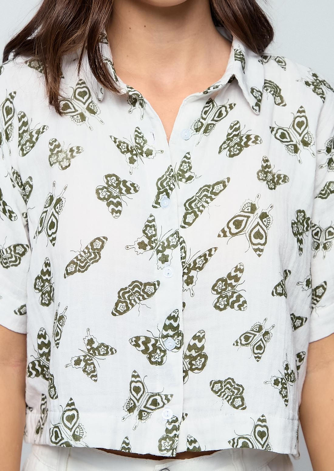 Blusa manga corta, color marfil y full print de mariposas para jóvenes.