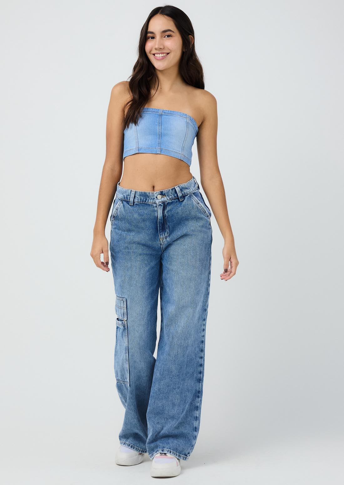 Blusa strapless, lavado medio, en denim, con cortes en frente y fondo entero para jóvenes.