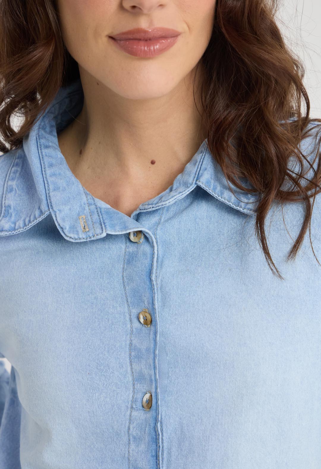 Blusa manga larga, lavado medio, en denim y fondo entero para mujeres.