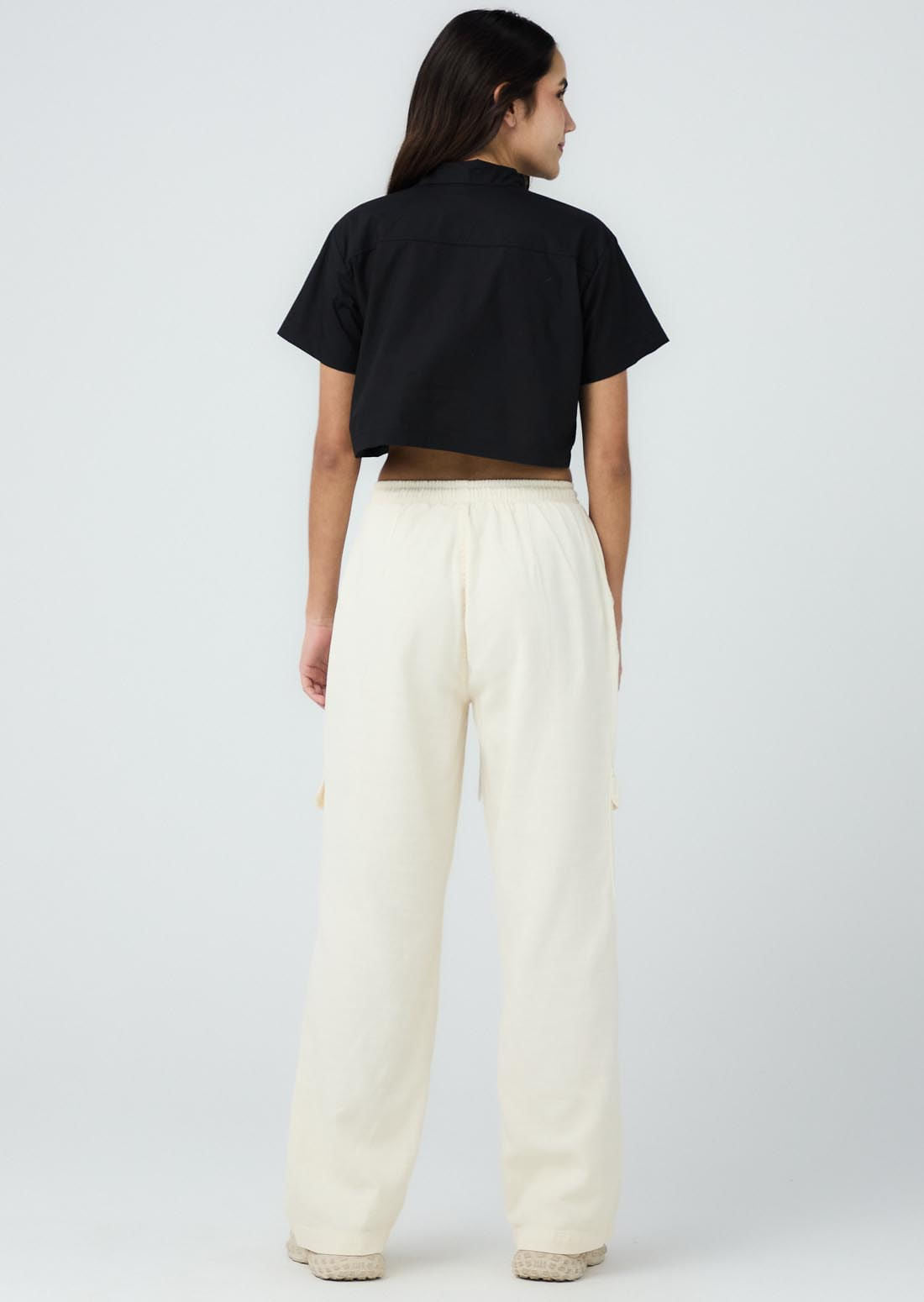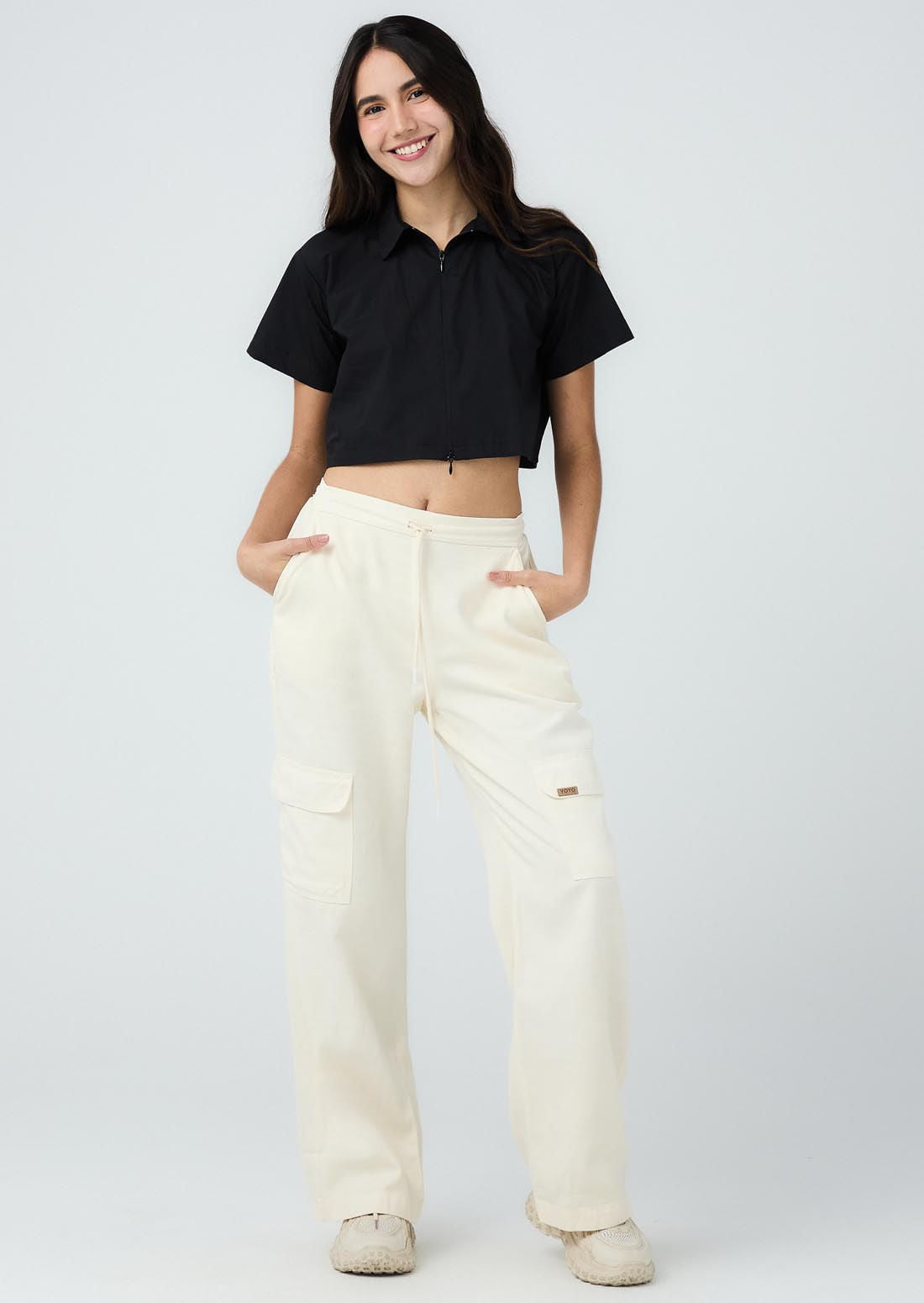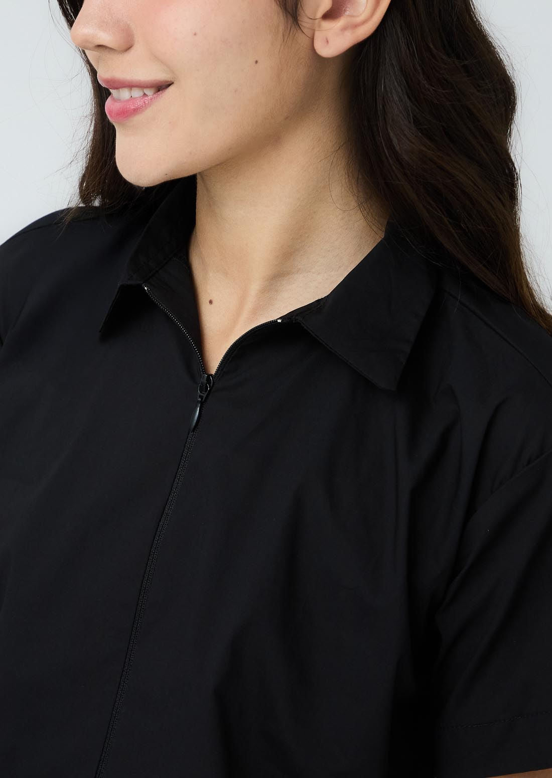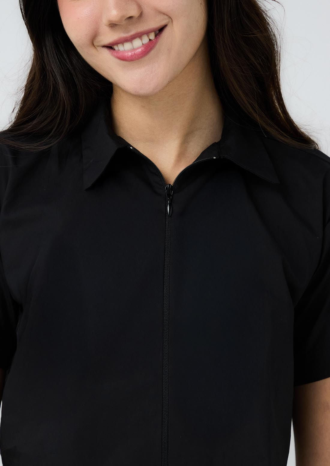 Blusa manga corta, color negro, cierre funcional en frente y fondo entero para adolescentes.