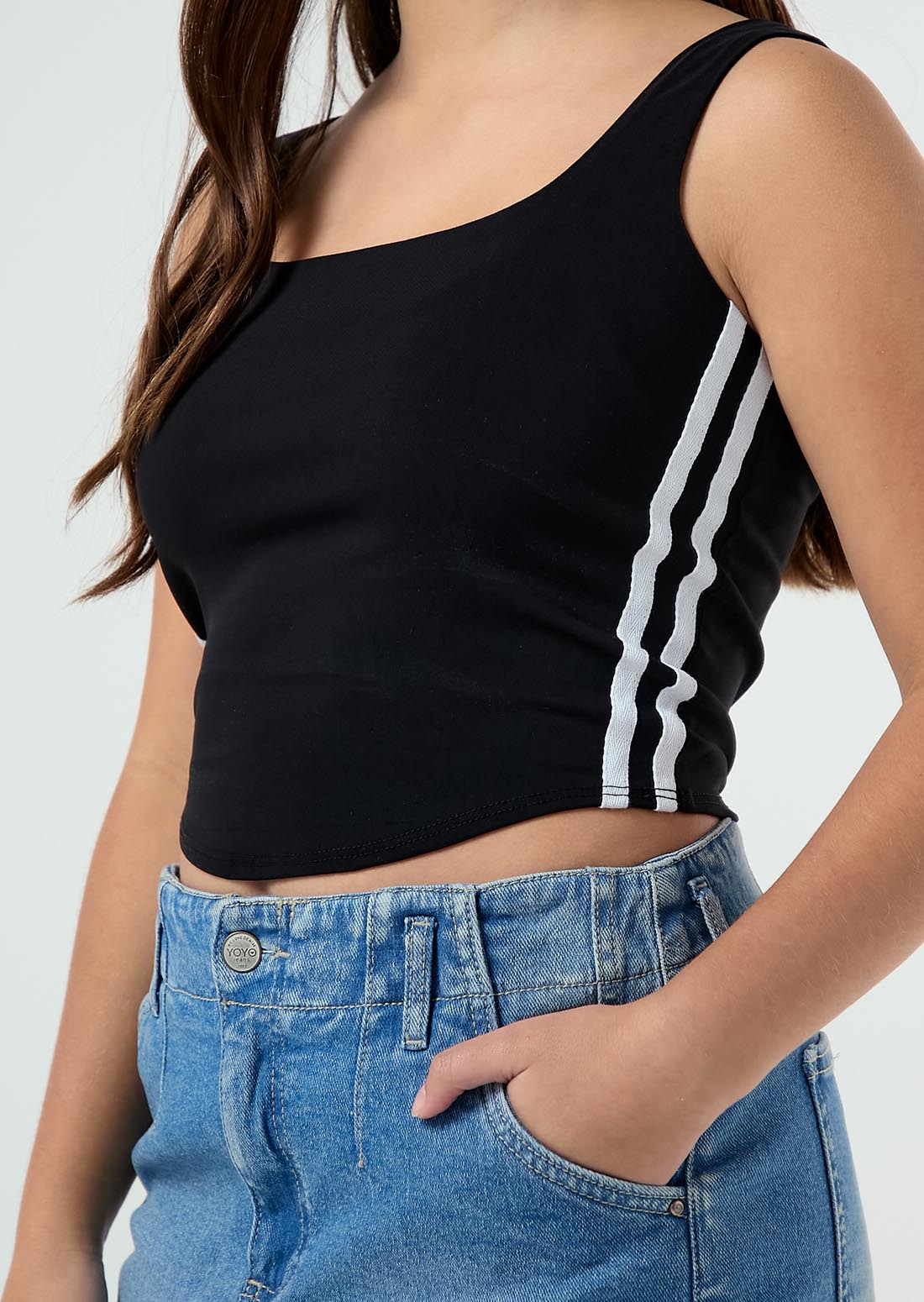 Blusa manga sisa, color negro, sesgos aéreos en costados y fondo entero para jóvenes.