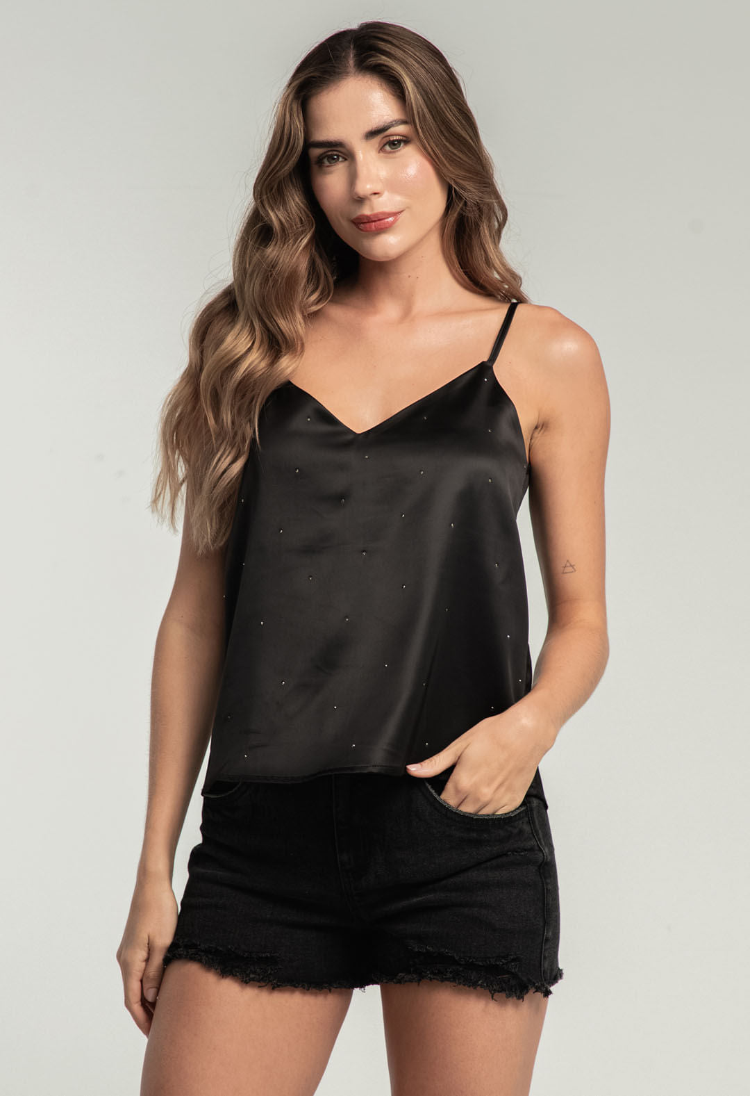 Blusa de tiras, color negro, en satín y taches para mujeres.