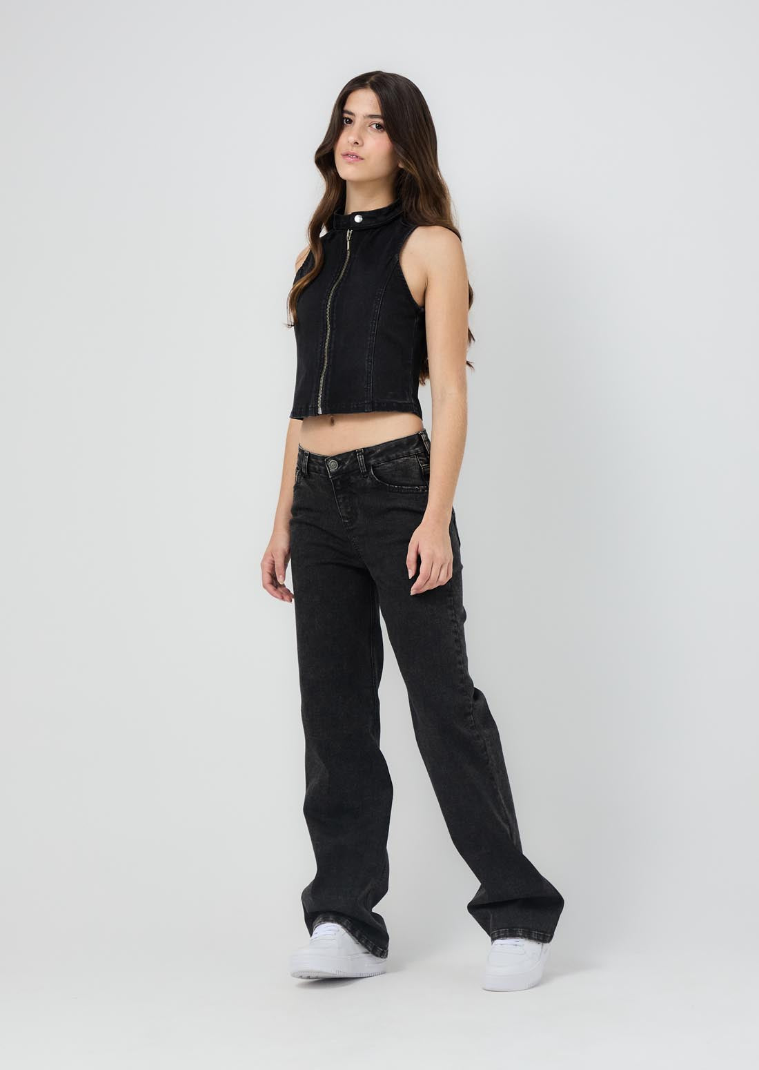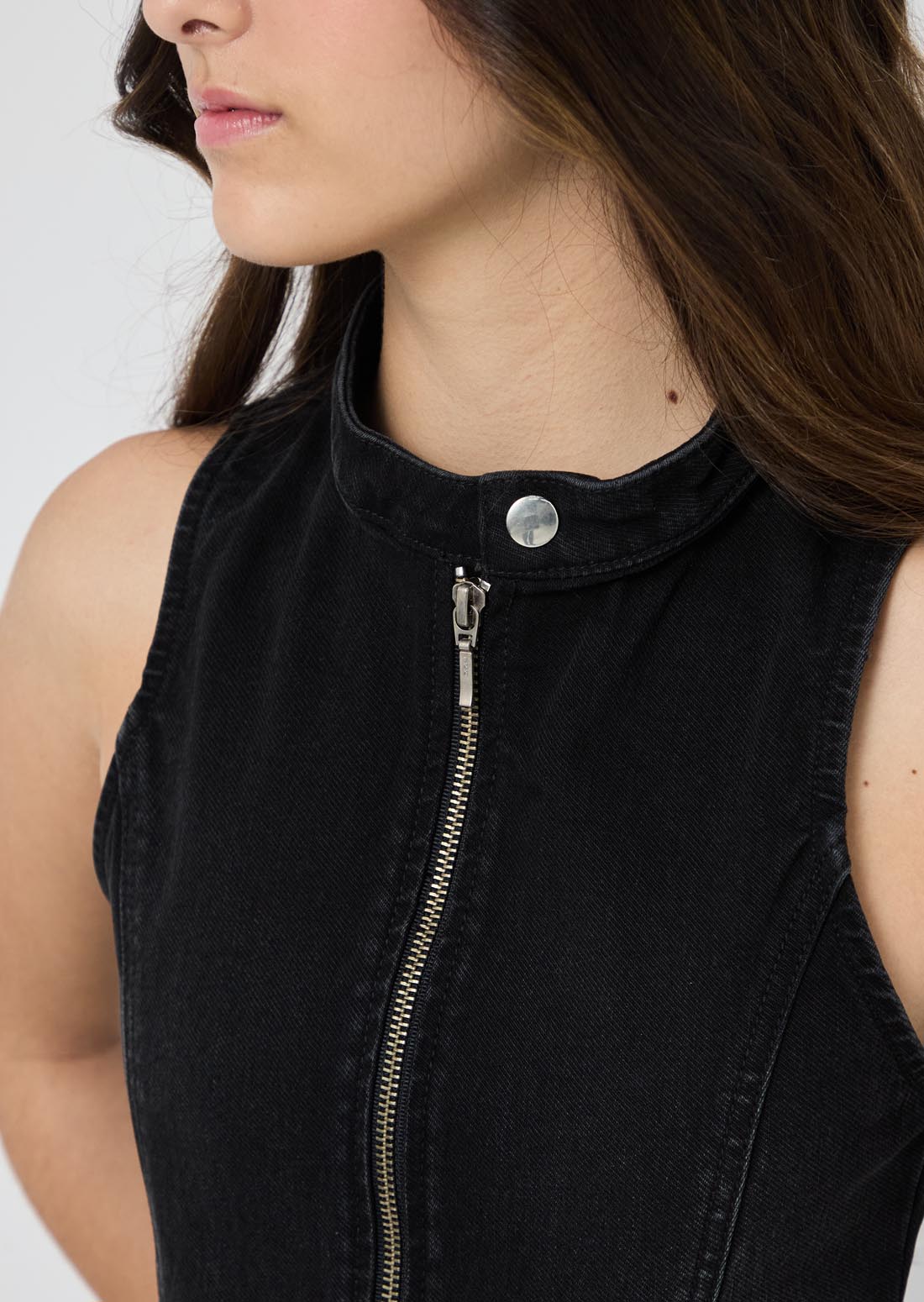 Blusa manga sisa, lavado negro, con cierre en frente, en denim y fondo entero para jóvenes.
