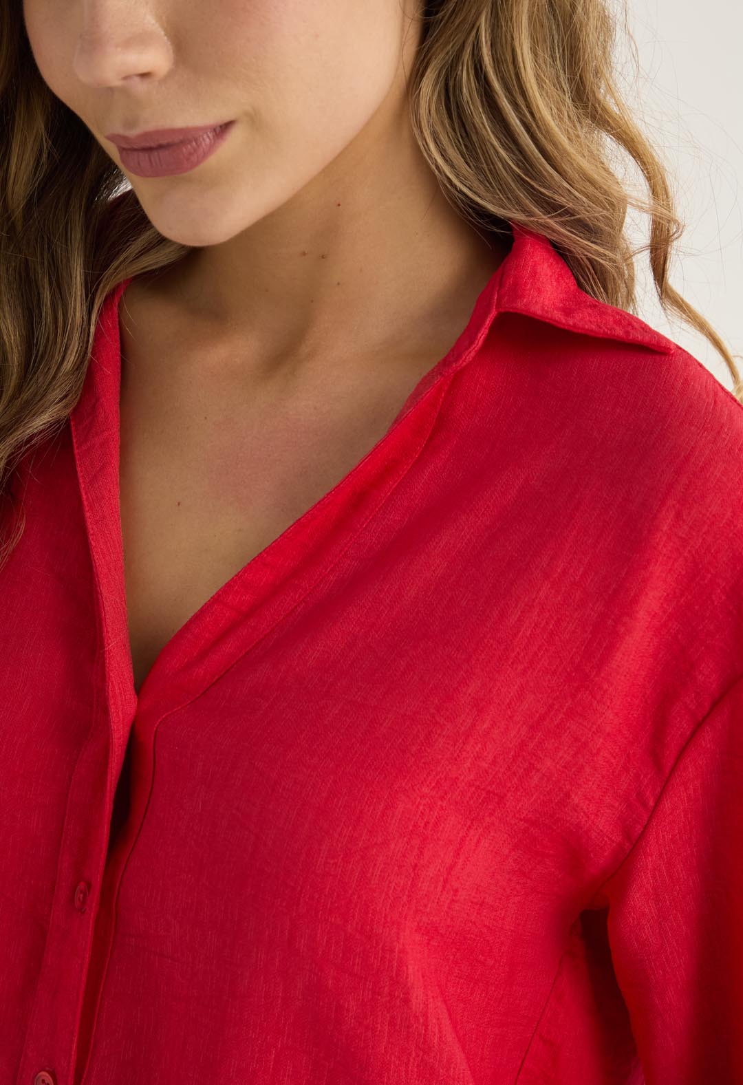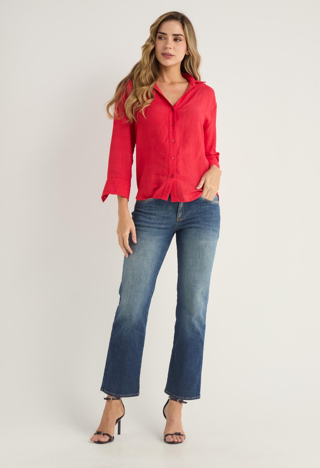 Blusa manga 3/4, color rojo, con cuello en V y fondo entero para mujer.