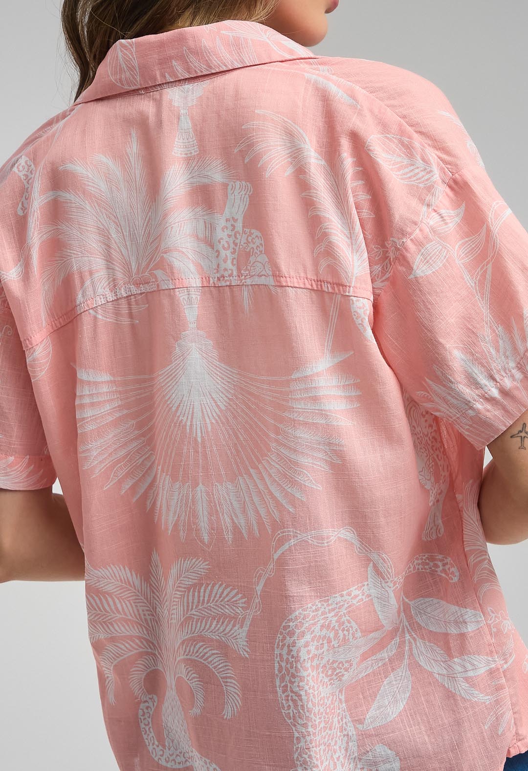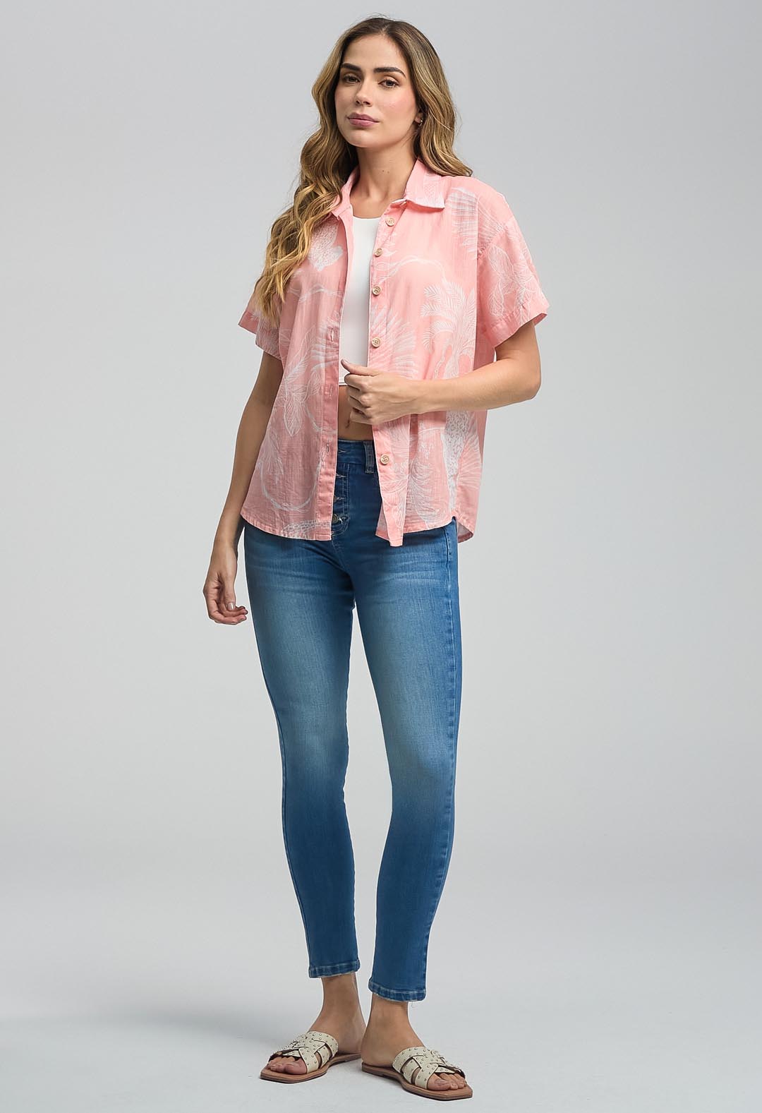 Blusa manga corta, color salmón, con perilla, botones y estampada para mujeres.