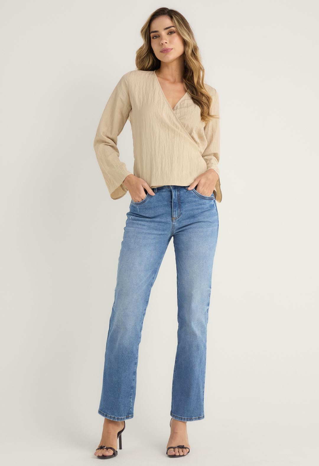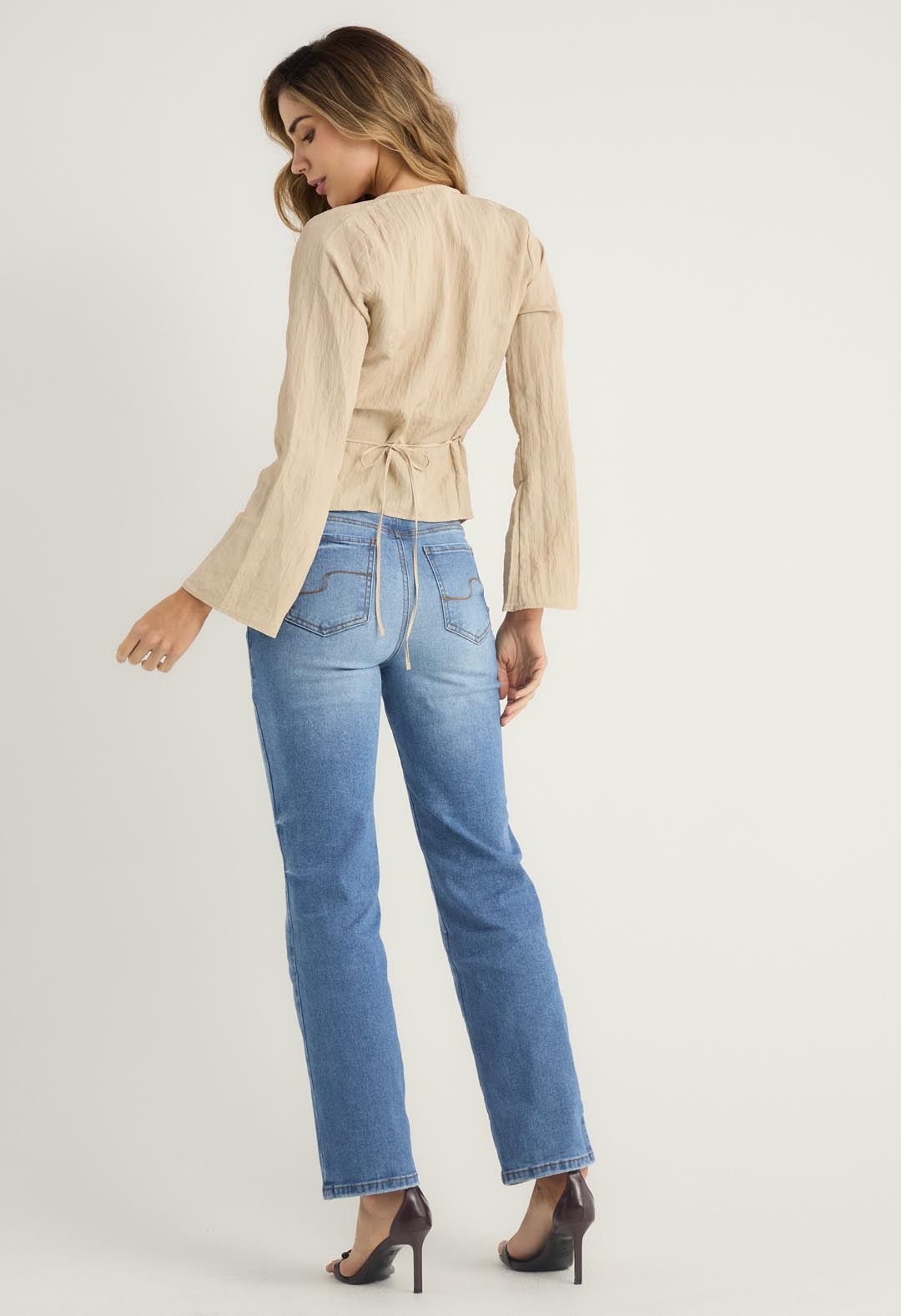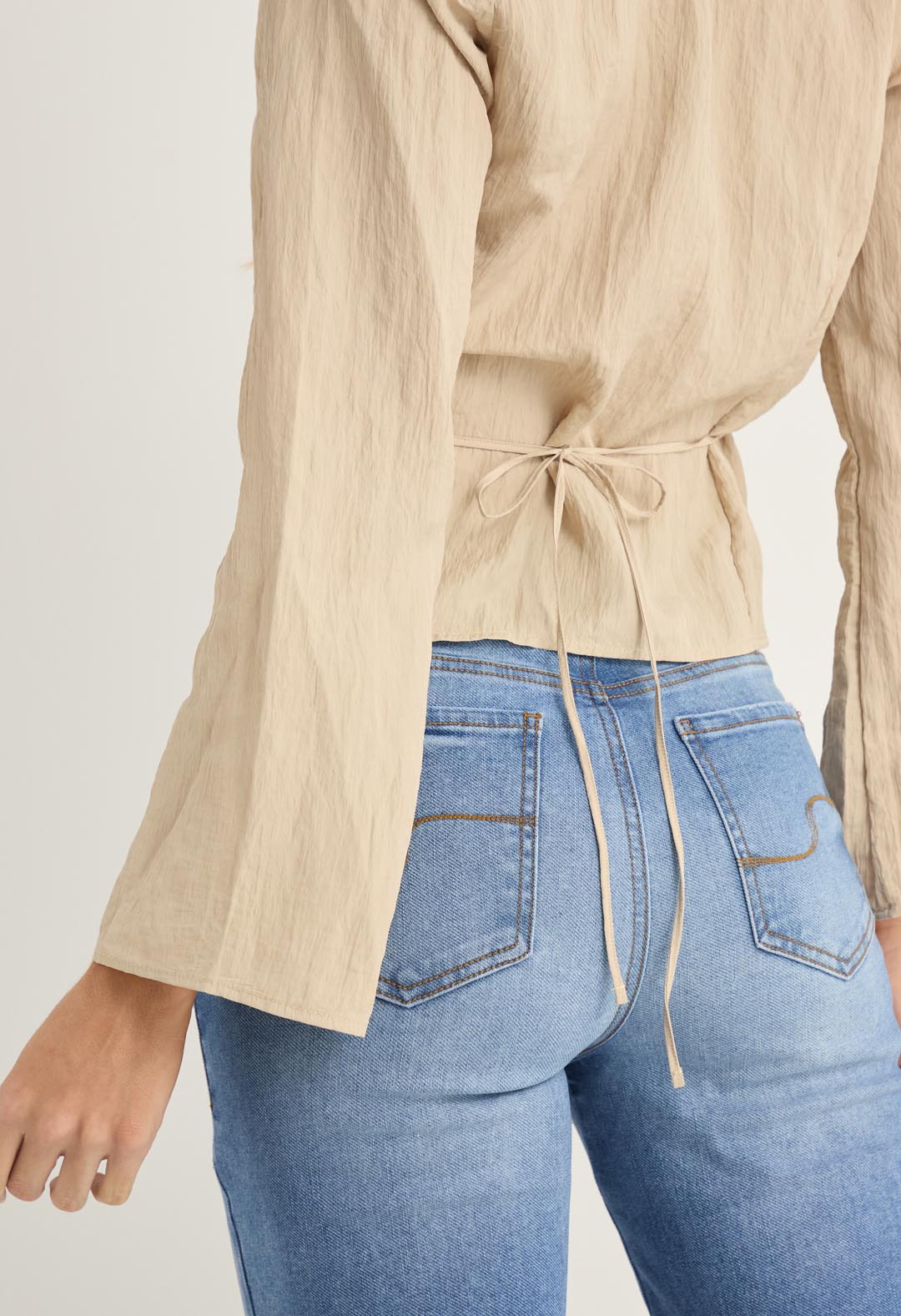 Blusa manga larga, color taupe, broche en escote, tiras para amarrar en cintura y fondo entero para mujeres.