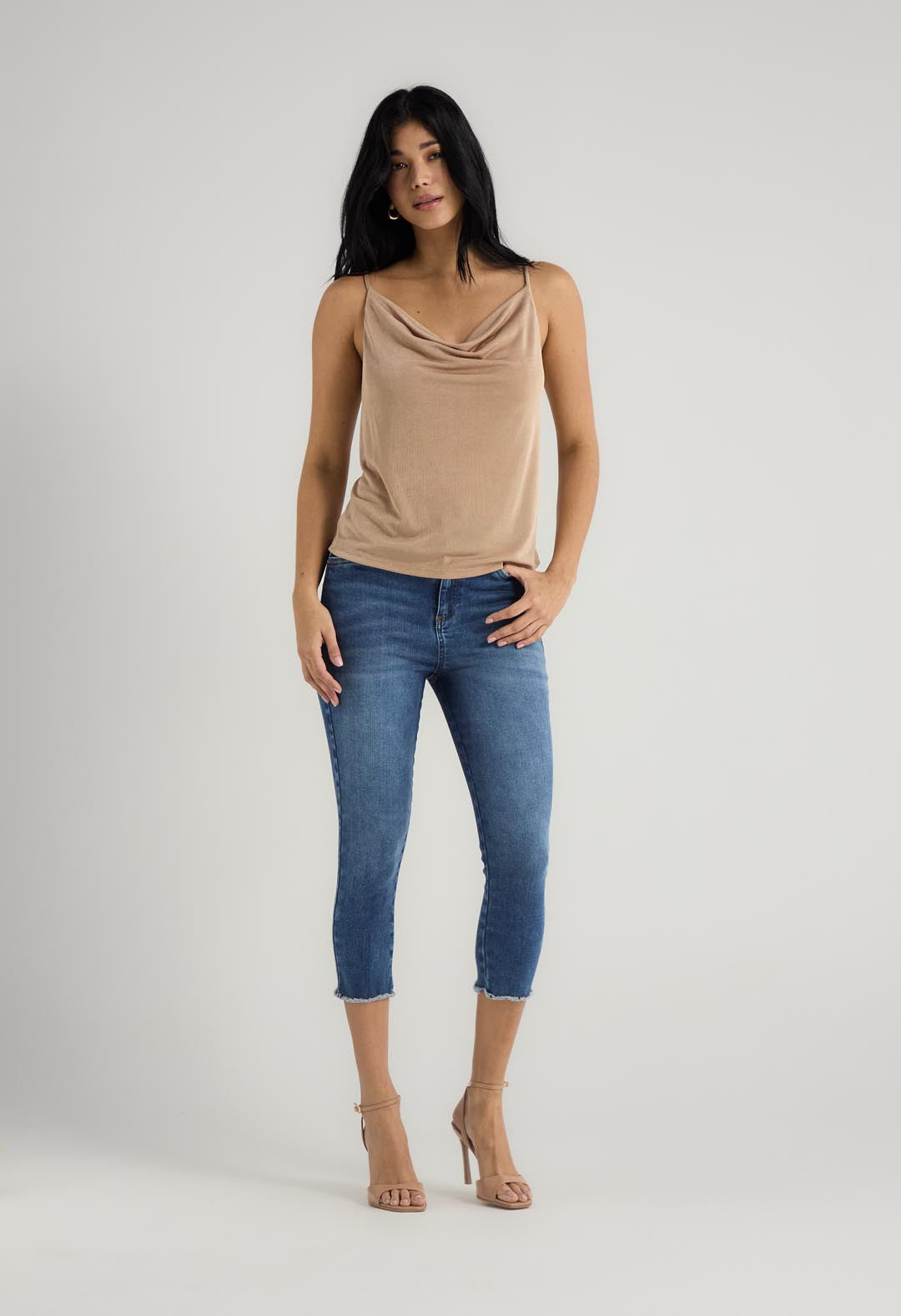Blusa de tiras, color taupe, escote drapeado y fondo entero para mujer.