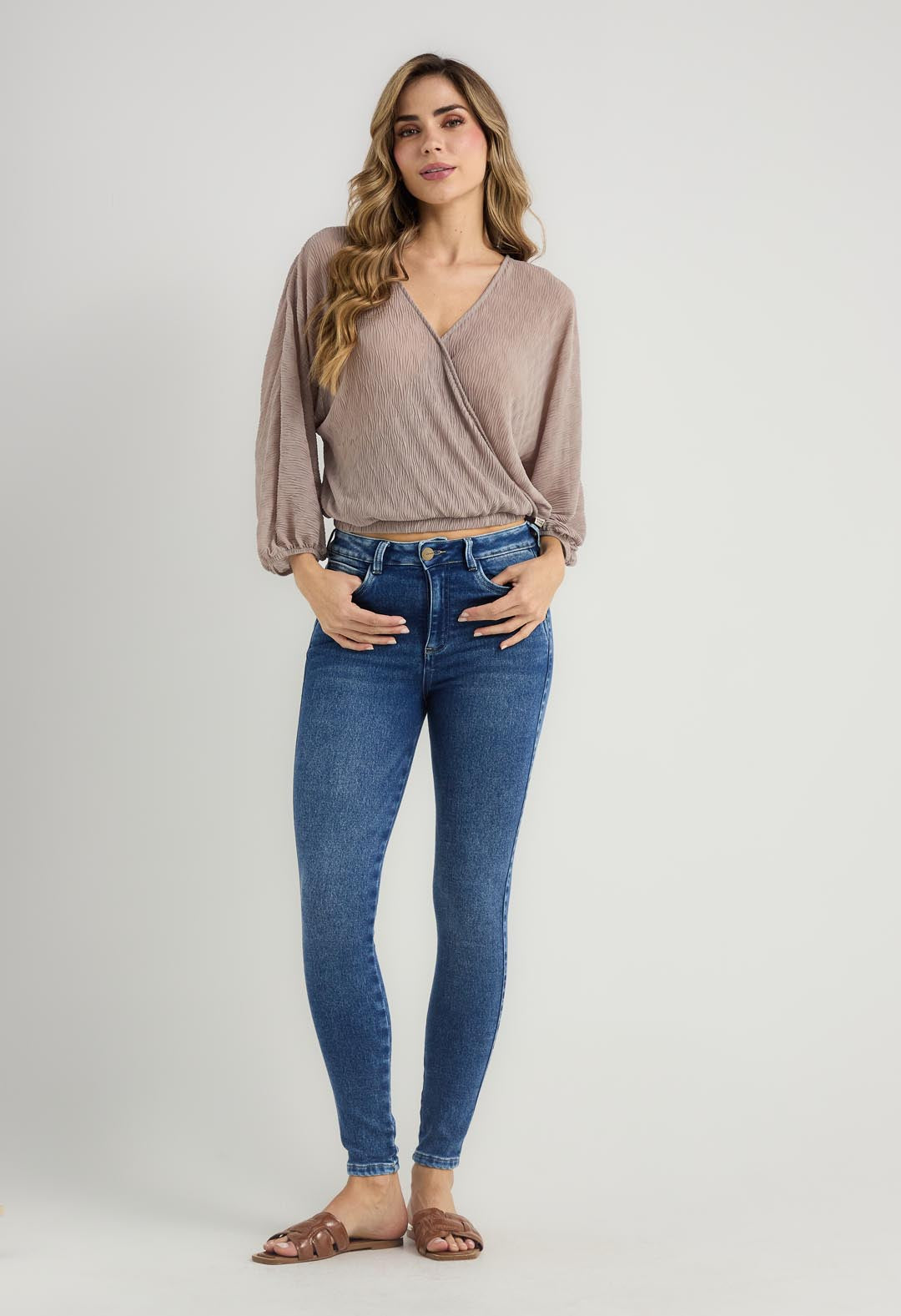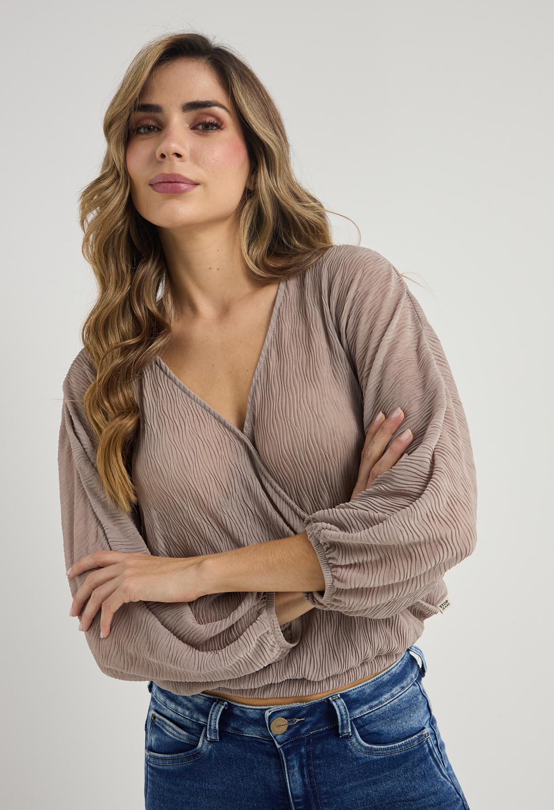 Blusa manga 3/4, color taupe, escote en V, frente cruzado y fondo entero para mujer.