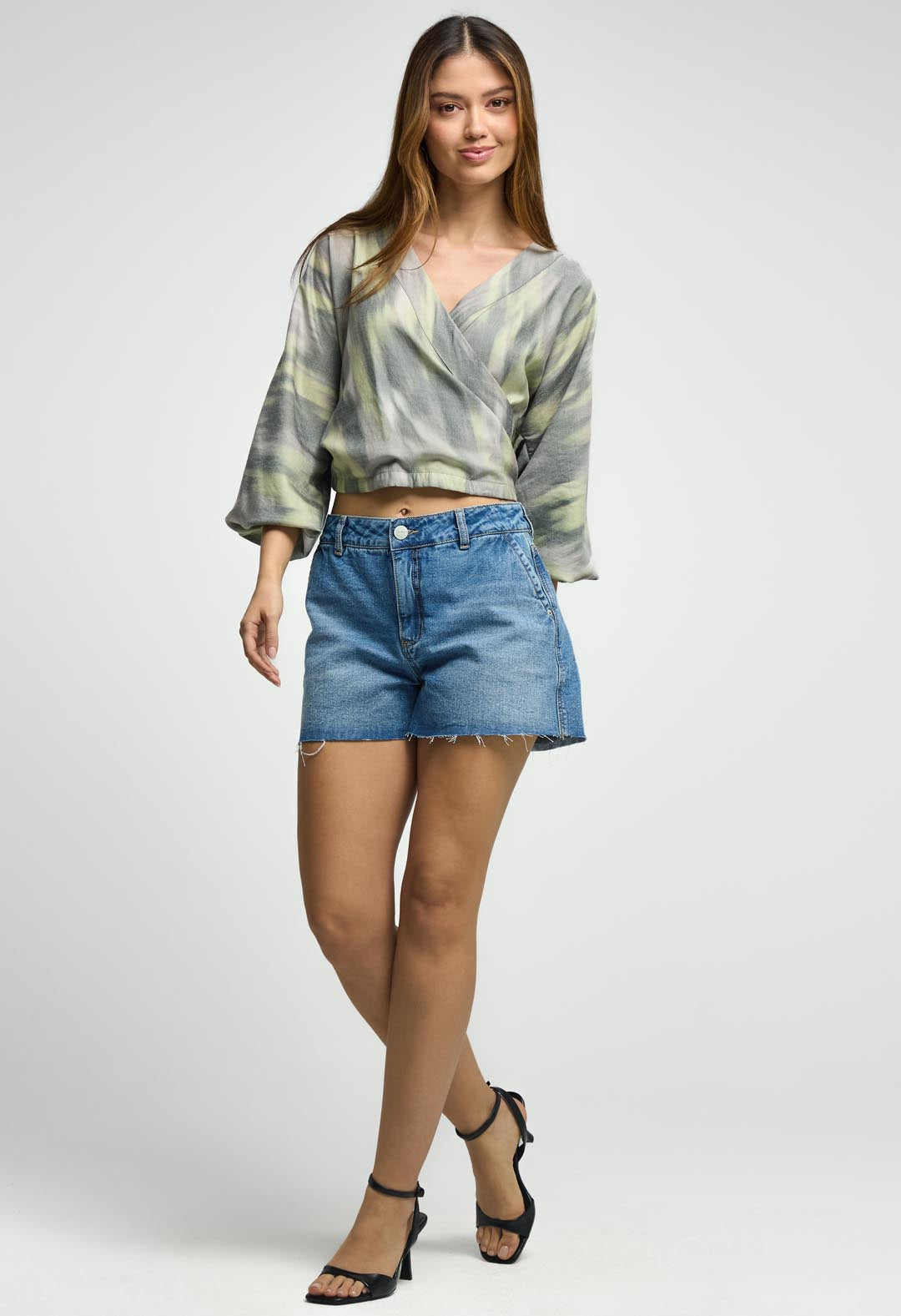 Blusa manga 3/4, color verde, con fajones cruzados y full print para mujeres.