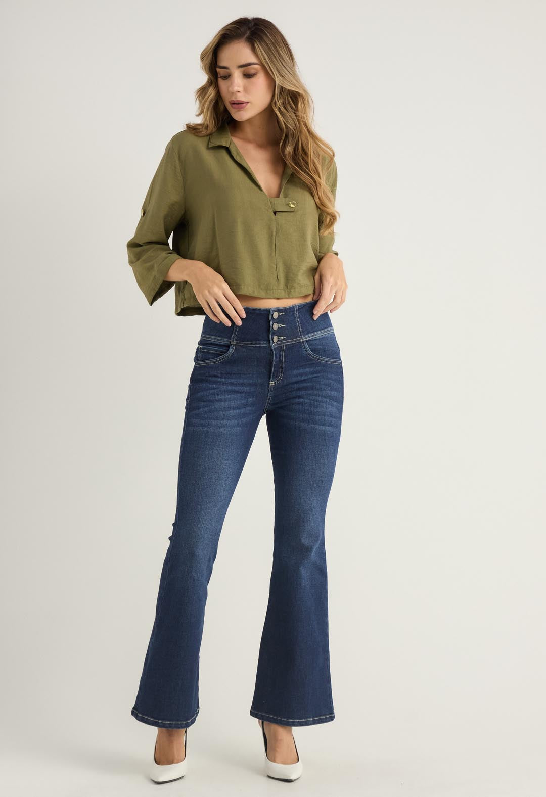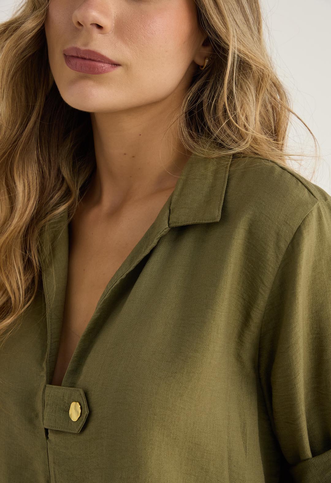 Blusa manga 3/4, color verde militar, con charretera y botones para mujer.