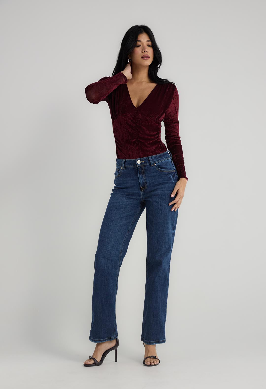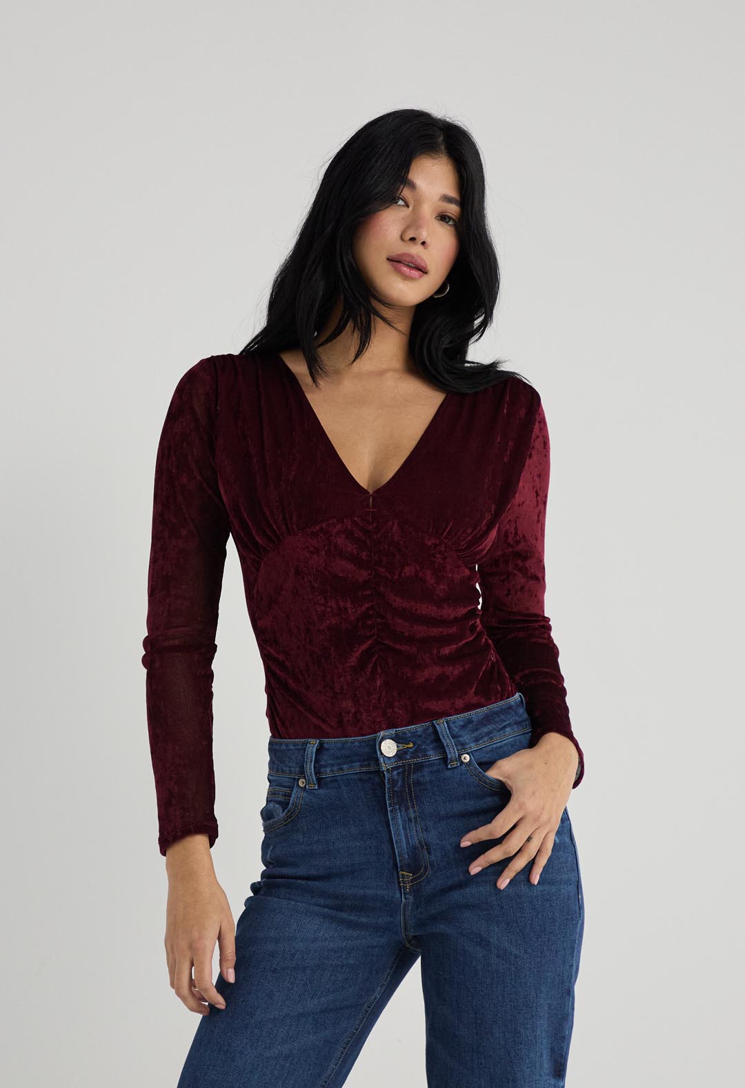 Body manga larga, color vino, escote V, recogido en frente y fondo entero para mujer.