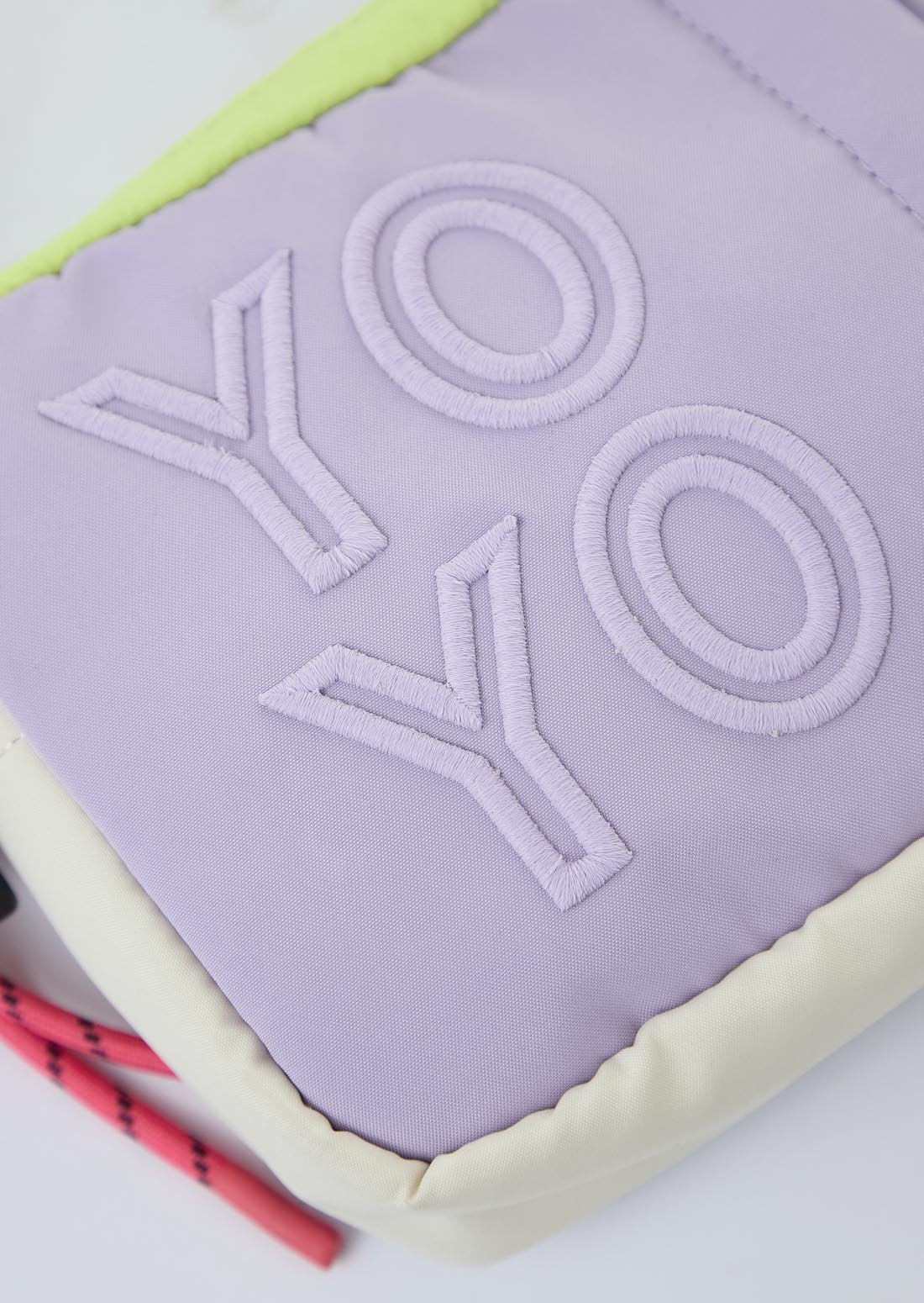 Bolso bandolera, color lila, piezas en contraste y bordado frontal.