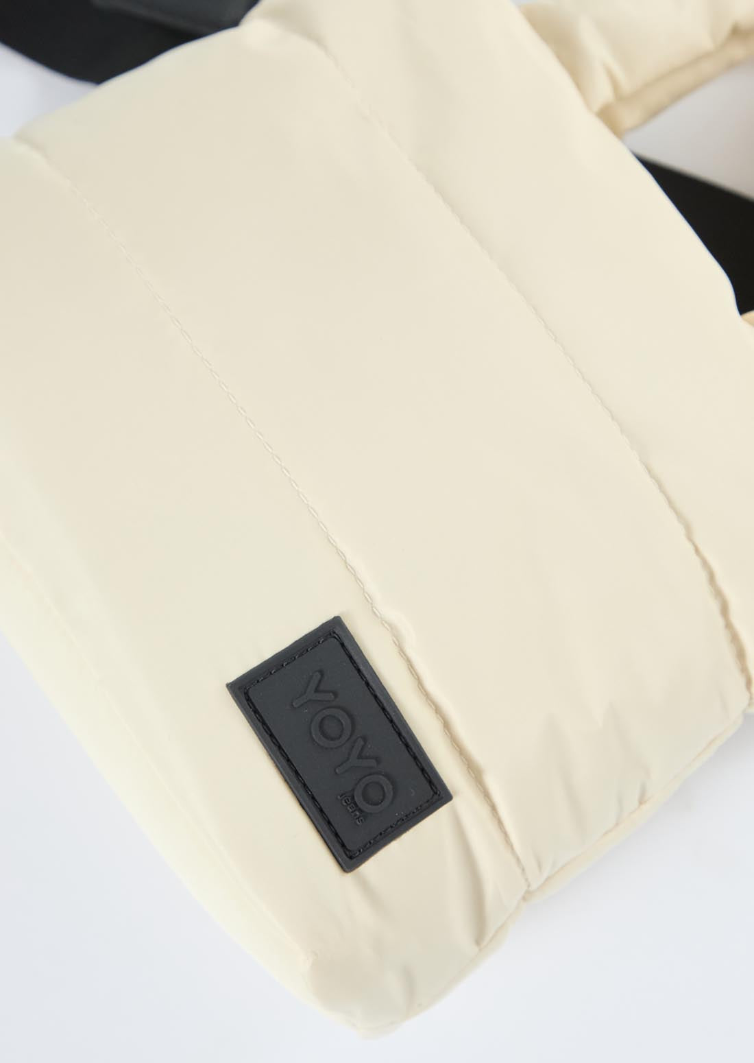 Bolso de mano, color beige, pequeño, fondo entero y acolchado.